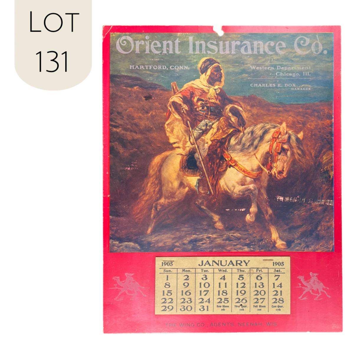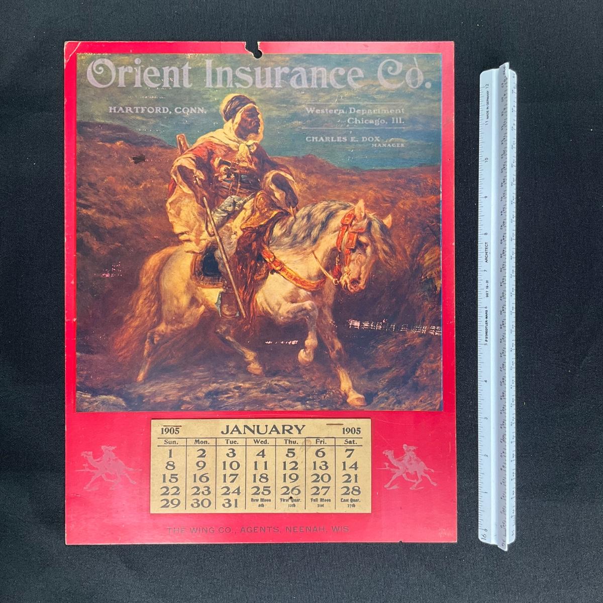 This vibrant calendar was courtesy of the Orient Insurance Company of Hartford, Connecticut. Specifically The Wing Company agents in Neenah Wisconsin. The calendar is complete, showing January 1905. The picture featured on the calendar is a Bedouin man on horseback. This calendar measures 10 5/8" x 13 3/4". **|** Please see photos for details and condition. ::: Shipping is available on this lot. If you require shipping you must let us know at the close of the auction. We will coordinate with you after the item has been won. Shipping fees will include insurance up to or exceeding the value of all items being mailed. If you have any questions regarding this lot please contact the auctioneer either via this website, by direct email or by phone. PICK UP TIMES and other important information can be found in the TERMS and DESCRIPTION of the auction. Please take a look for pertinent information. Thanks!