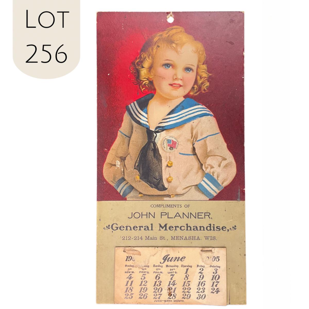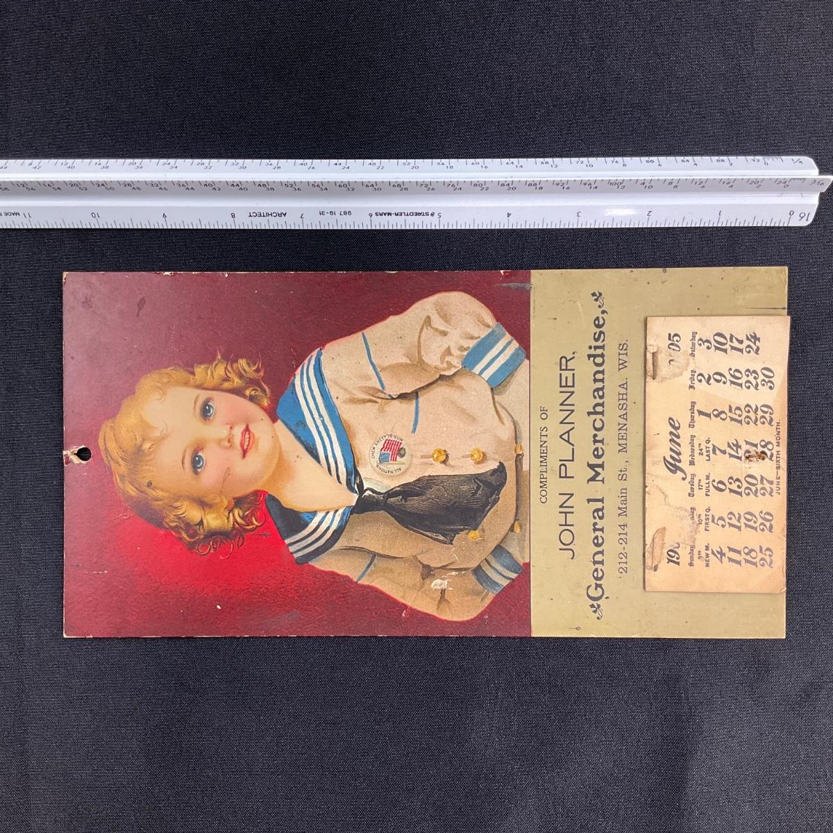This calendar was compliments of John Planner, dealer in General Merchandise in Menasha, Wisconsin. This calendar features a little girl in a sailor suit wearing the iconic button "All nations chew Sweet 16" - the gum that was introduced in the 1890s. This calendar is incomplete, showing June 1905. This calendar measures 5 3/8" x 10 1/2". **|** Please see photos for details and condition. ::: Shipping is available on this lot. If you require shipping you must let us know at the close of the auction. We will coordinate with you after the item has been won. Shipping fees will include insurance up to or exceeding the value of all items being mailed. If you have any questions regarding this lot please contact the auctioneer either via this website, by direct email or by phone. PICK UP TIMES and other important information can be found in the TERMS and DESCRIPTION of the auction. Please take a look for pertinent information. Thanks!