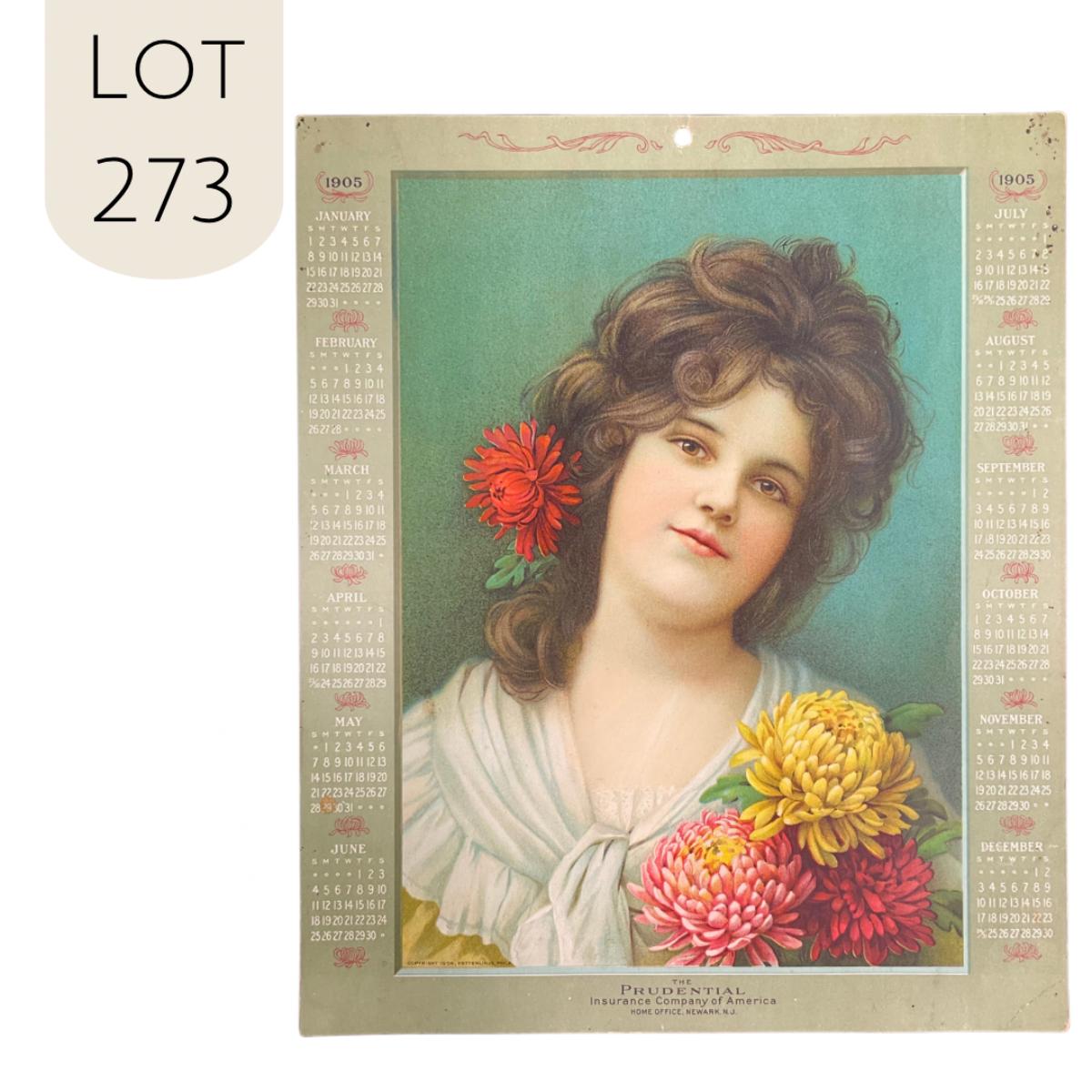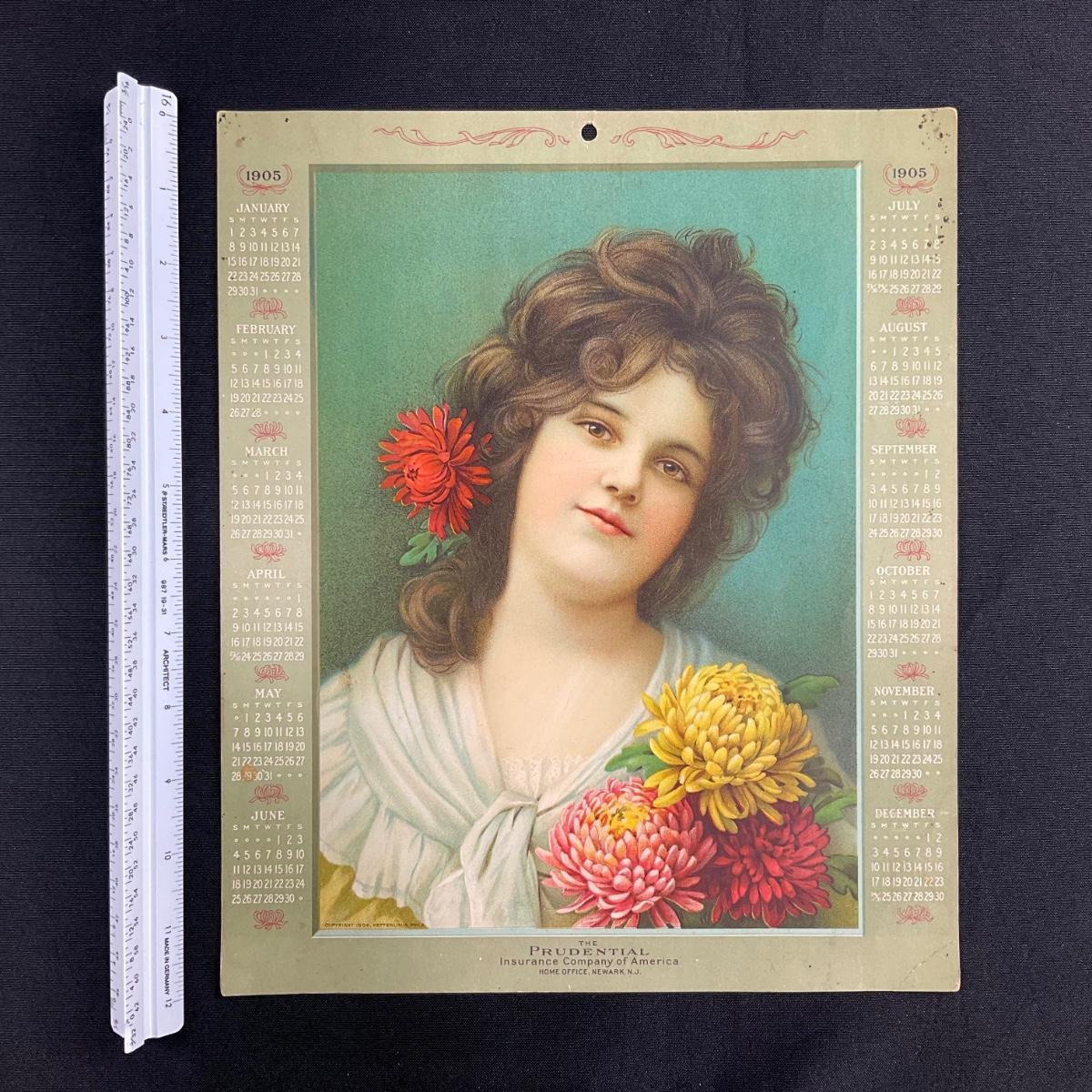 This calendar was produced to promote the Prudential Insurance Company of America, based in Newark, New Jersey. This calendar features a portrait of a young dark haired woman holding chrysanthemums, a red one in her hair. This calendar was printed by Ketterlinus of Philadelphia. This one-sheet calendar is complete. This calendar measures 10" x 13 1/2". **|** Please see photos for details and condition. ::: Shipping is available on this lot. If you require shipping you must let us know at the close of the auction. We will coordinate with you after the item has been won. Shipping fees will include insurance up to or exceeding the value of all items being mailed. If you have any questions regarding this lot please contact the auctioneer either via this website, by direct email or by phone. PICK UP TIMES and other important information can be found in the TERMS and DESCRIPTION of the auction. Please take a look for pertinent information. Thanks!