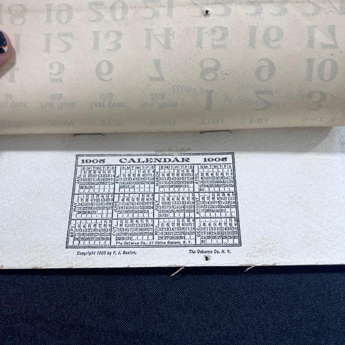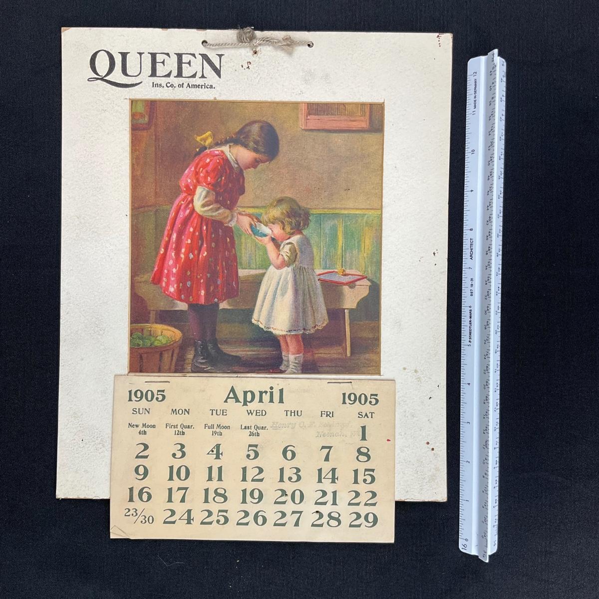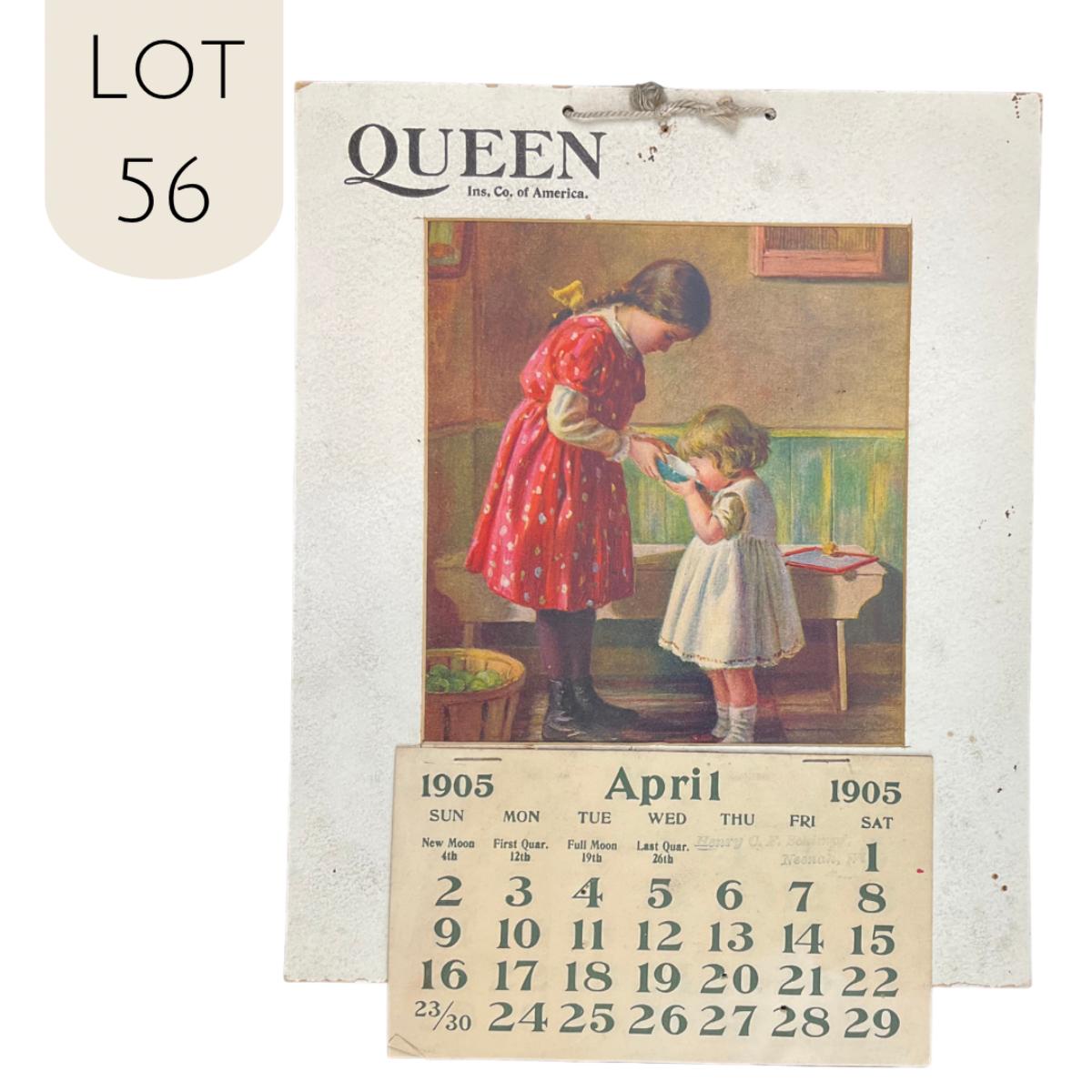 This sweet calendar, compliments of the Queen Insurance Company of America. This particular calendar was given out by Henry C F Schimpf of Neenah Wisconsin, a local agent. The calendar features a picture of an older girl helping a younger girl in a drink in a bit of a farm house setting. The picture is accredited to the painting of F J Boston. This calendar is copyright 1903 by FJ Boston, and was published by The Osbourne Company of New York. This calendar is incomplete, showing April 1905. This calendar measures 10" x 12". **|** Please see photos for details and condition. ::: Shipping is available on this lot. If you require shipping you must let us know at the close of the auction. We will coordinate with you after the item has been won. Shipping fees will include insurance up to or exceeding the value of all items being mailed. If you have any questions regarding this lot please contact the auctioneer either via this website, by direct email or by phone. PICK UP TIMES and other important information can be found in the TERMS and DESCRIPTION of the auction. Please take a look for pertinent information. Thanks!