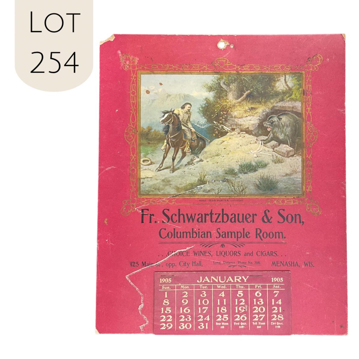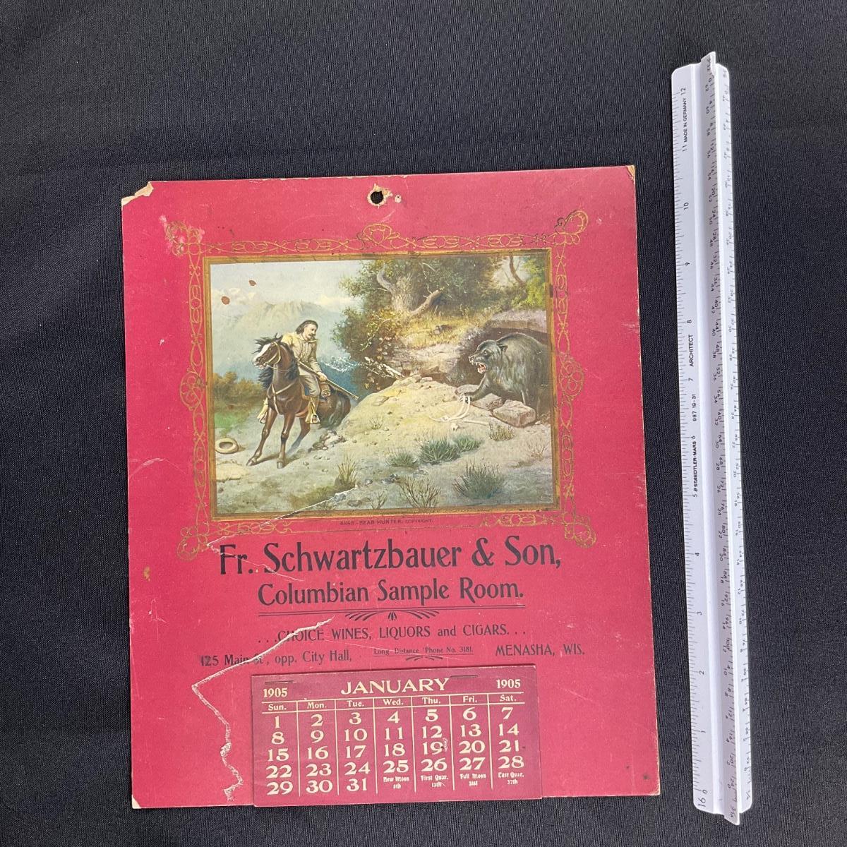 This calendar was compliments of Fr. Schwartzbauer and Son of the Columbia Sample room, dealers in Wines, Liquors and Cigars, located in Menasha, Wisconsin. This calendar features a picture titled "Bear Hunter" of a man with a gun on a horse cornering a bear in a cave. This calendar is complete, showing January 1905. This calendar measures 9" x 10 7/8". **|** Please see photos for details and condition. ::: Shipping is available on this lot. If you require shipping you must let us know at the close of the auction. We will coordinate with you after the item has been won. Shipping fees will include insurance up to or exceeding the value of all items being mailed. If you have any questions regarding this lot please contact the auctioneer either via this website, by direct email or by phone. PICK UP TIMES and other important information can be found in the TERMS and DESCRIPTION of the auction. Please take a look for pertinent information. Thanks!