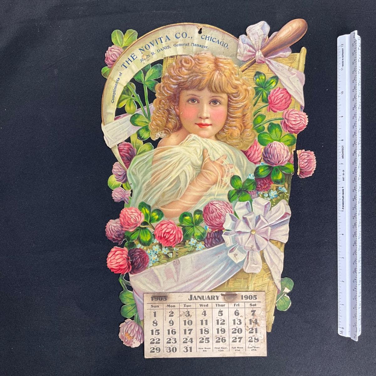 This calendar was compliments of the Novita Company in Chicago Illinois. John B Danis, General Manager. This Die-Cut calendar features a young girl in a sheer dress with a border of clover. This calendar measures 9 1/2" x 14 1/2". This calendar is complete, showing January 1905. There is one flower that *could* be attached on the right side. **|** Please see photos for details and condition. ::: Shipping is available on this lot. If you require shipping you must let us know at the close of the auction. We will coordinate with you after the item has been won. Shipping fees will include insurance up to or exceeding the value of all items being mailed. If you have any questions regarding this lot please contact the auctioneer either via this website, by direct email or by phone. PICK UP TIMES and other important information can be found in the TERMS and DESCRIPTION of the auction. Please take a look for pertinent information. Thanks!