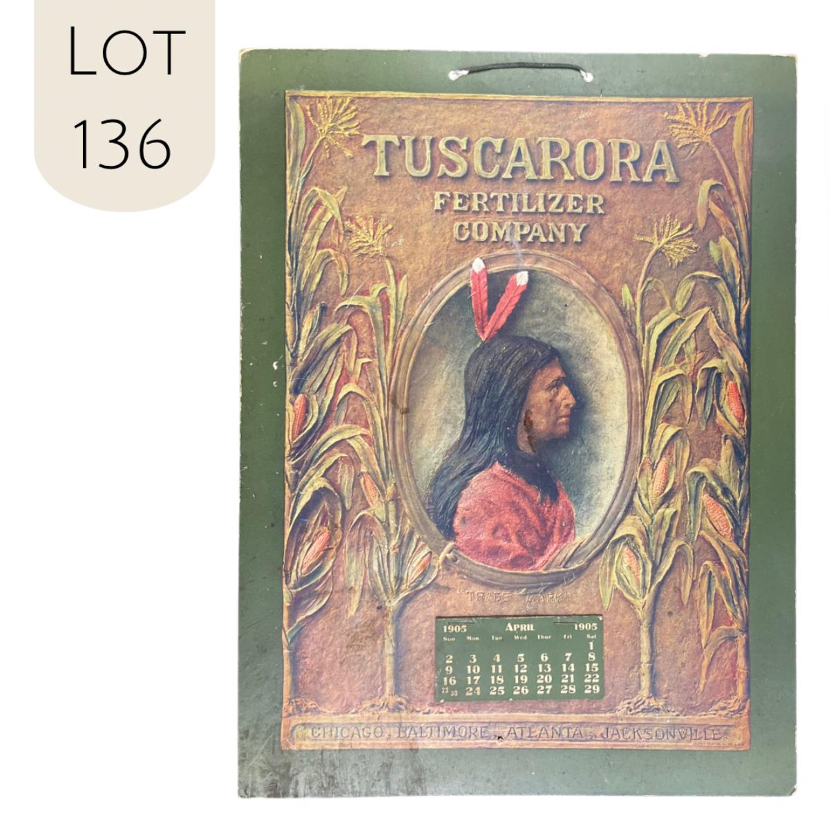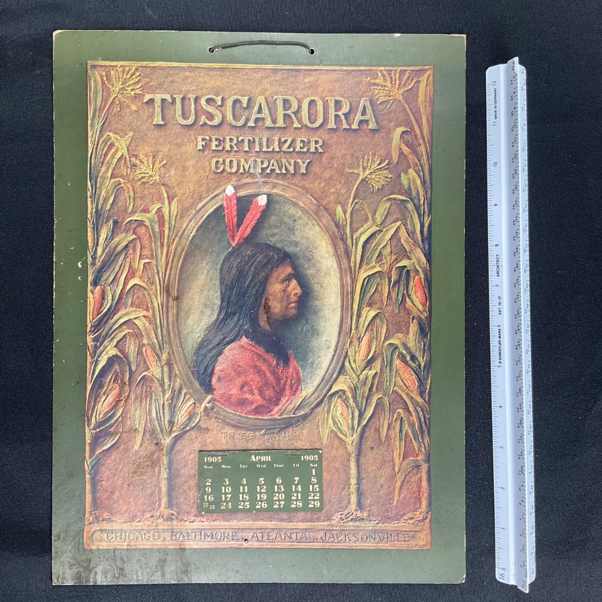 This calendar was compliments of the Tuscarora Fertilizer Company, with branches in Chicago, Baltimore, Atlanta and Jacksonville. The calendar features a picture of a Native American in profile, with a corn stalk border. The calendar was published by the American Colortype Company. The calendar is incomplete, showing April 1905. The calendar measures 10 1/4" x 13 1/2". **|** Please see photos for details and condition. ::: Shipping is available on this lot. If you require shipping you must let us know at the close of the auction. We will coordinate with you after the item has been won. Shipping fees will include insurance up to or exceeding the value of all items being mailed. If you have any questions regarding this lot please contact the auctioneer either via this website, by direct email or by phone. PICK UP TIMES and other important information can be found in the TERMS and DESCRIPTION of the auction. Please take a look for pertinent information. Thanks!