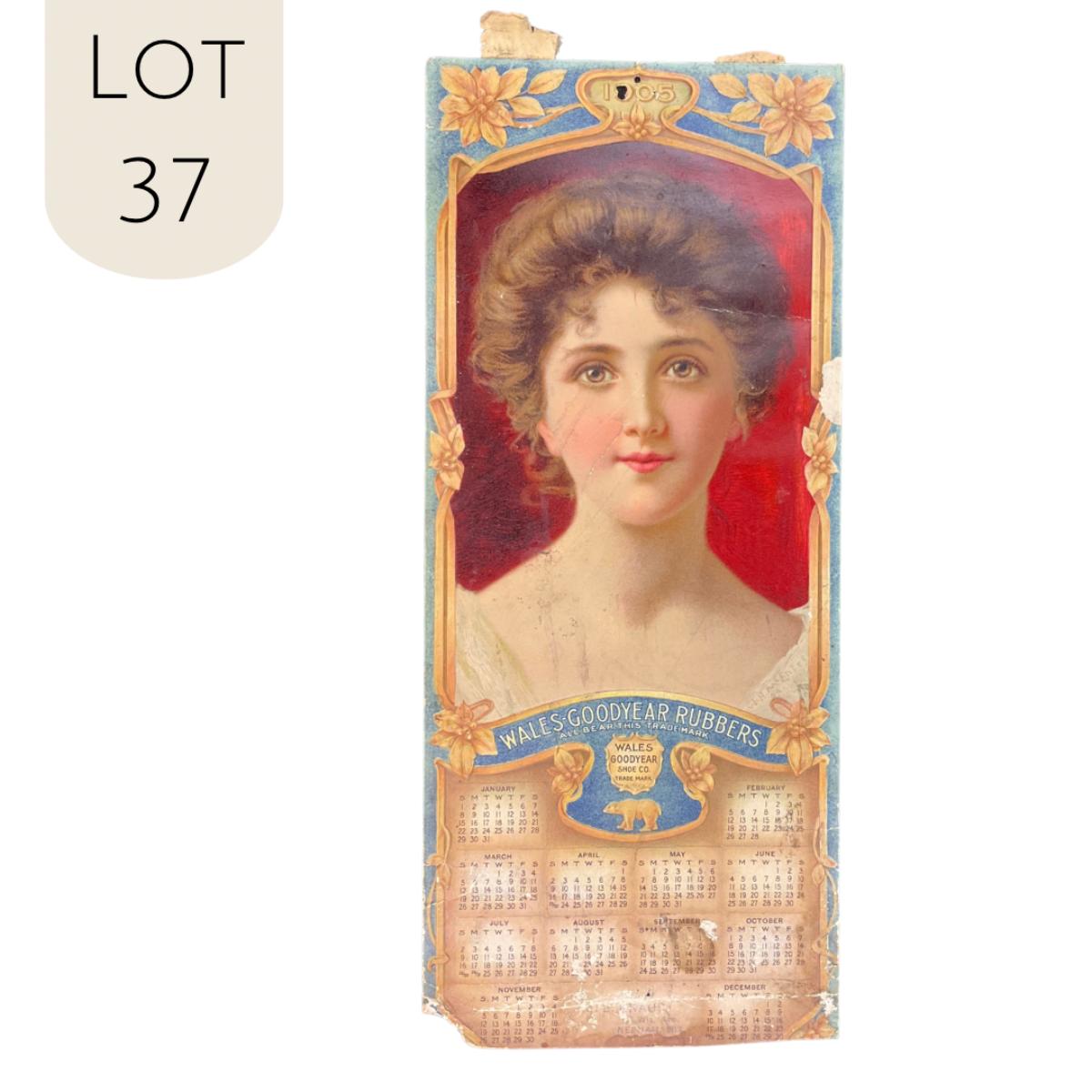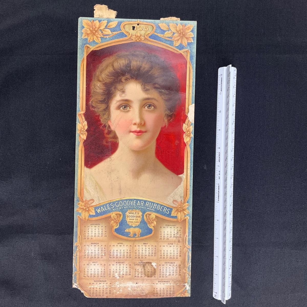 This full-color calendar promotes the Wales-Goodyear Rubbers and features a portrait of a dark haired woman with a small smile. The original by W H McEntee. The edges are a bit worn, and there is a crease across the bottom, obscuring the proprietor's name, A E Kraus of Neenah, Wisconsin. This calendar is copyright 1904 by the Goodyear and Wales Rubber Shoe Co. It was printed by the American Lithographic Company of New York. This calendar measures 6 1/2" x 16". **|** Please see photos for details and condition. ::: Shipping is available on this lot. If you require shipping you must let us know at the close of the auction. We will coordinate with you after the item has been won. Shipping fees will include insurance up to or exceeding the value of all items being mailed. If you have any questions regarding this lot please contact the auctioneer either via this website, by direct email or by phone. PICK UP TIMES and other important information can be found in the TERMS and DESCRIPTION of the auction. Please take a look for pertinent information. Thanks!