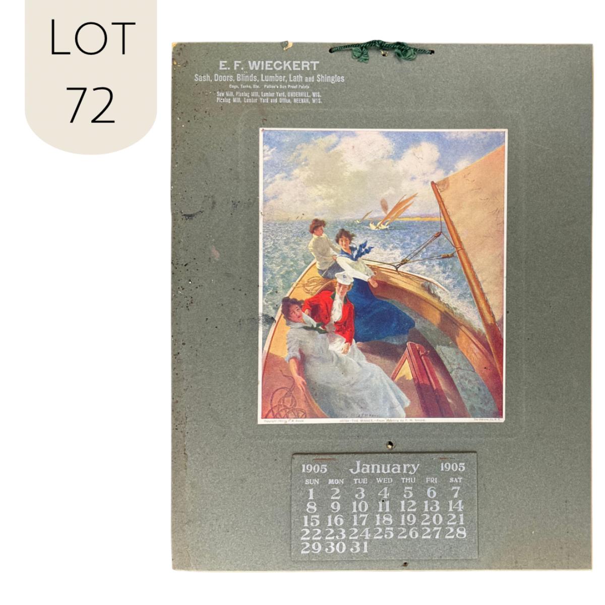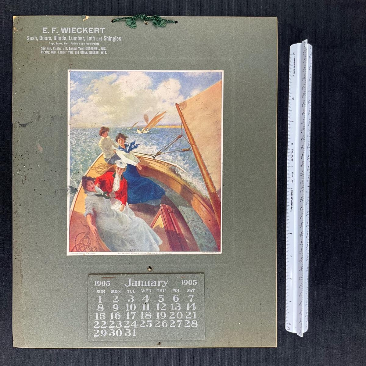 This calendar was compliments of E F Wieckert, seller of Sash, Doors, Blinds, Lumber, Lath and Shingles. This calendar is complete, showing January 1905. The calendar features a picture titled "The Winner", original painting by F M Arnold, copyright 1903. The picture depicts a group of women sailing in a boat in daytime rough seas. The calendar measures 11 3/4" x 14 5/8". **|** Please see photos for details and condition. ::: Shipping is available on this lot. If you require shipping you must let us know at the close of the auction. We will coordinate with you after the item has been won. Shipping fees will include insurance up to or exceeding the value of all items being mailed. If you have any questions regarding this lot please contact the auctioneer either via this website, by direct email or by phone. PICK UP TIMES and other important information can be found in the TERMS and DESCRIPTION of the auction. Please take a look for pertinent information. Thanks!