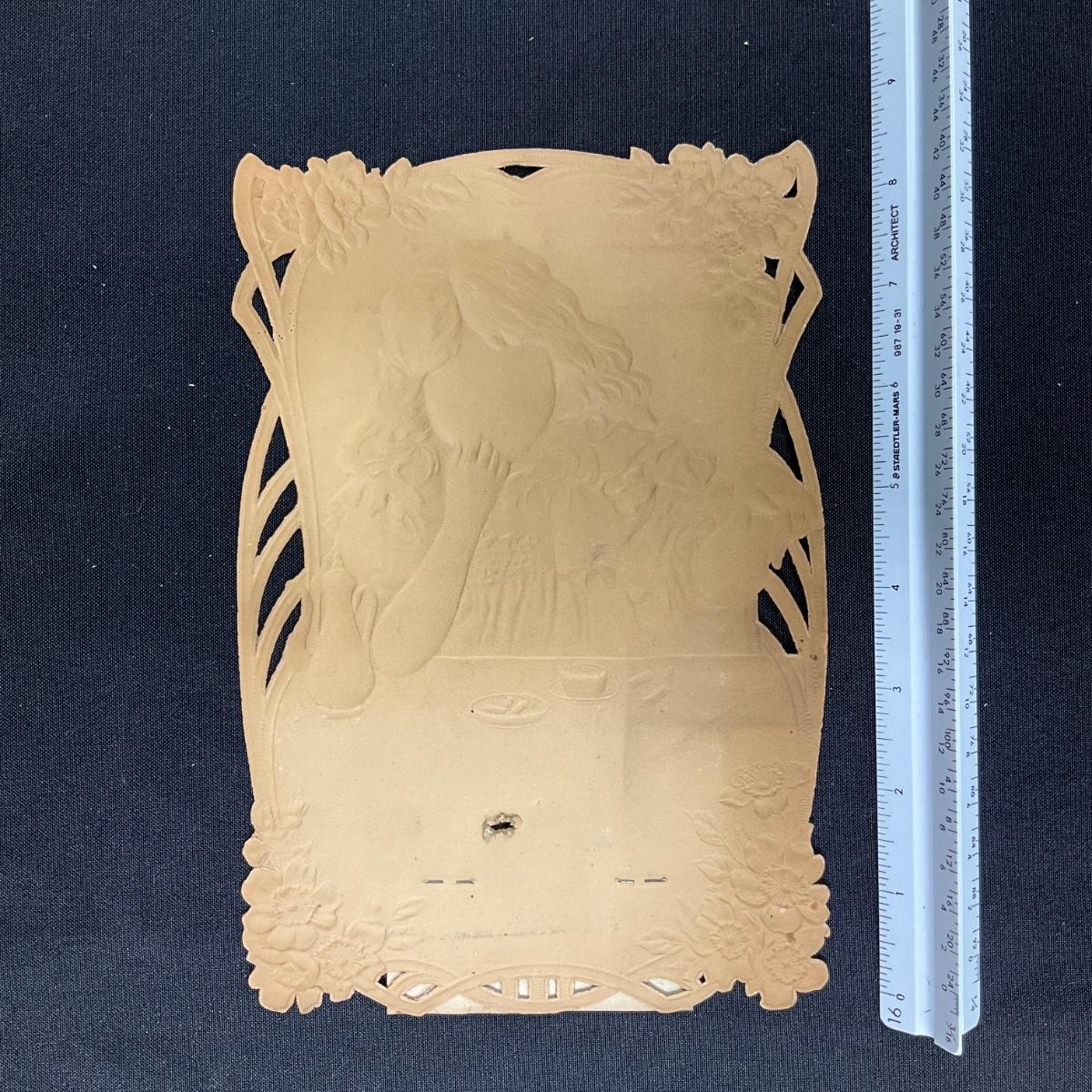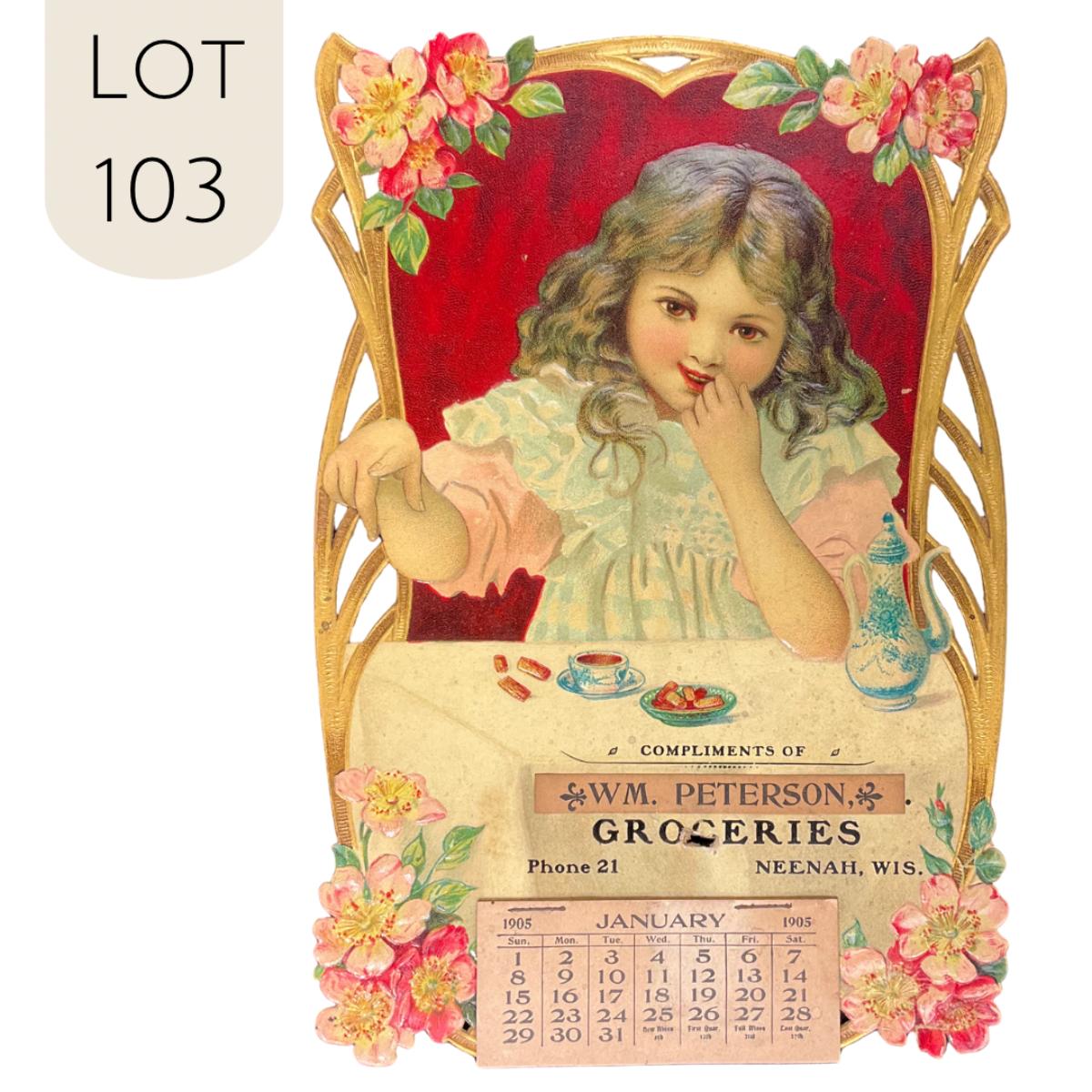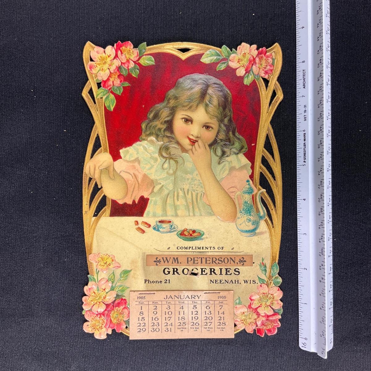 This calendar was compliments of WM Peter's Groceries in Neenah Wisconsin. Their phone number was 21! This die-cut calendar features a little girl having tea and biscuits in a fancy chair; flowers on each corner. The calendar is complete, showing January 1905. This calendar measures 5 7/8" x 8 5/8". **|** Please see photos for details and condition. ::: Shipping is available on this lot. If you require shipping you must let us know at the close of the auction. We will coordinate with you after the item has been won. Shipping fees will include insurance up to or exceeding the value of all items being mailed. If you have any questions regarding this lot please contact the auctioneer either via this website, by direct email or by phone. PICK UP TIMES and other important information can be found in the TERMS and DESCRIPTION of the auction. Please take a look for pertinent information. Thanks!