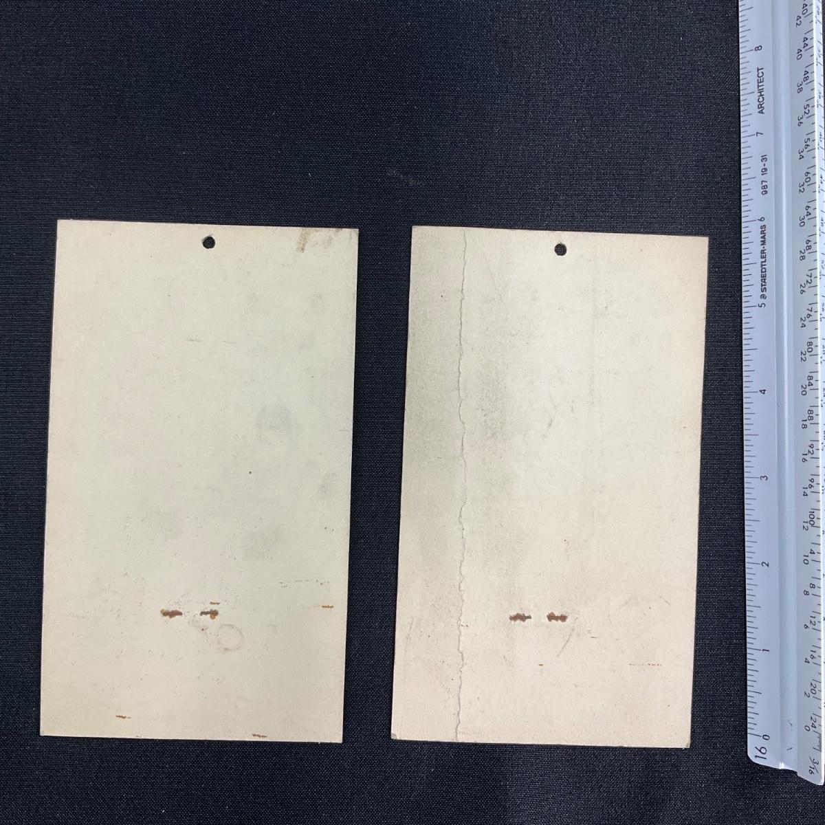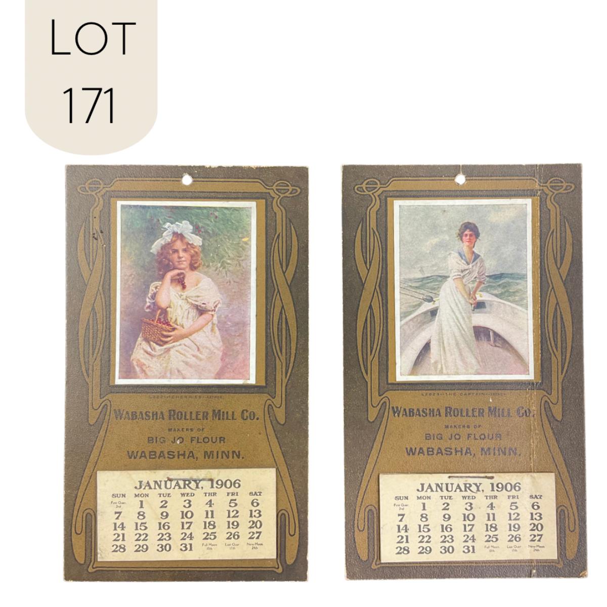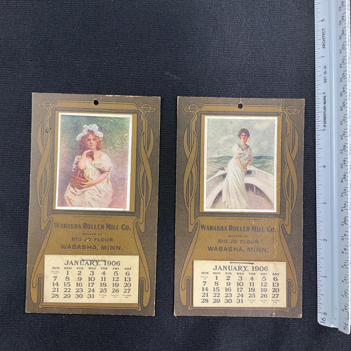 These two small calendars are both from the Big Jo Flour company, located in Wabasha, Minnesota. These two calendars are both complete, showing January 1906. The calendar on the left features a picture titled "Cherries" depicting a young girl with a cherry basket. The other calendar, on the right, features a picture titled "The Captain" depicting a young woman steering a sailboat. Both paintings are credited to James Arthur. These calendars are the same size, measuring at 3 1/2" x 6 1/4". **|** Please see photos for details and condition. ::: Shipping is available on this lot. If you require shipping you must let us know at the close of the auction. We will coordinate with you after the item has been won. Shipping fees will include insurance up to or exceeding the value of all items being mailed. If you have any questions regarding this lot please contact the auctioneer either via this website, by direct email or by phone. PICK UP TIMES and other important information can be found in the TERMS and DESCRIPTION of the auction. Please take a look for pertinent information. Thanks!