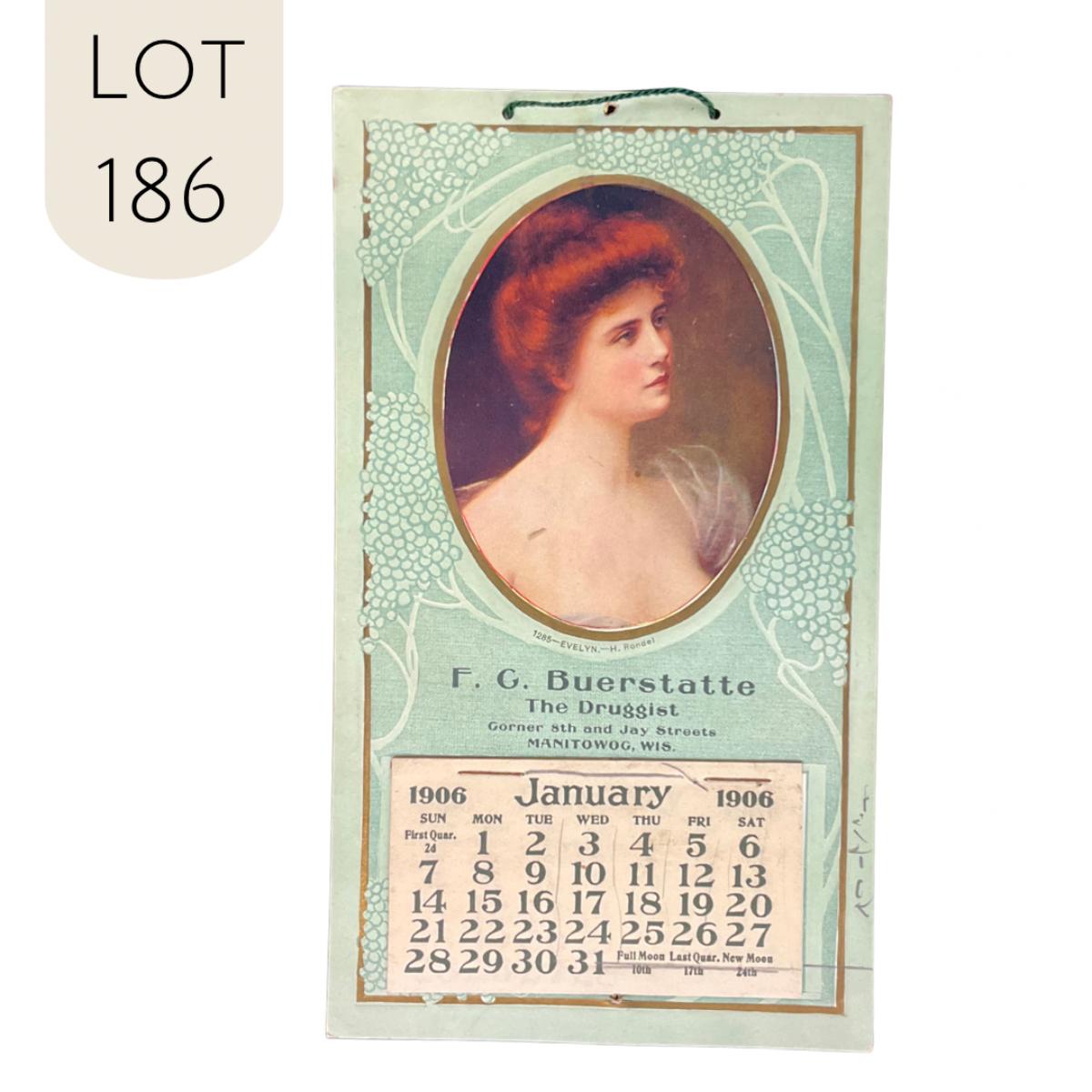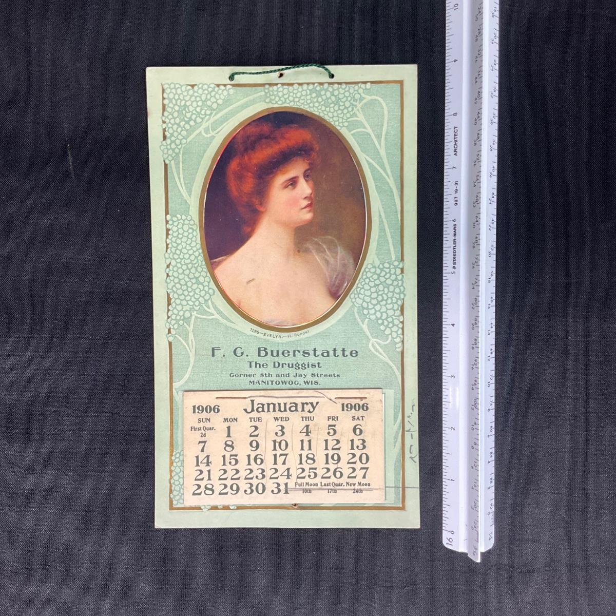 This calendar was produced by The Osbourne Company of New York. It promotes F G Buerstatte, the Druggist on the corner of 8th and Jay Street in Manitowoc. This calendar features a portrait of a young red haired woman, titled "Evelyn", original by H Rondel, copyright 1903, J W Crane. This calendar is complete, showing January 1906. This calendar measures 5 1/8" x 8 7/8". **|** Please see photos for details and condition. ::: Shipping is available on this lot. If you require shipping you must let us know at the close of the auction. We will coordinate with you after the item has been won. Shipping fees will include insurance up to or exceeding the value of all items being mailed. If you have any questions regarding this lot please contact the auctioneer either via this website, by direct email or by phone. PICK UP TIMES and other important information can be found in the TERMS and DESCRIPTION of the auction. Please take a look for pertinent information. Thanks!