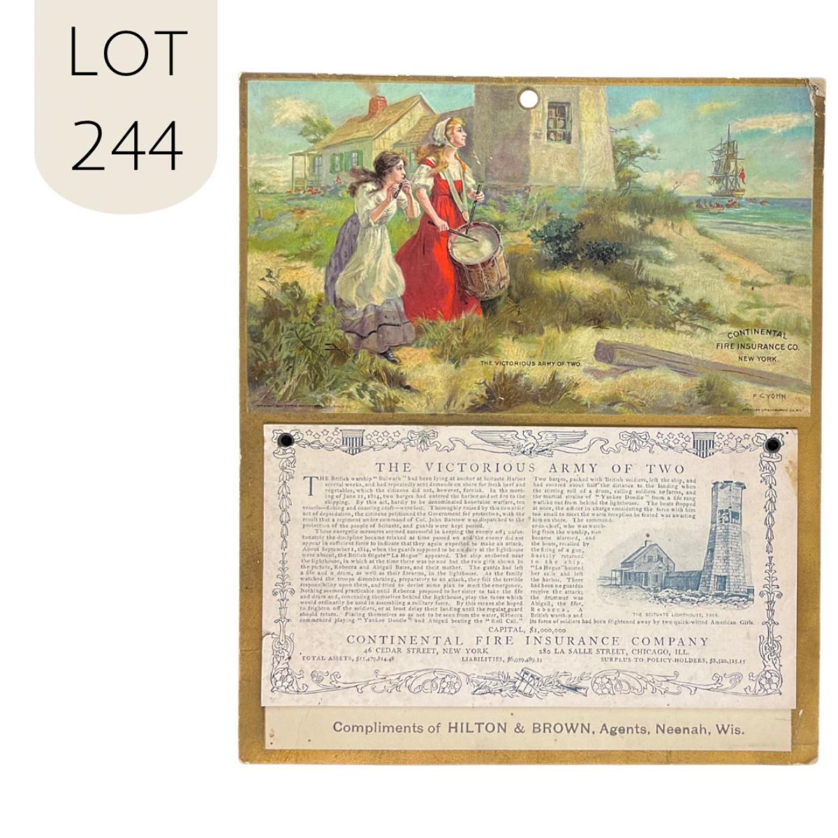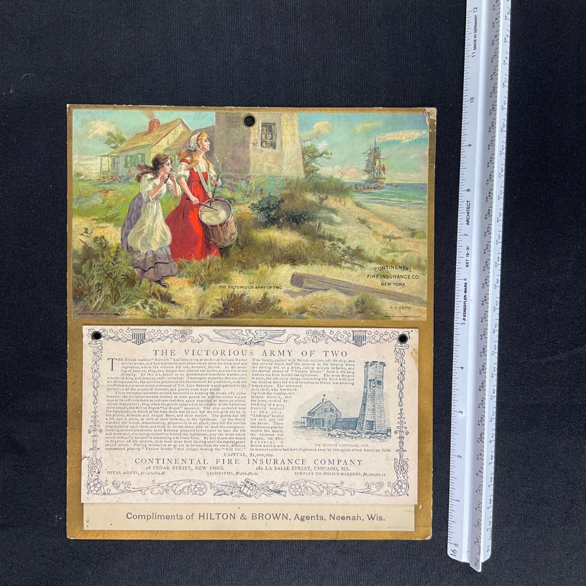 This calendar was compliments of Hilton & Brown, agents of the Continental Insurance Company of Neenah, Wisconsin. This calendar features a picture of two girls looking out to a ship off the shore. The original painting was by F C Yohn, copyright 1905, American Lithographic Company, New York. This calendar is complete, with cover page. This calendar measures 8 1/4" x 9 3/4". **|** Please see photos for details and condition. ::: Shipping is available on this lot. If you require shipping you must let us know at the close of the auction. We will coordinate with you after the item has been won. Shipping fees will include insurance up to or exceeding the value of all items being mailed. If you have any questions regarding this lot please contact the auctioneer either via this website, by direct email or by phone. PICK UP TIMES and other important information can be found in the TERMS and DESCRIPTION of the auction. Please take a look for pertinent information. Thanks!