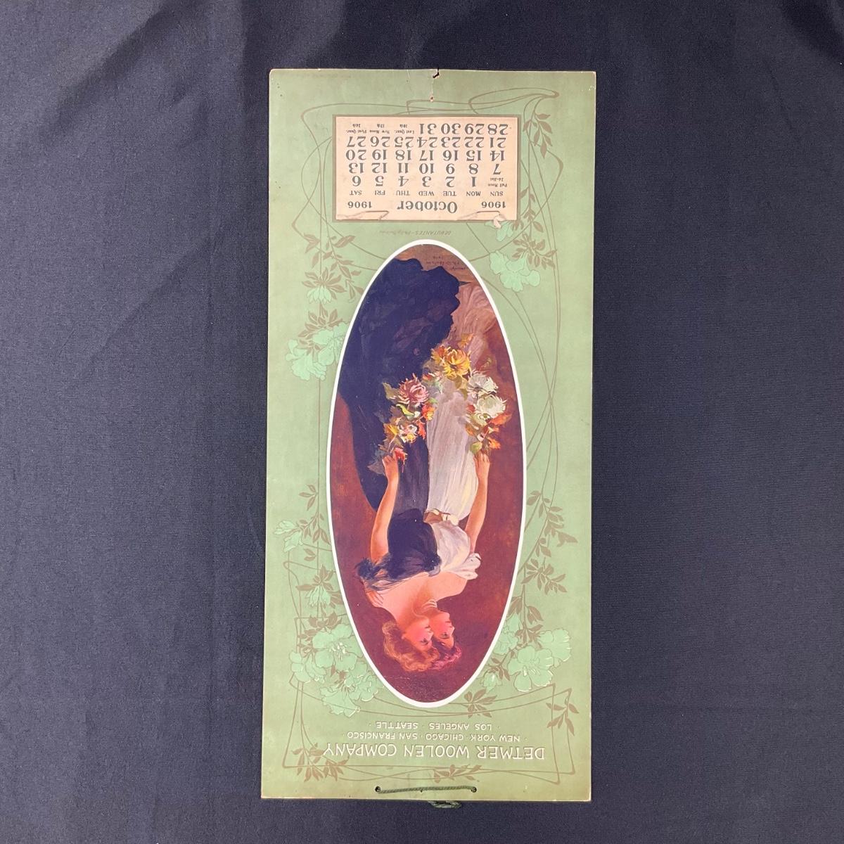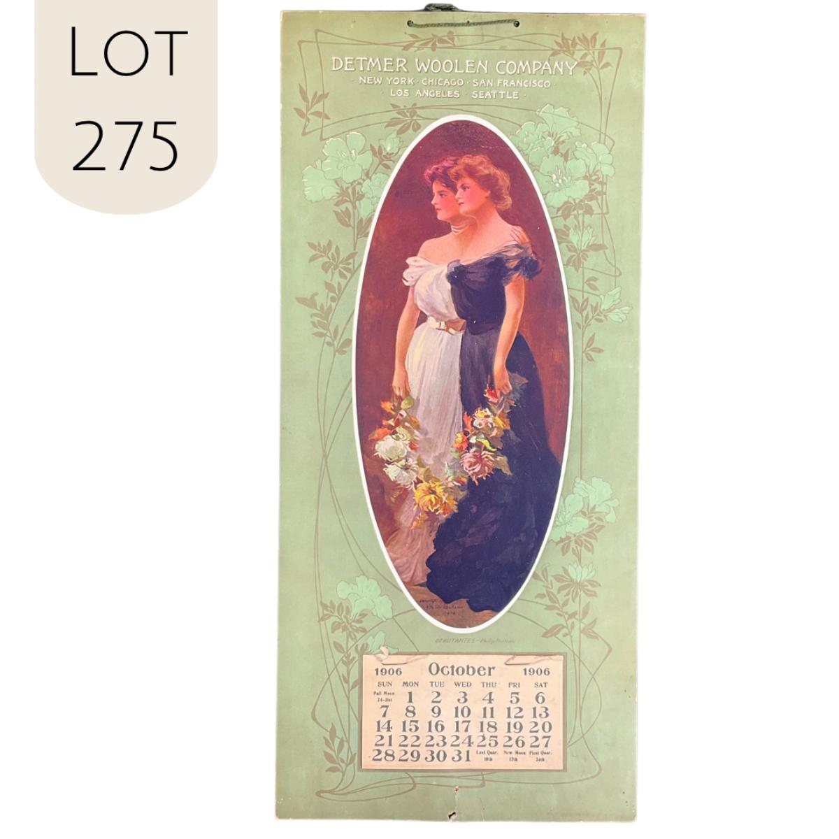This calendar was compliments of the Detmer Woolen Company of New York, Chicago, San Francisco, Los Angeles and Seattle. This calendar is incomplete, showing October 1906. The calendar features a picture of two women in gowns holding a floral garland, titled "Debutante", original painting by Philip Boileau, copyright 1904. This calendar measures 9 1/4" x 20 1/2". **|** Please see photos for details and condition. ::: Shipping is available on this lot. If you require shipping you must let us know at the close of the auction. We will coordinate with you after the item has been won. Shipping fees will include insurance up to or exceeding the value of all items being mailed. If you have any questions regarding this lot please contact the auctioneer either via this website, by direct email or by phone. PICK UP TIMES and other important information can be found in the TERMS and DESCRIPTION of the auction. Please take a look for pertinent information. Thanks!