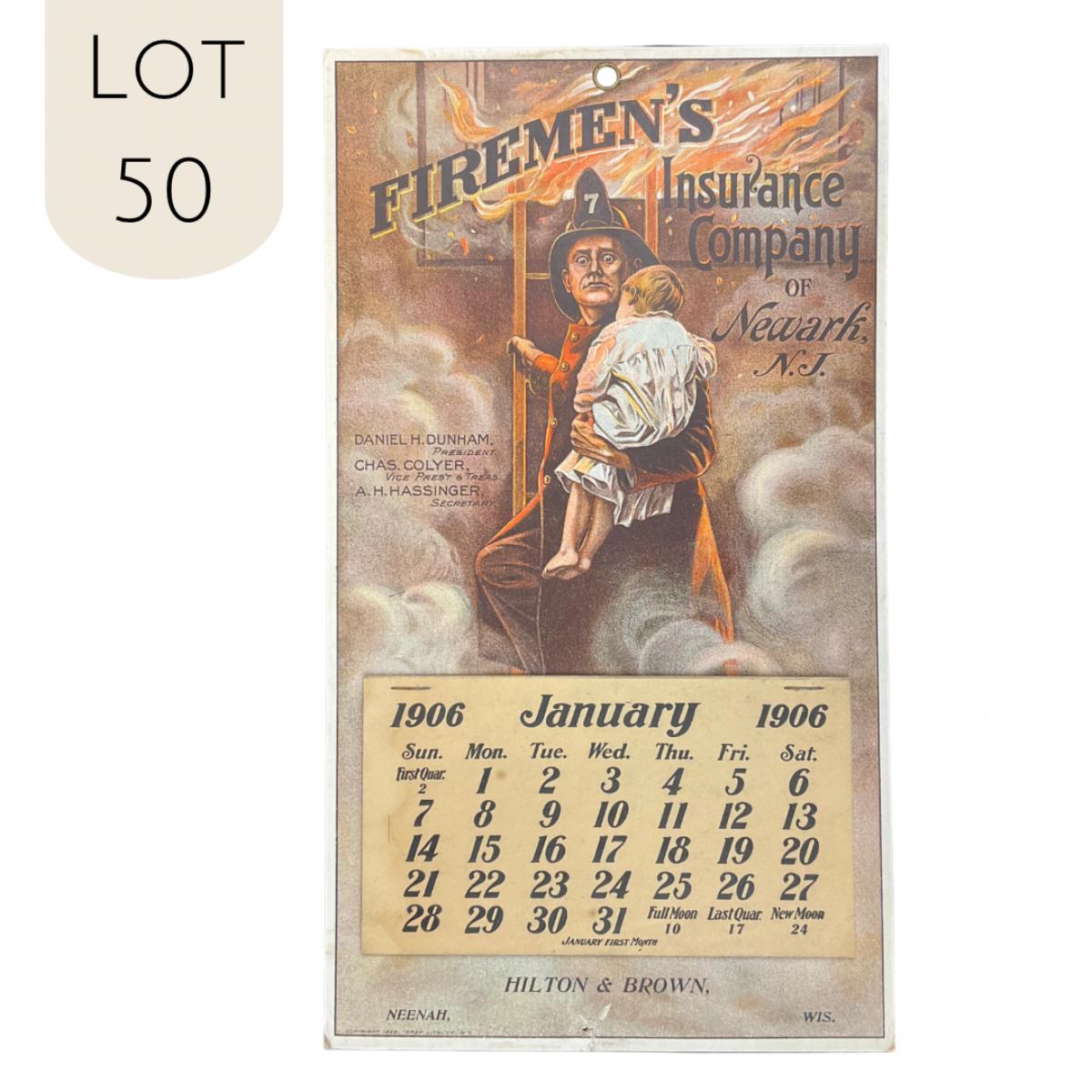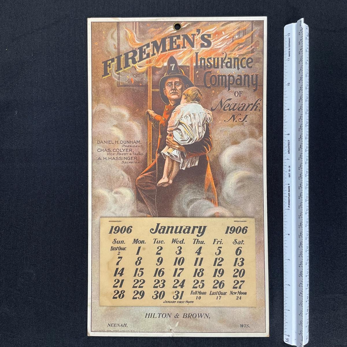 This Iconic Firemen's Insurance Company Ad was also used to promote the local branch here in Neenah, Wisconsin. The painting depicts a Fireman climbing down the stairs holding a child. Flames roar out of the window above him as smoke billows below. This calendar is complete and shows January 1906. One of the nicest pieces in this collection. This calendar measures 7 1/4" x 12 3/4". **|** Please see photos for details and condition. ::: Shipping is available on this lot. If you require shipping you must let us know at the close of the auction. We will coordinate with you after the item has been won. Shipping fees will include insurance up to or exceeding the value of all items being mailed. If you have any questions regarding this lot please contact the auctioneer either via this website, by direct email or by phone. PICK UP TIMES and other important information can be found in the TERMS and DESCRIPTION of the auction. Please take a look for pertinent information. Thanks!