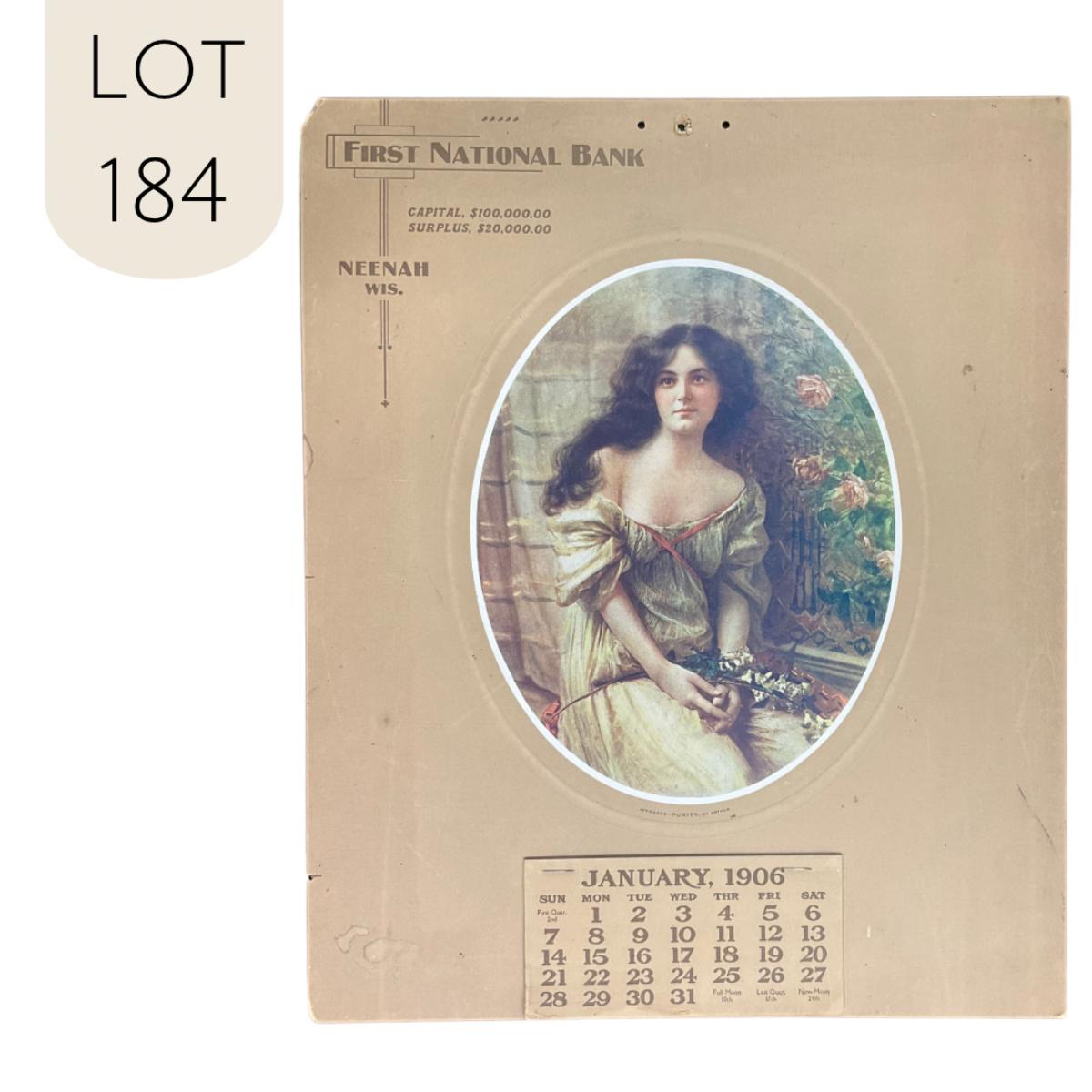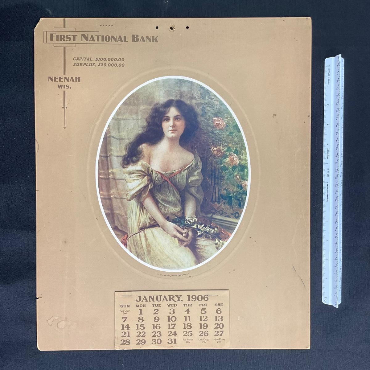 This calendar was produced by Brown & Bigelow of St Paul Minnesota. This calendar is promoting the First National Bank of Neenah Wisconsin. The calendar features a portrait of a dark haired woman holding flowers titled "Purity", original by James Arthur, copyright 1904. This calendar is complete, showing January 1906. This calendar measures 14 1/4" x 17 1/4". **|** Please see photos for details and condition. ::: Shipping is available on this lot. If you require shipping you must let us know at the close of the auction. We will coordinate with you after the item has been won. Shipping fees will include insurance up to or exceeding the value of all items being mailed. If you have any questions regarding this lot please contact the auctioneer either via this website, by direct email or by phone. PICK UP TIMES and other important information can be found in the TERMS and DESCRIPTION of the auction. Please take a look for pertinent information. Thanks!