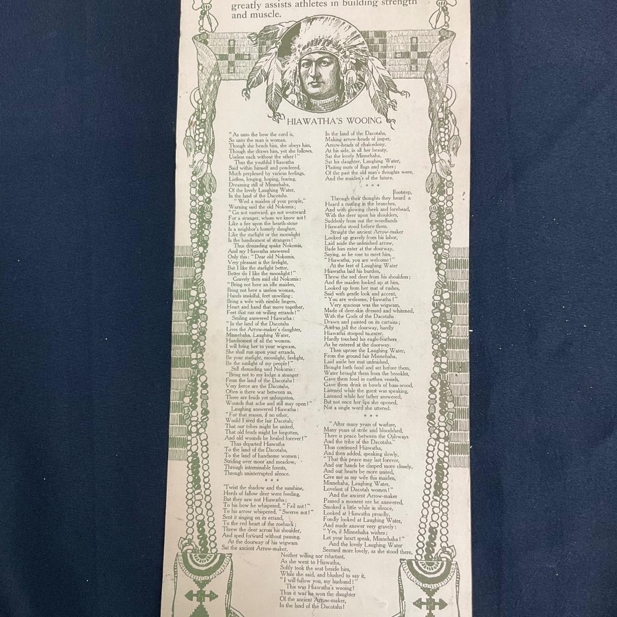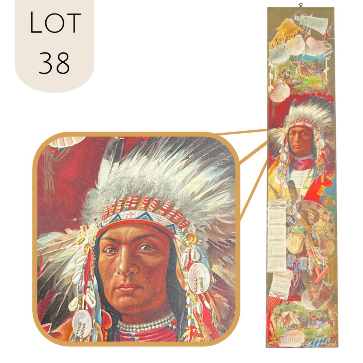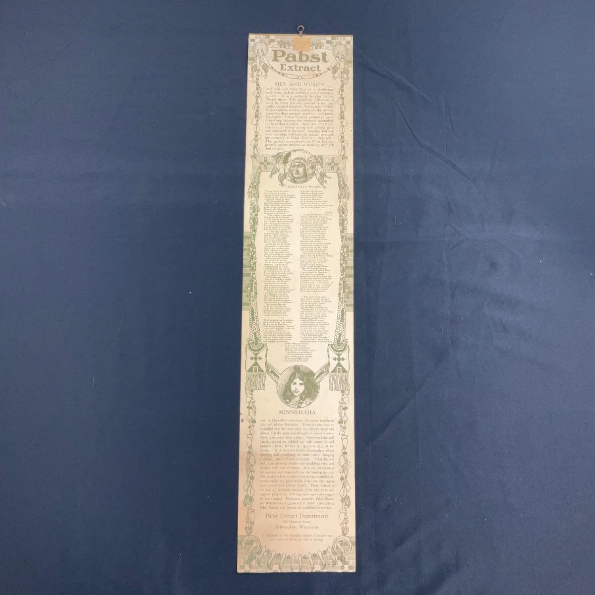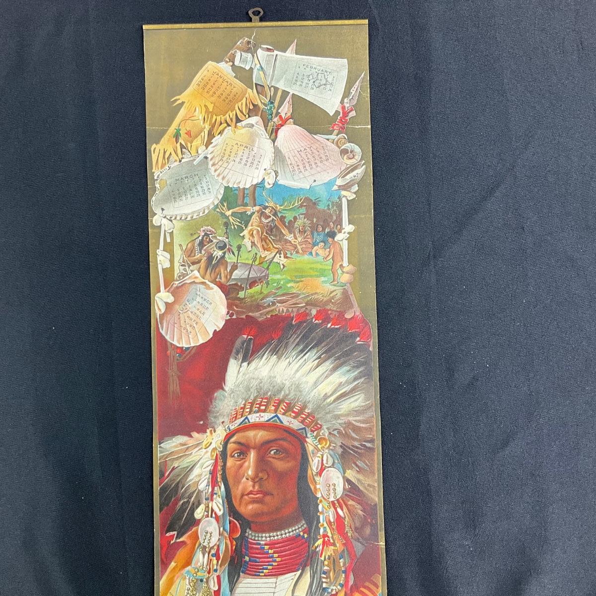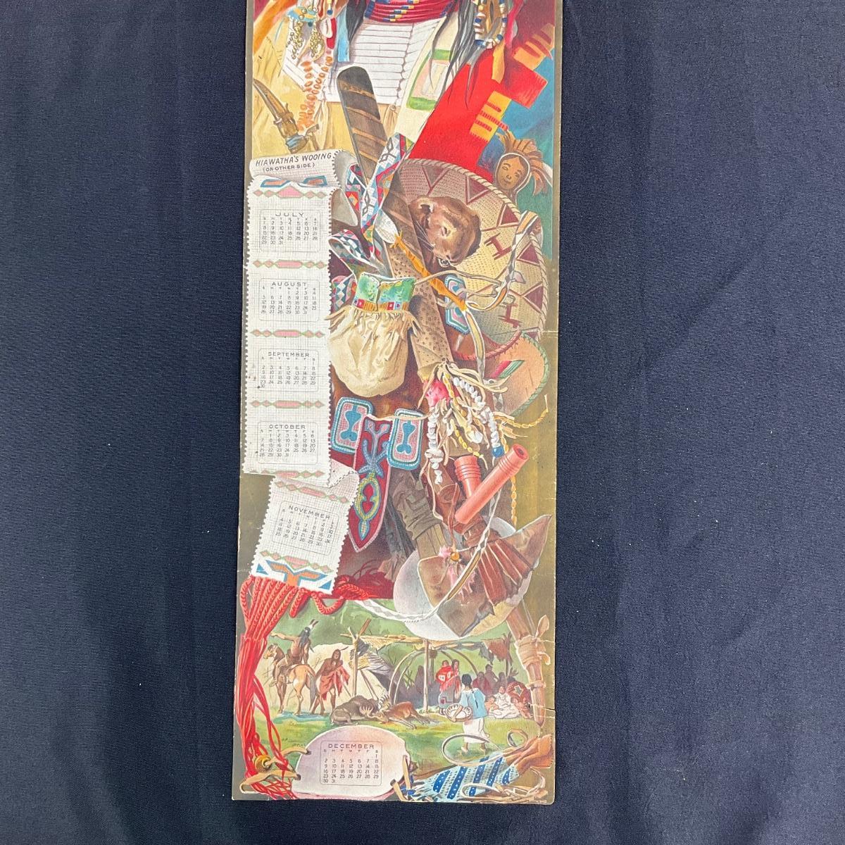 This calendar is an exceptional example of art at the turn of the century. This calendar measures 7 1/4" x 36". The front of this Yard Long Calendar depicts a Native American Scene in rich colorful detail. The reverse of the calendar tells the story of Hiawatha, Minnehaha and the Wooing. Complete, excluding the original tube - you are unlikely to find another example in such a state. The artwork is credited to Carl W Hennig. **|** Please see photos for details and condition. ::: Shipping is available on this lot. If you require shipping you must let us know at the close of the auction. We will coordinate with you after the item has been won. Shipping fees will include insurance up to or exceeding the value of all items being mailed. If you have any questions regarding this lot please contact the auctioneer either via this website, by direct email or by phone. PICK UP TIMES and other important information can be found in the TERMS and DESCRIPTION of the auction. Please take a look for pertinent information. Thanks!