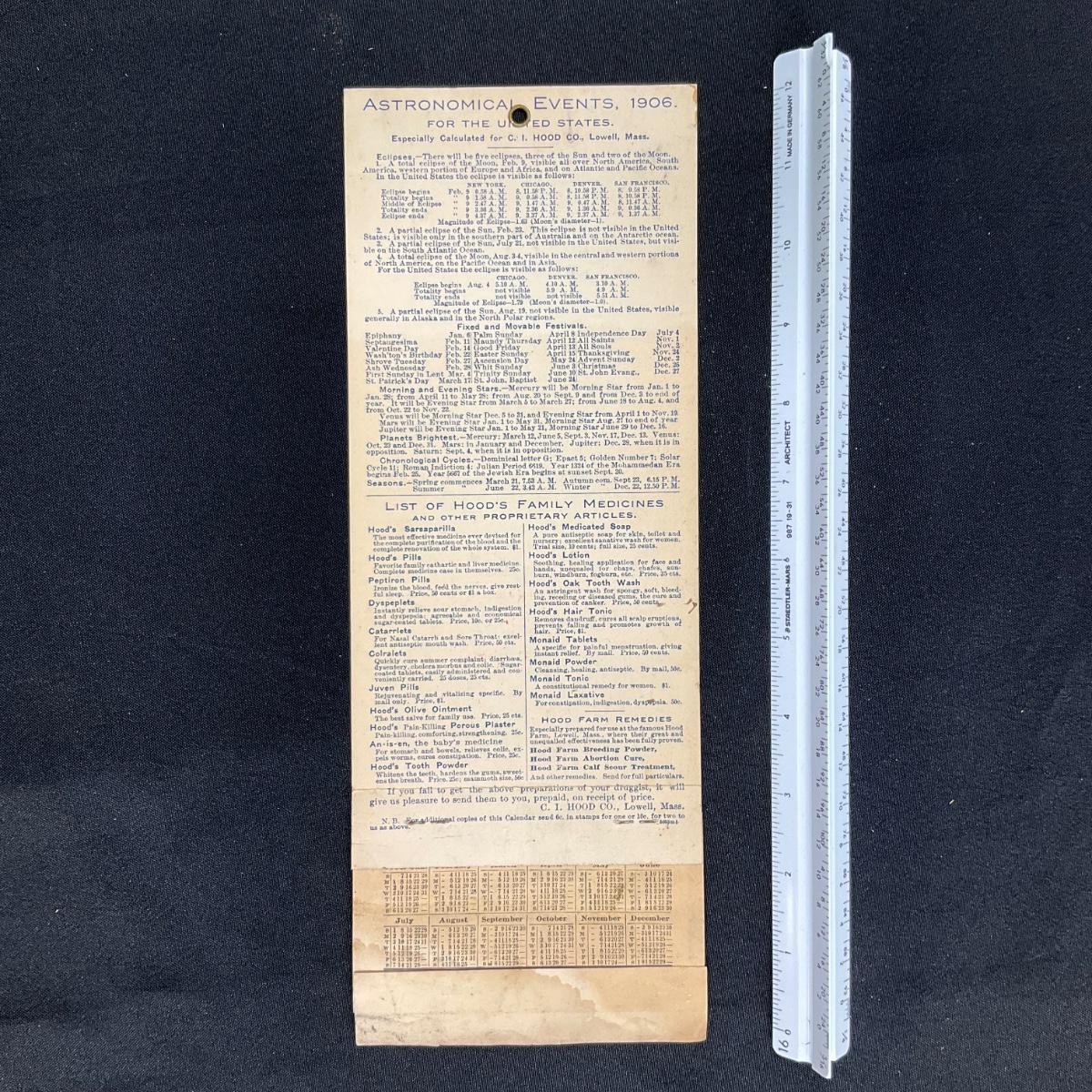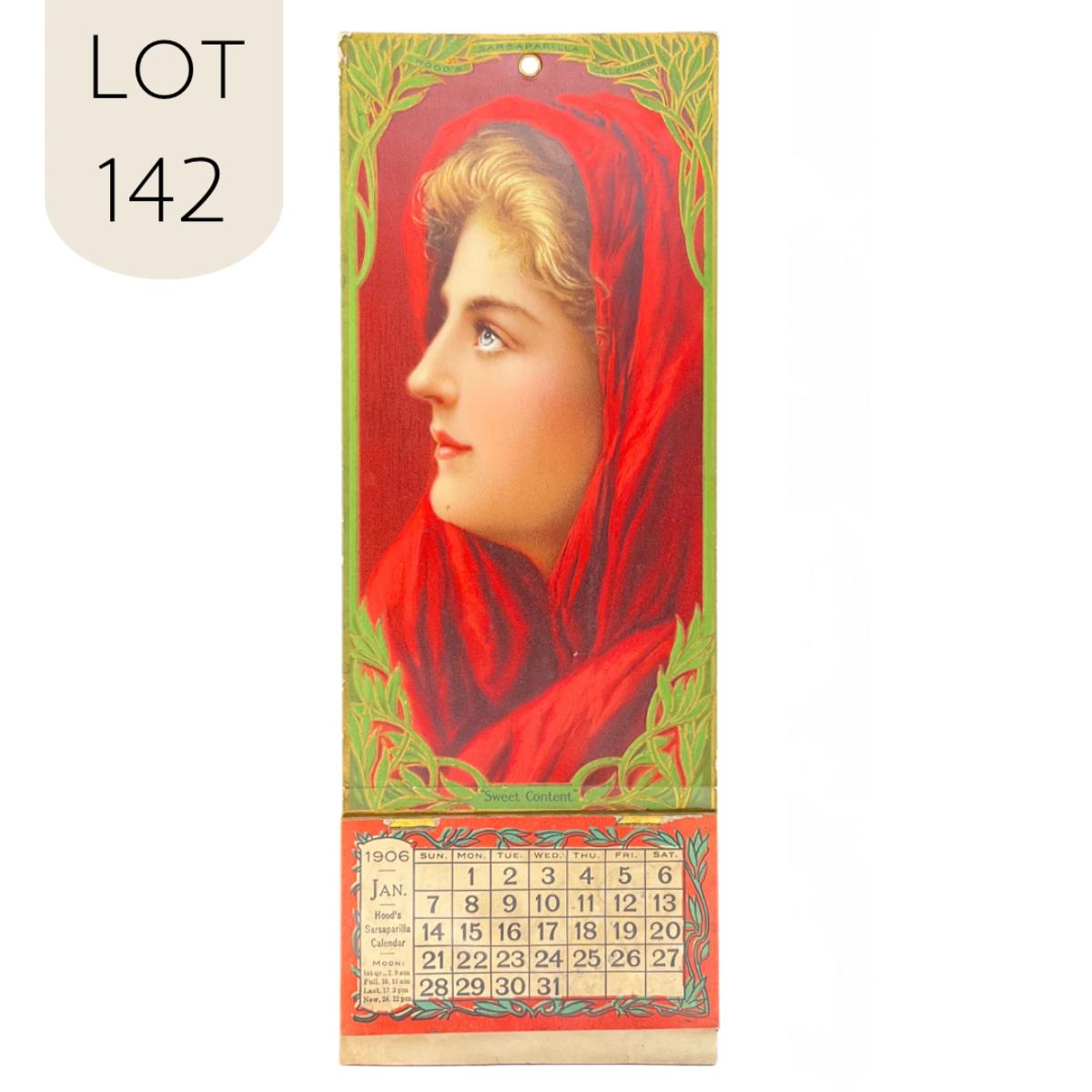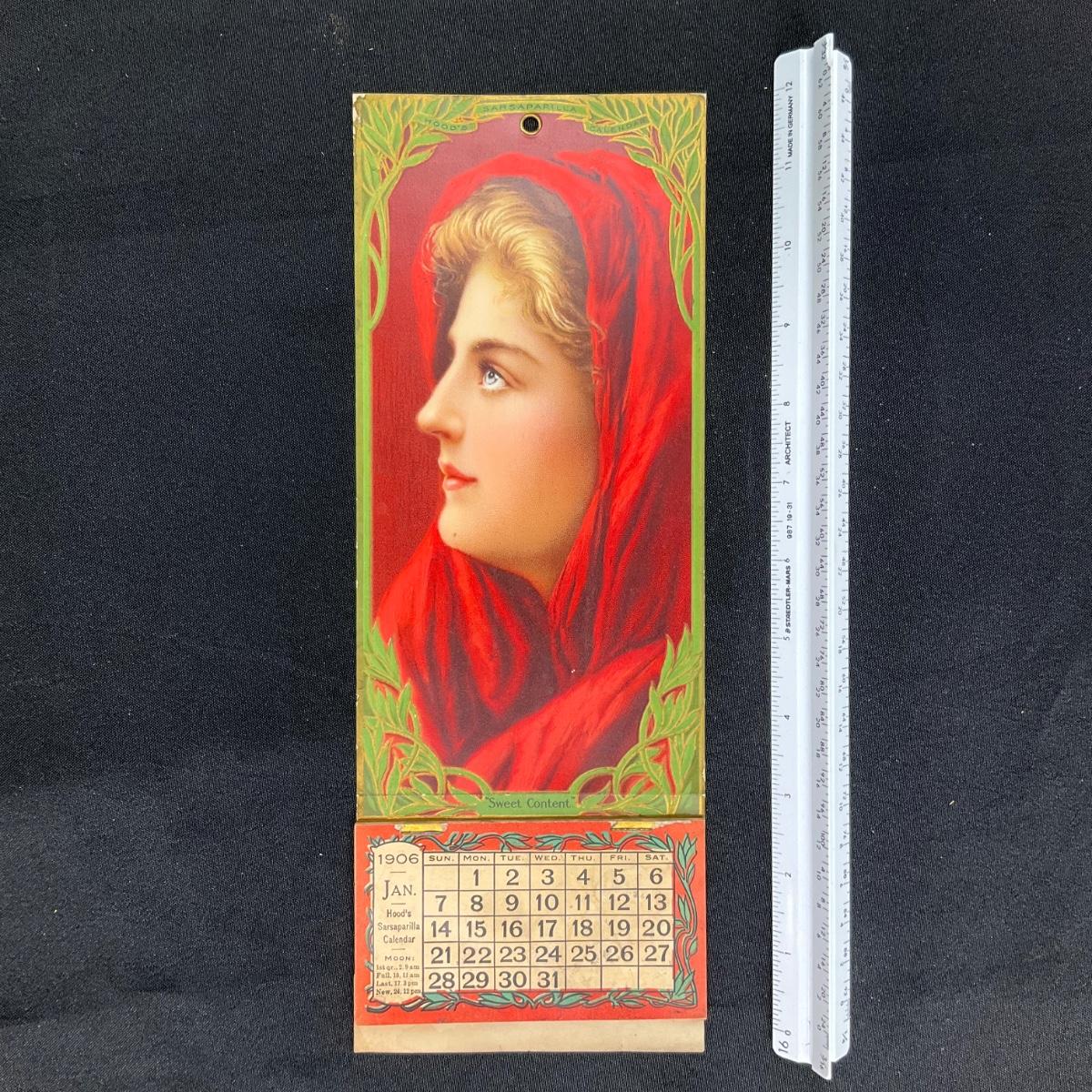 This Hood's Sarsaparilla calendar is VIBRANT and complete, showing January 1906. The calendar features a picture titled "Sweet Content", no artist noted. The picture shows a profile of a young blonde woman with red hood and cape. This calendar was published by C I Hood Co of Lowell, Massachusetts. This calendar measures 4 1/2" x 12 1/4". **|** Please see photos for details and condition. ::: Shipping is available on this lot. If you require shipping you must let us know at the close of the auction. We will coordinate with you after the item has been won. Shipping fees will include insurance up to or exceeding the value of all items being mailed. If you have any questions regarding this lot please contact the auctioneer either via this website, by direct email or by phone. PICK UP TIMES and other important information can be found in the TERMS and DESCRIPTION of the auction. Please take a look for pertinent information. Thanks!