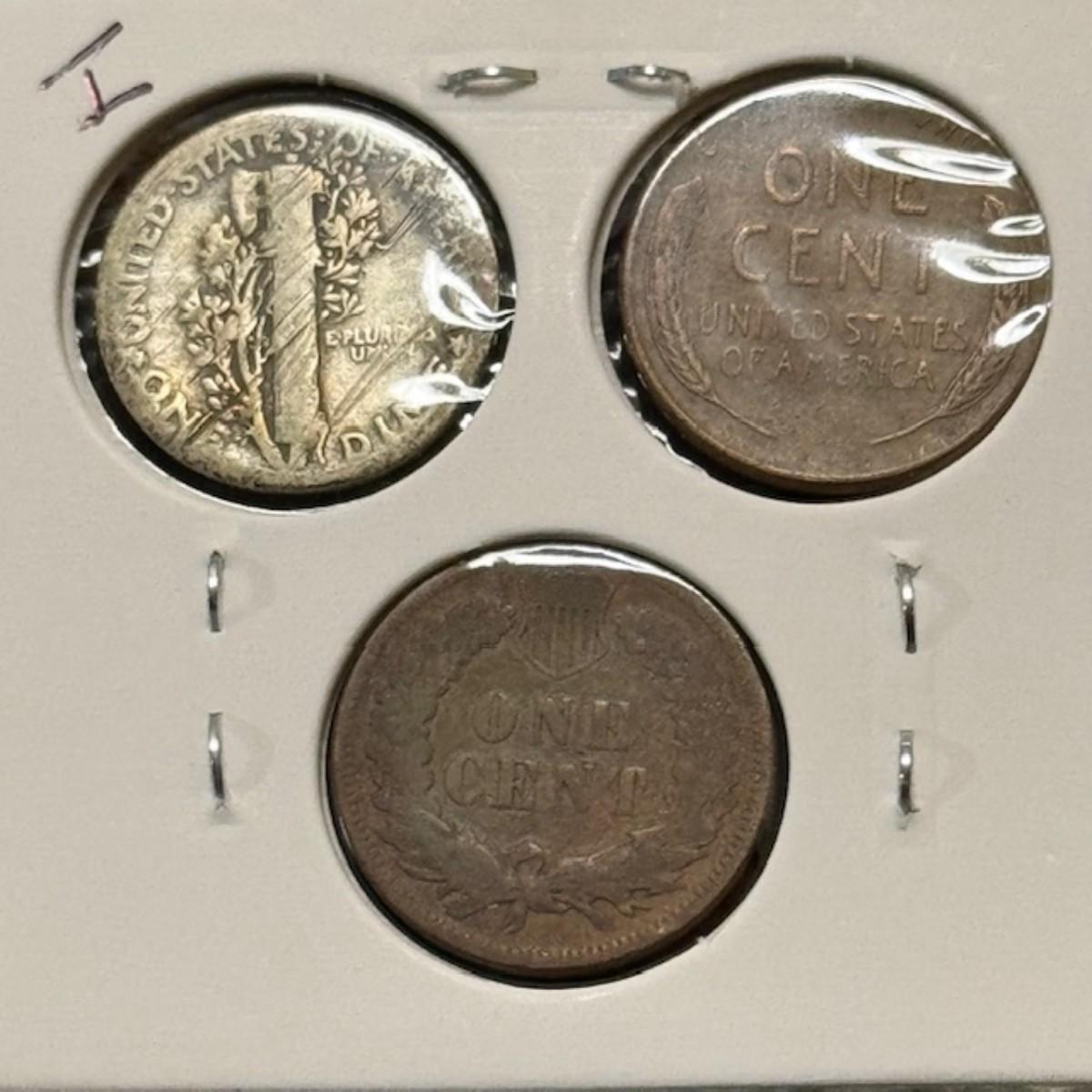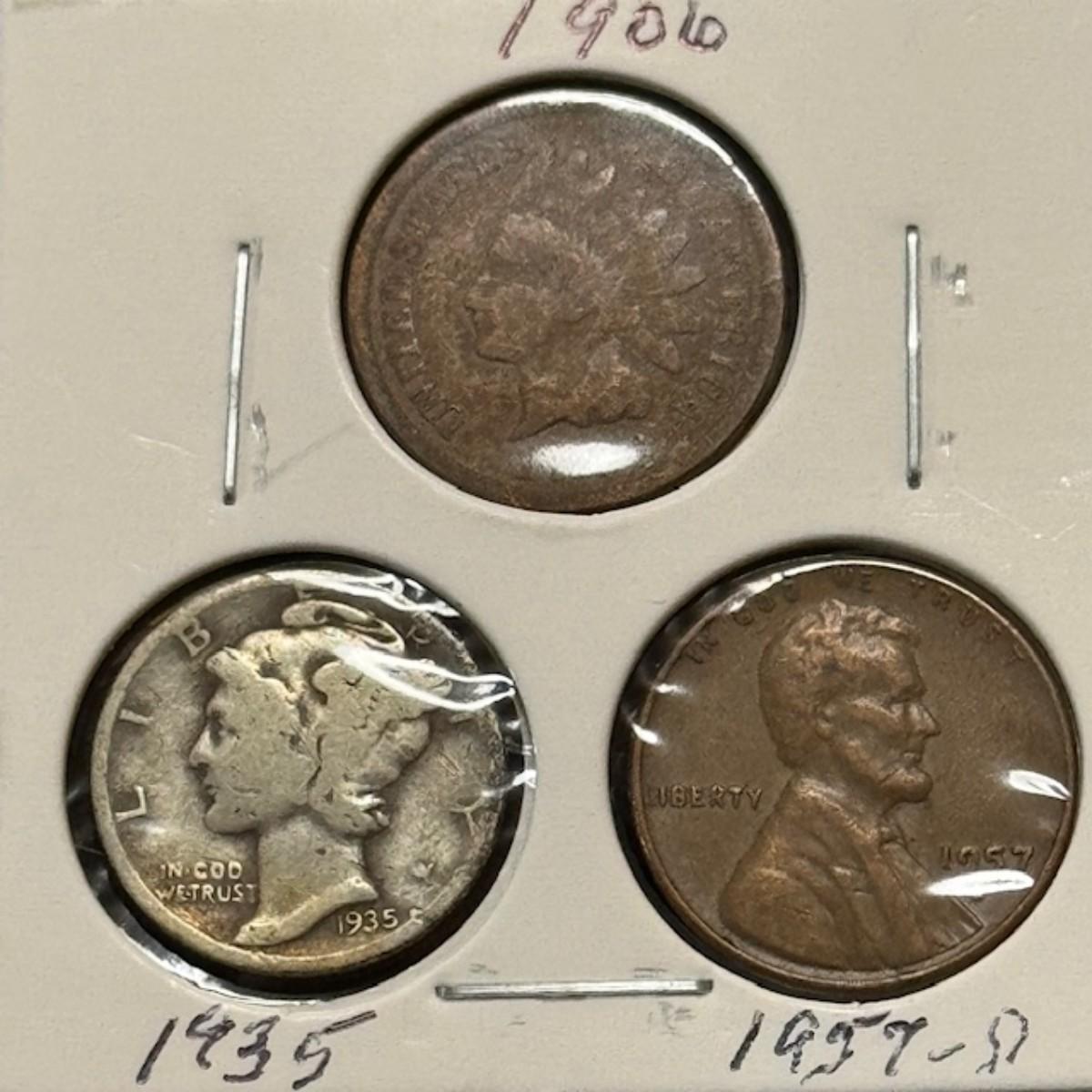 1906 Indian Head Penny, 1935 Mercury Dime, 1957 D W. Penny