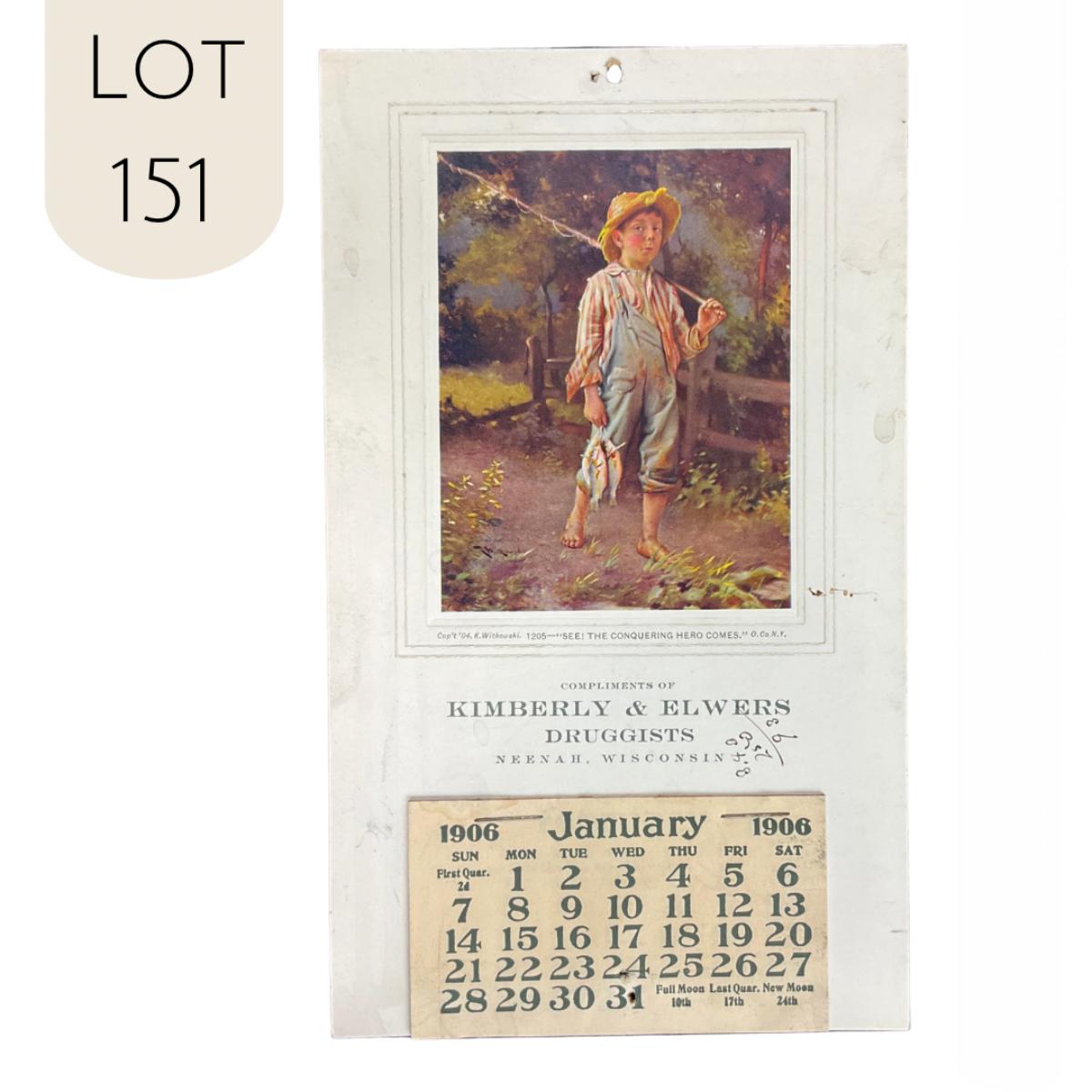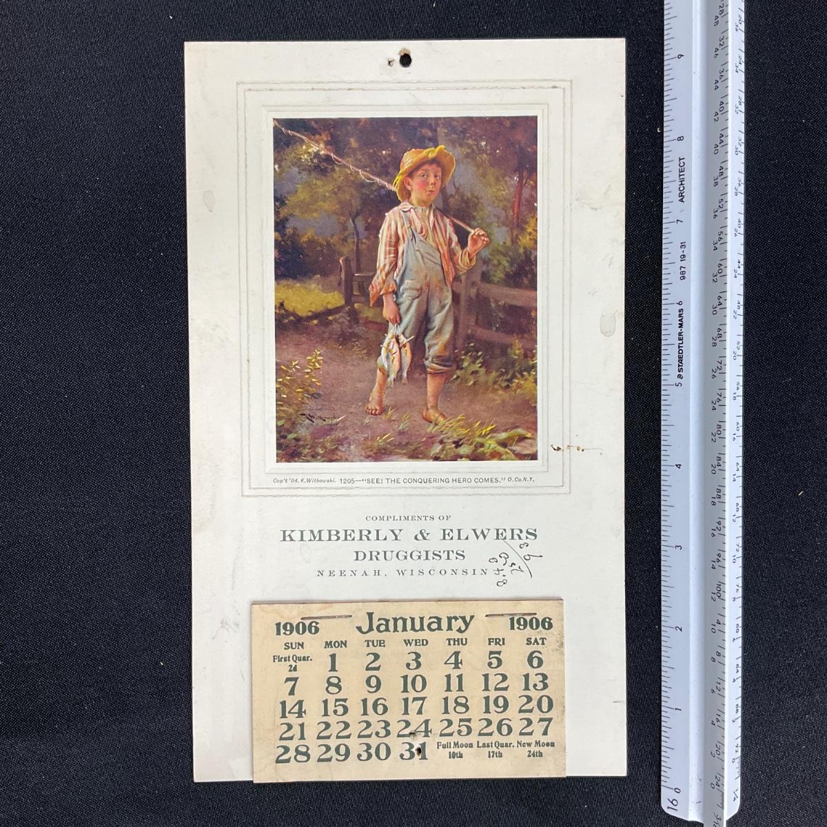 This calendar was compliments of Kimberly & Elwers, Druggists in Neenah, WI. The calendar features a picture titled "See - The Conquering Hero Comes", original by Karl Witkowski, copyright 1904. The picture depicts a Young boy whistling with a fishing pole and catch. The calendar was printed by the Osbourne Company of New York. The calendar is complete, showing January 1906. The calendar measures 5 3/8" x 9 1/8". **|** Please see photos for details and condition. ::: Shipping is available on this lot. If you require shipping you must let us know at the close of the auction. We will coordinate with you after the item has been won. Shipping fees will include insurance up to or exceeding the value of all items being mailed. If you have any questions regarding this lot please contact the auctioneer either via this website, by direct email or by phone. PICK UP TIMES and other important information can be found in the TERMS and DESCRIPTION of the auction. Please take a look for pertinent information. Thanks!