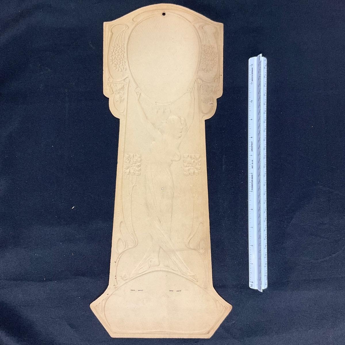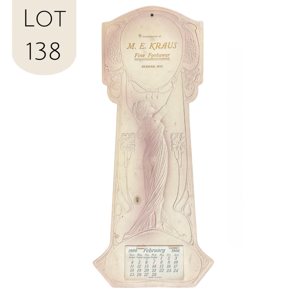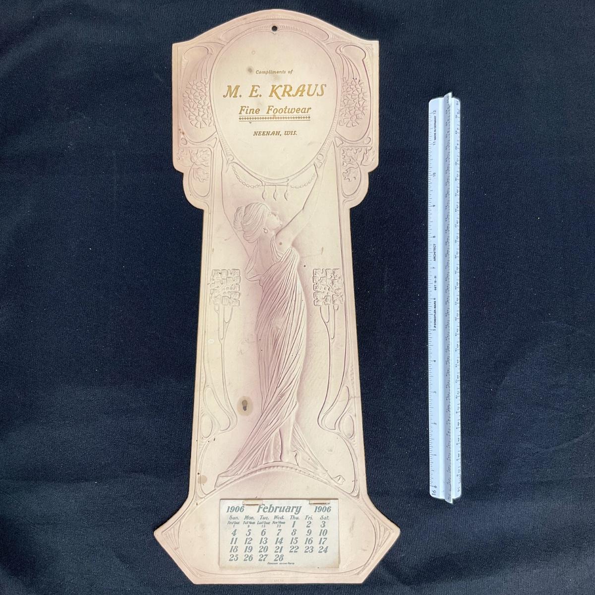 This beautiful Art Nouveau calendar has a 3D raised effect. The calendar features a woman holding up the advertising sign for M E Kraus's Fine Footwear store, in Neenah WI. This calendar is incomplete, showing February 1906. This calendar measures 7 7/8" x 19". **|** Please see photos for details and condition. ::: Shipping is available on this lot. If you require shipping you must let us know at the close of the auction. We will coordinate with you after the item has been won. Shipping fees will include insurance up to or exceeding the value of all items being mailed. If you have any questions regarding this lot please contact the auctioneer either via this website, by direct email or by phone. PICK UP TIMES and other important information can be found in the TERMS and DESCRIPTION of the auction. Please take a look for pertinent information. Thanks!