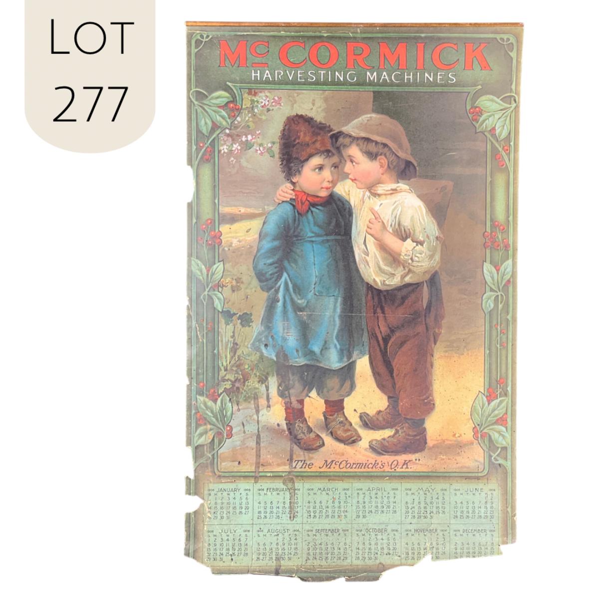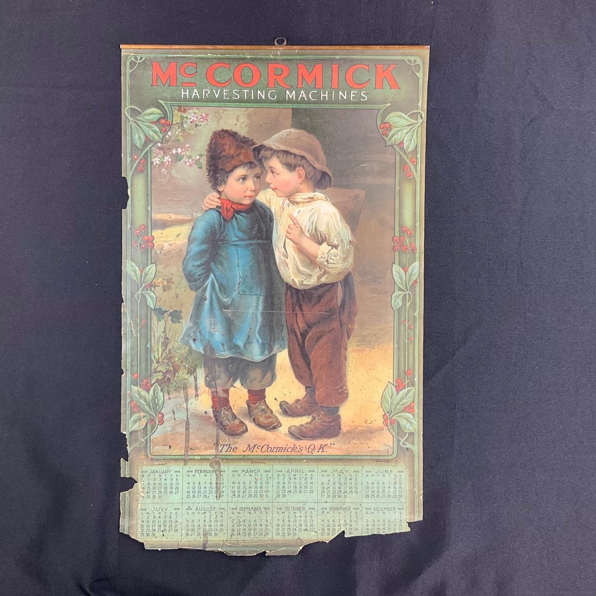 This calendar was made to promote the McCormick Harvesting Machines. Later this company would merge with Deering and others to become the International Harvester Company. The calendar features a picture of a young boy talking to another child, titled "The McCormick's O.K.". This calendar is nearly complete, with damage at the bottom by November and December. Would still be Stunning in a frame! This called dar measures approximately 12 1/4" x 20 1/2". **|** Please see photos for details and condition. ::: Shipping is available on this lot. If you require shipping you must let us know at the close of the auction. We will coordinate with you after the item has been won. Shipping fees will include insurance up to or exceeding the value of all items being mailed. If you have any questions regarding this lot please contact the auctioneer either via this website, by direct email or by phone. PICK UP TIMES and other important information can be found in the TERMS and DESCRIPTION of the auction. Please take a look for pertinent information. Thanks!