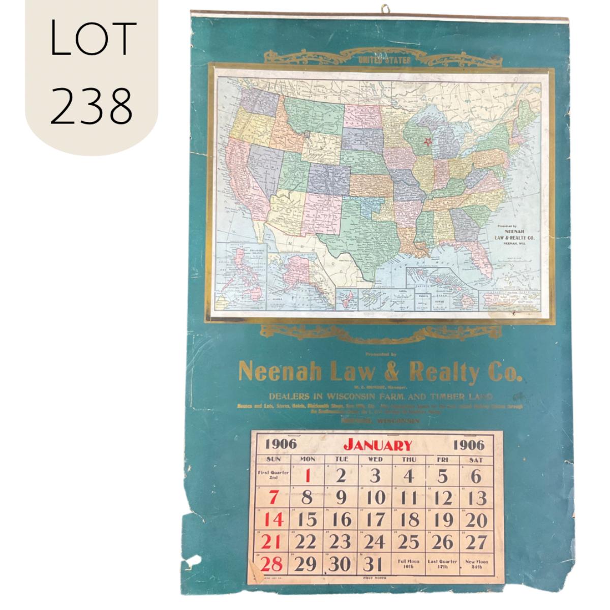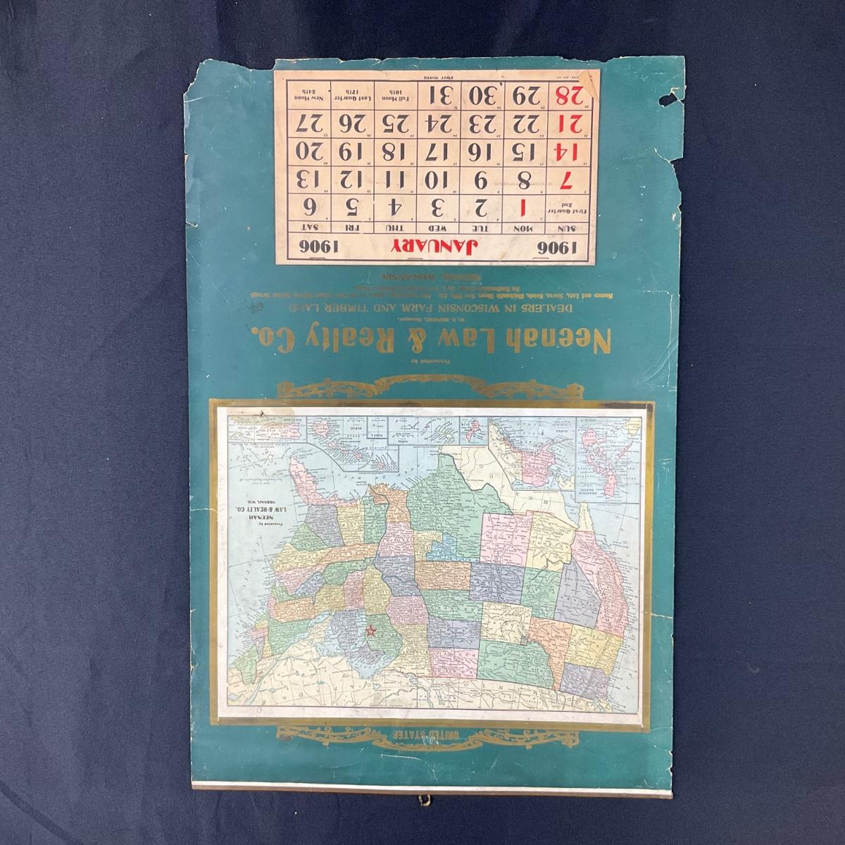 This calendar was compliments of the Neenah Law & Realty Company, of Neenah Wisconsin. Their company dealt with Wisconsin Farm and Timber Law. The calendar features a map of the 50 United States with a star over Neenah. This calendar is complete, showing January 1906. This calendar measures 15 3/4" x 23 1/2". It's a whopper! **|** Please see photos for details and condition. ::: Shipping is available on this lot. If you require shipping you must let us know at the close of the auction. We will coordinate with you after the item has been won. Shipping fees will include insurance up to or exceeding the value of all items being mailed. If you have any questions regarding this lot please contact the auctioneer either via this website, by direct email or by phone. PICK UP TIMES and other important information can be found in the TERMS and DESCRIPTION of the auction. Please take a look for pertinent information. Thanks!