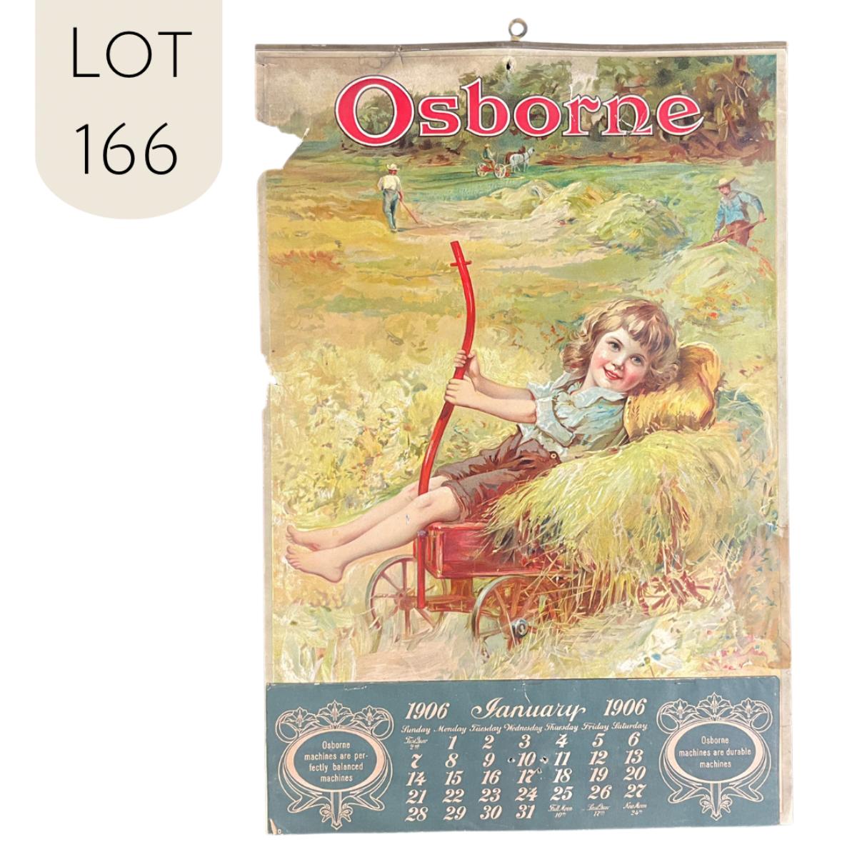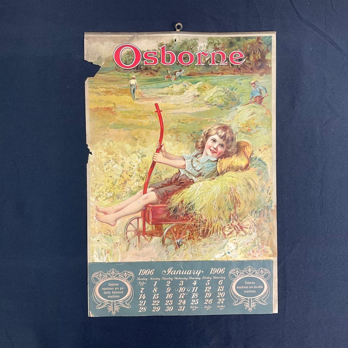 This calendar was produced to promote the Osborne company and their Farm Machinery. The picture featured on this calendar depicts a young child in a small hay wagon in a field, no artist noted. Copyright 1905, Hayes Litho Co, Buffalo NY. The calendar is complete, showing January 1906. This calendar measures 13 3/8" x 19 7/8". **|** Please see photos for details and condition. ::: Shipping is available on this lot. If you require shipping you must let us know at the close of the auction. We will coordinate with you after the item has been won. Shipping fees will include insurance up to or exceeding the value of all items being mailed. If you have any questions regarding this lot please contact the auctioneer either via this website, by direct email or by phone. PICK UP TIMES and other important information can be found in the TERMS and DESCRIPTION of the auction. Please take a look for pertinent information. Thanks!