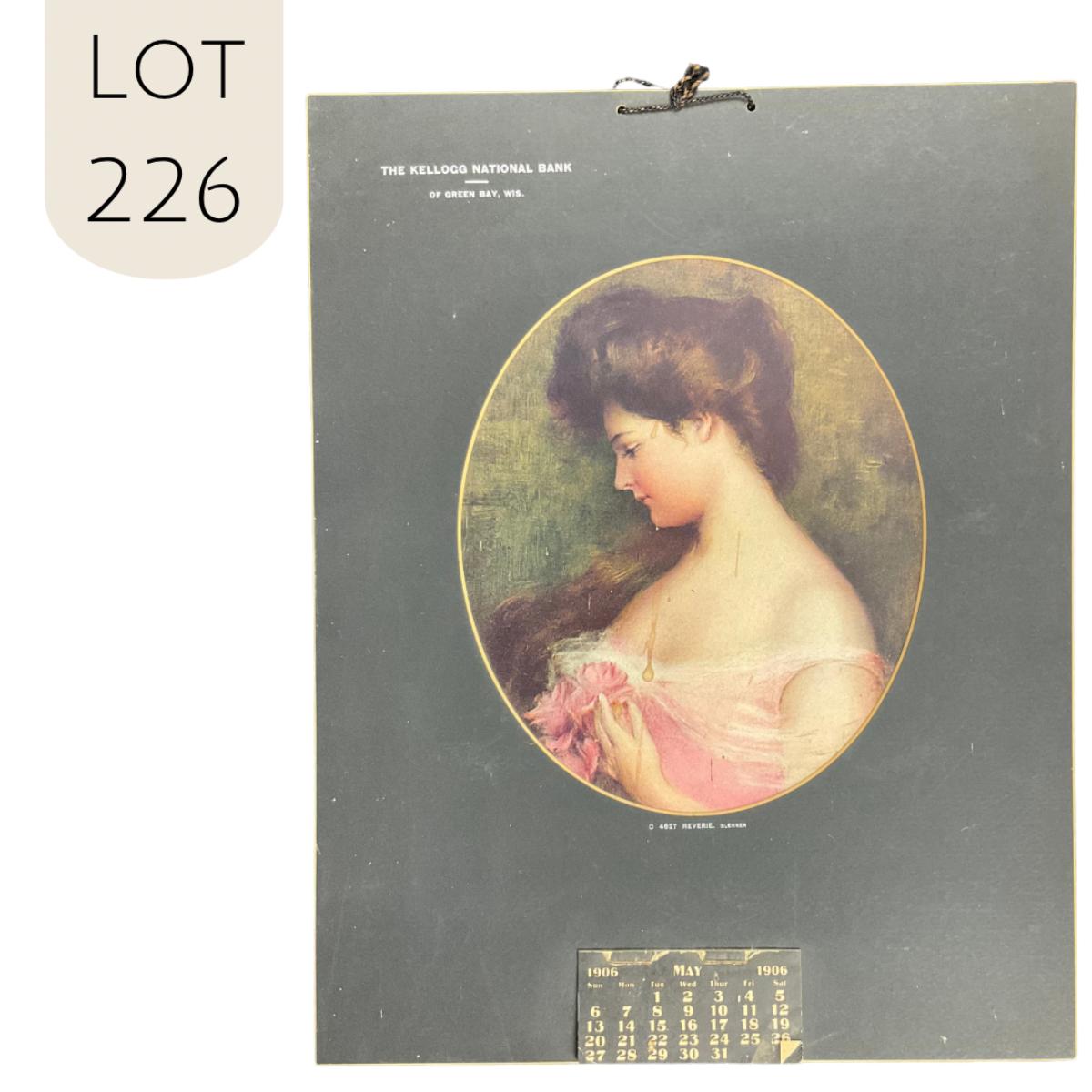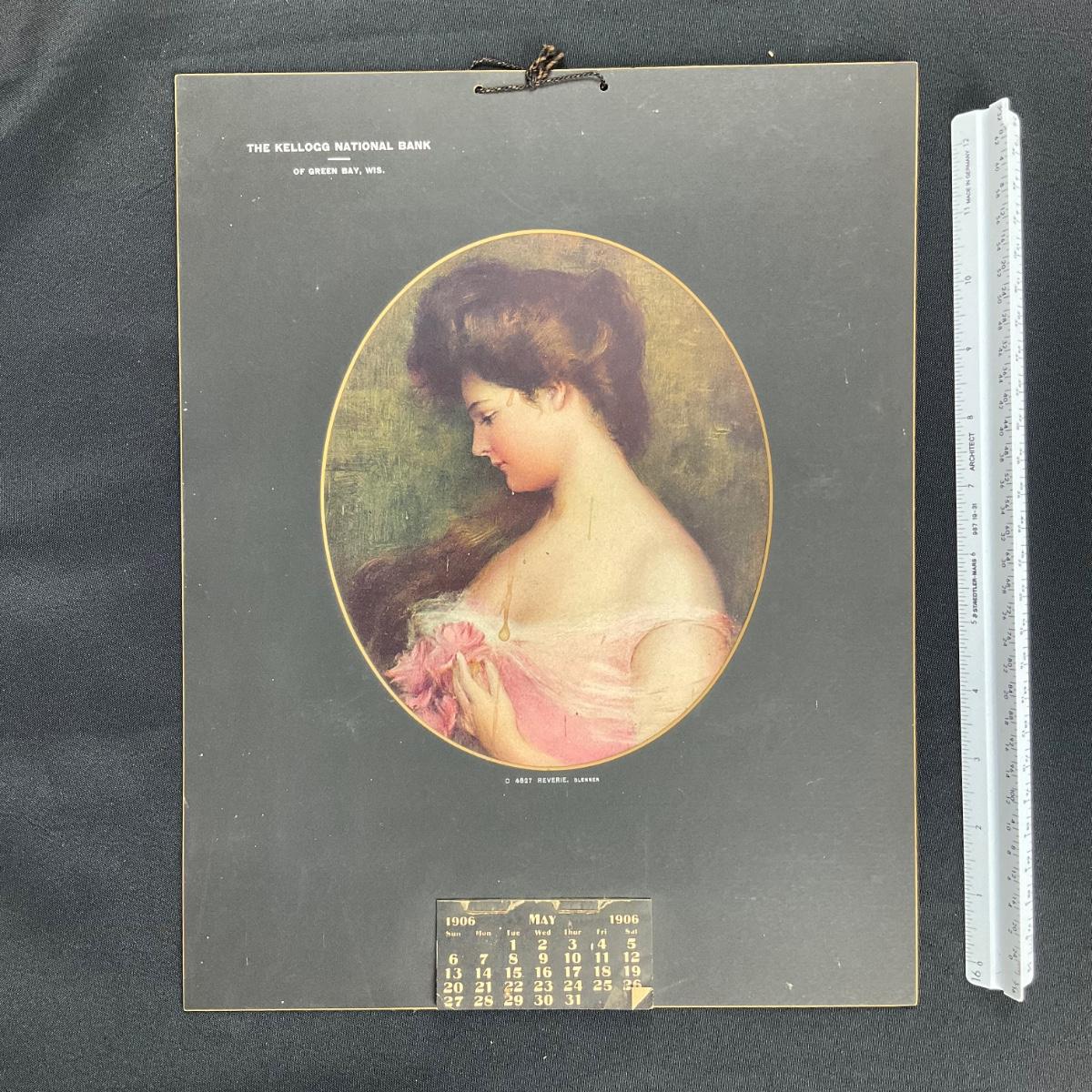 This calendar was compliments of The Kellog National Bank of Green Bay, Wisconsin. This calendar features a portrait of a woman in a pink dress with pink roses, titled "Reverie". The original painting was by Carle J Blenner. This calendar is incomplete showing May 1906. This calendar measures 10 3/4" x 13 3/4". **|** Please see photos for details and condition. ::: Shipping is available on this lot. If you require shipping you must let us know at the close of the auction. We will coordinate with you after the item has been won. Shipping fees will include insurance up to or exceeding the value of all items being mailed. If you have any questions regarding this lot please contact the auctioneer either via this website, by direct email or by phone. PICK UP TIMES and other important information can be found in the TERMS and DESCRIPTION of the auction. Please take a look for pertinent information. Thanks!