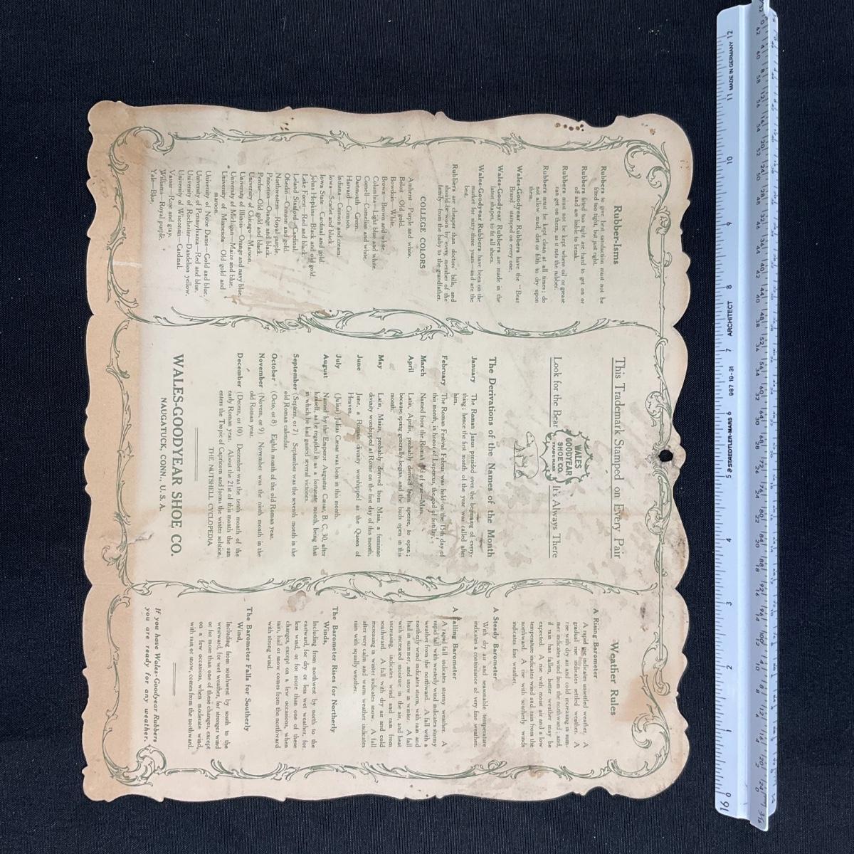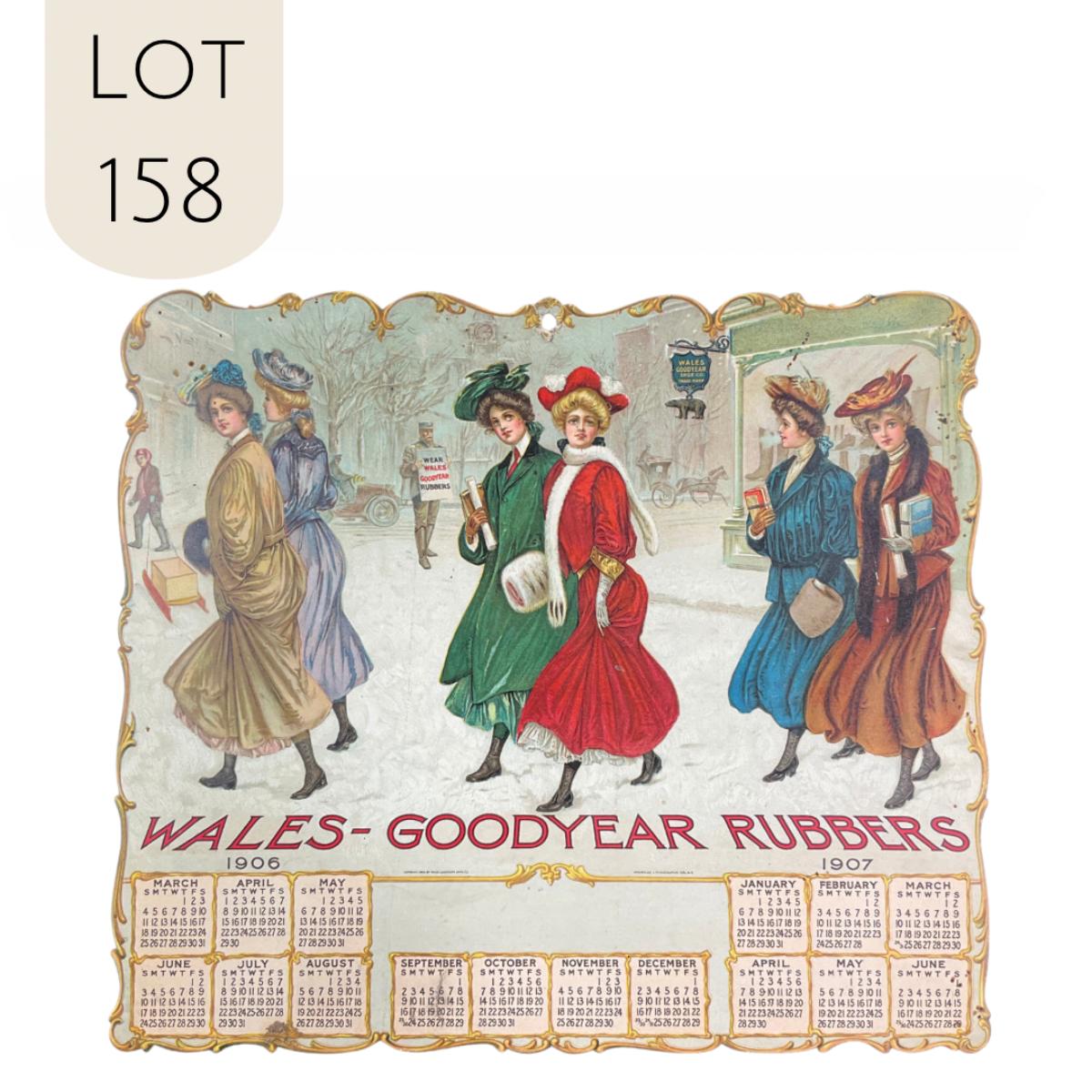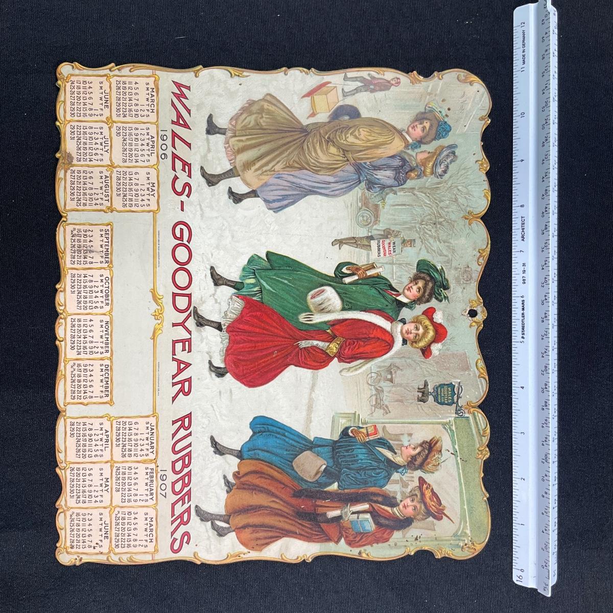 This 16-month single page Die-Cut calendar was produced by the American Lithographic Company in New York for the Wales-Goodyear Rubbers company, copyright 1906. This calendar features 6 women dressed for winter weather, crossing the street - all wearing their rubbers. The calendar measures 10 3/4" x 9 3/8". **|** Please see photos for details and condition. ::: Shipping is available on this lot. If you require shipping you must let us know at the close of the auction. We will coordinate with you after the item has been won. Shipping fees will include insurance up to or exceeding the value of all items being mailed. If you have any questions regarding this lot please contact the auctioneer either via this website, by direct email or by phone. PICK UP TIMES and other important information can be found in the TERMS and DESCRIPTION of the auction. Please take a look for pertinent information. Thanks!