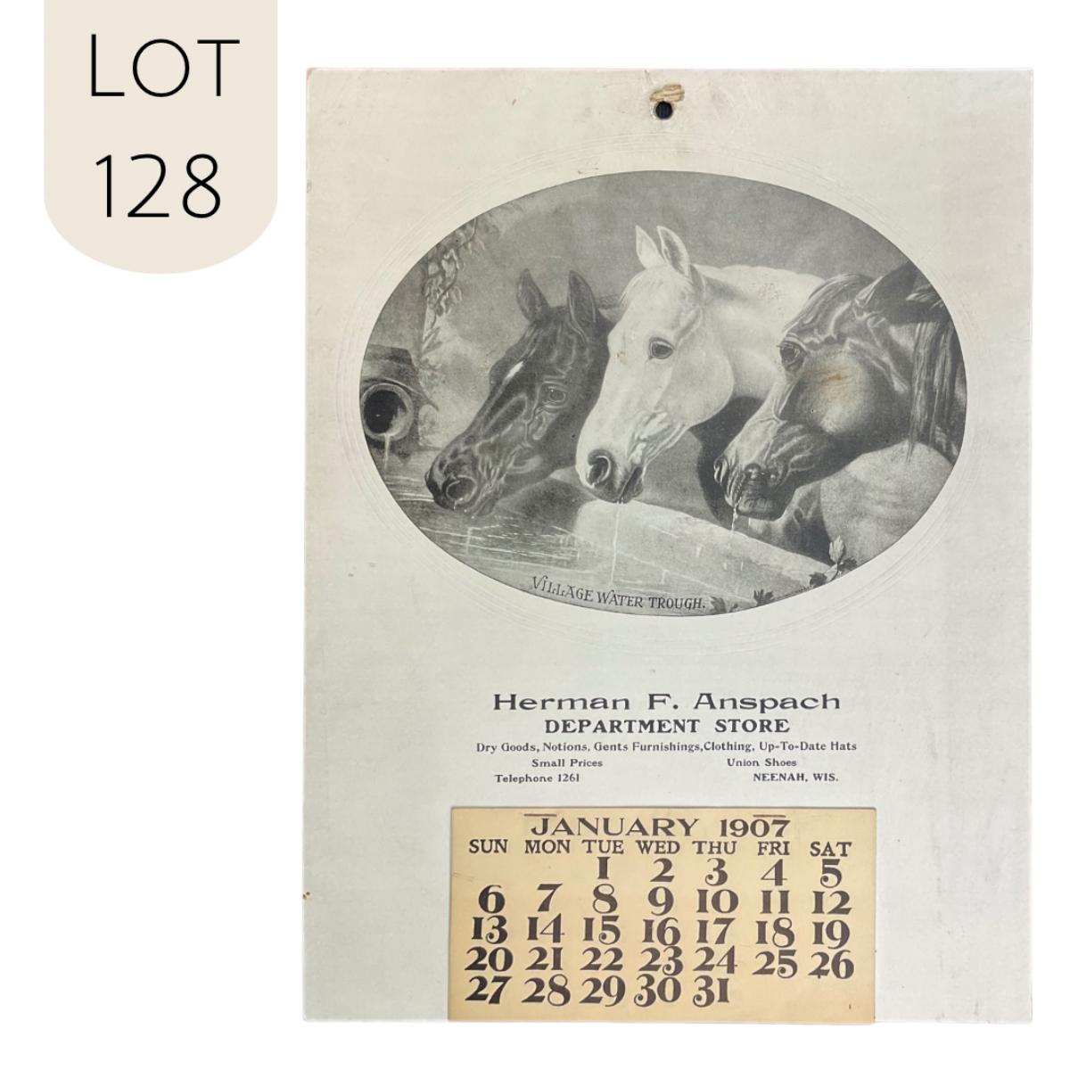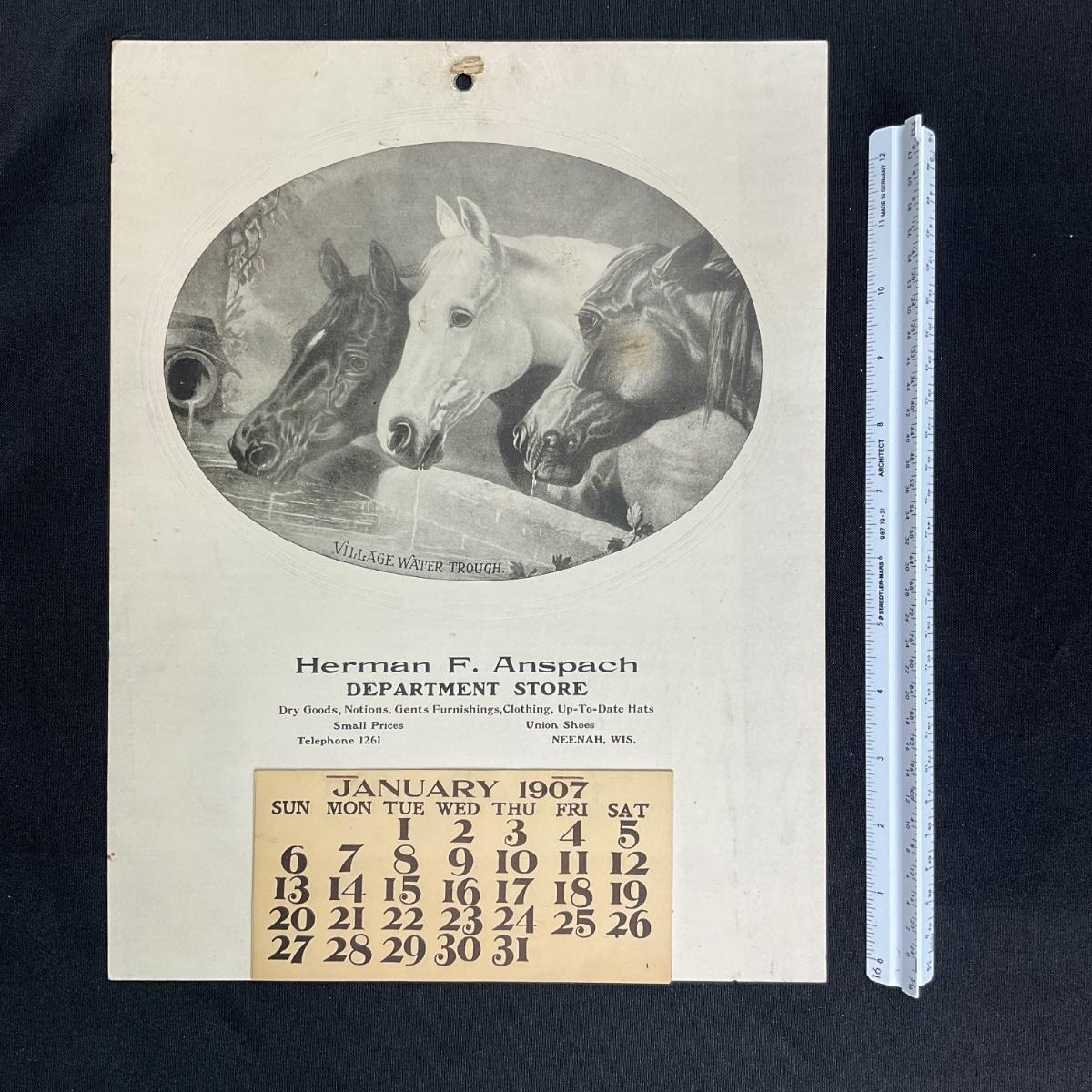 This calendar was courtesy of Herman F. Anspach's Department store. Specializing in Dry Goods, Notions, Gents Furnishings, Clothing, Up-To-Date Hats. Small Prices. Union Shoes. This calendar is complete, showing January 1907. The calendar features a picture titled "Village Water Trough", original by M N Alex, copyright 1906. The picture features 3 horses doing at a trough. The calendar measures 10 3/4" x 14 1/8". **|** Please see photos for details and condition. ::: Shipping is available on this lot. If you require shipping you must let us know at the close of the auction. We will coordinate with you after the item has been won. Shipping fees will include insurance up to or exceeding the value of all items being mailed. If you have any questions regarding this lot please contact the auctioneer either via this website, by direct email or by phone. PICK UP TIMES and other important information can be found in the TERMS and DESCRIPTION of the auction. Please take a look for pertinent information. Thanks!