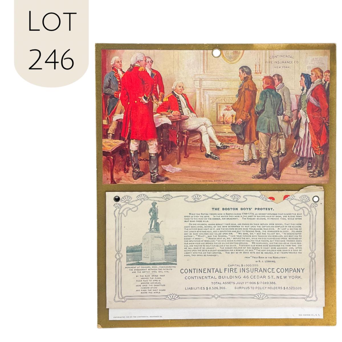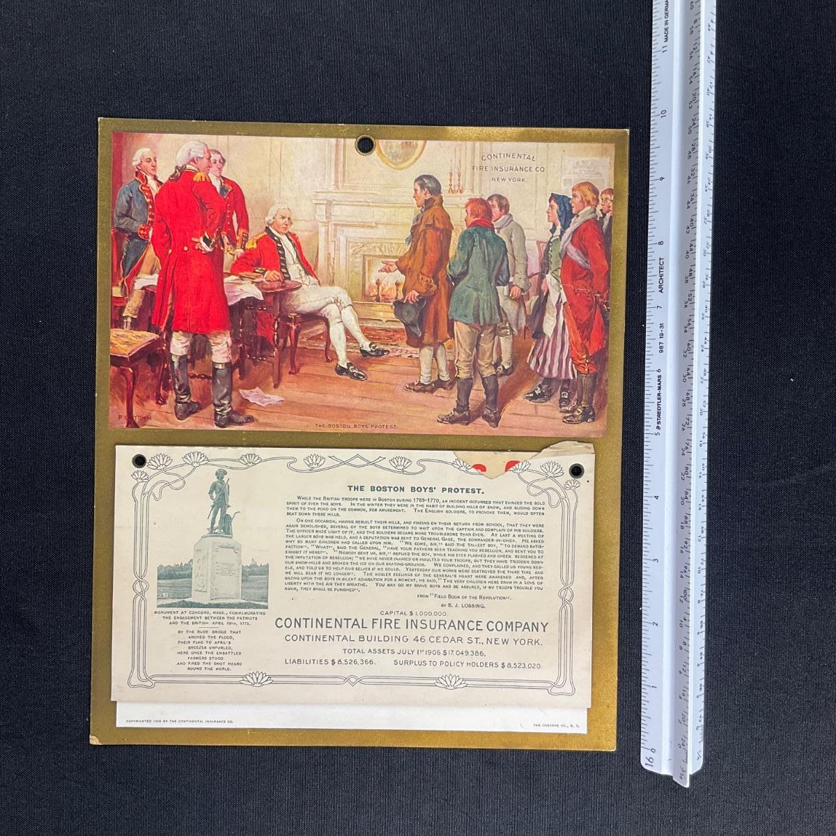 This calendar was compliments of the Continental Fire Insurance Company of New York. This calendar features a picture titled "The Boston Boys Protest", depicting meeting between the British and Boston Citizens, original painting by F C Yohn, copyright 1906. The calendar was printed by The Osbourne Company of New York. This calendar is complete with cover page. The calendar measures 8 1/4" x 9 7/8". **|** Please see photos for details and condition. ::: Shipping is available on this lot. If you require shipping you must let us know at the close of the auction. We will coordinate with you after the item has been won. Shipping fees will include insurance up to or exceeding the value of all items being mailed. If you have any questions regarding this lot please contact the auctioneer either via this website, by direct email or by phone. PICK UP TIMES and other important information can be found in the TERMS and DESCRIPTION of the auction. Please take a look for pertinent information. Thanks!