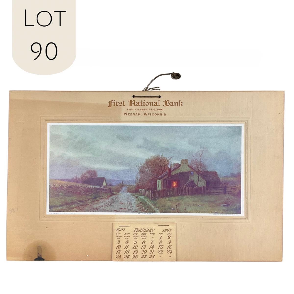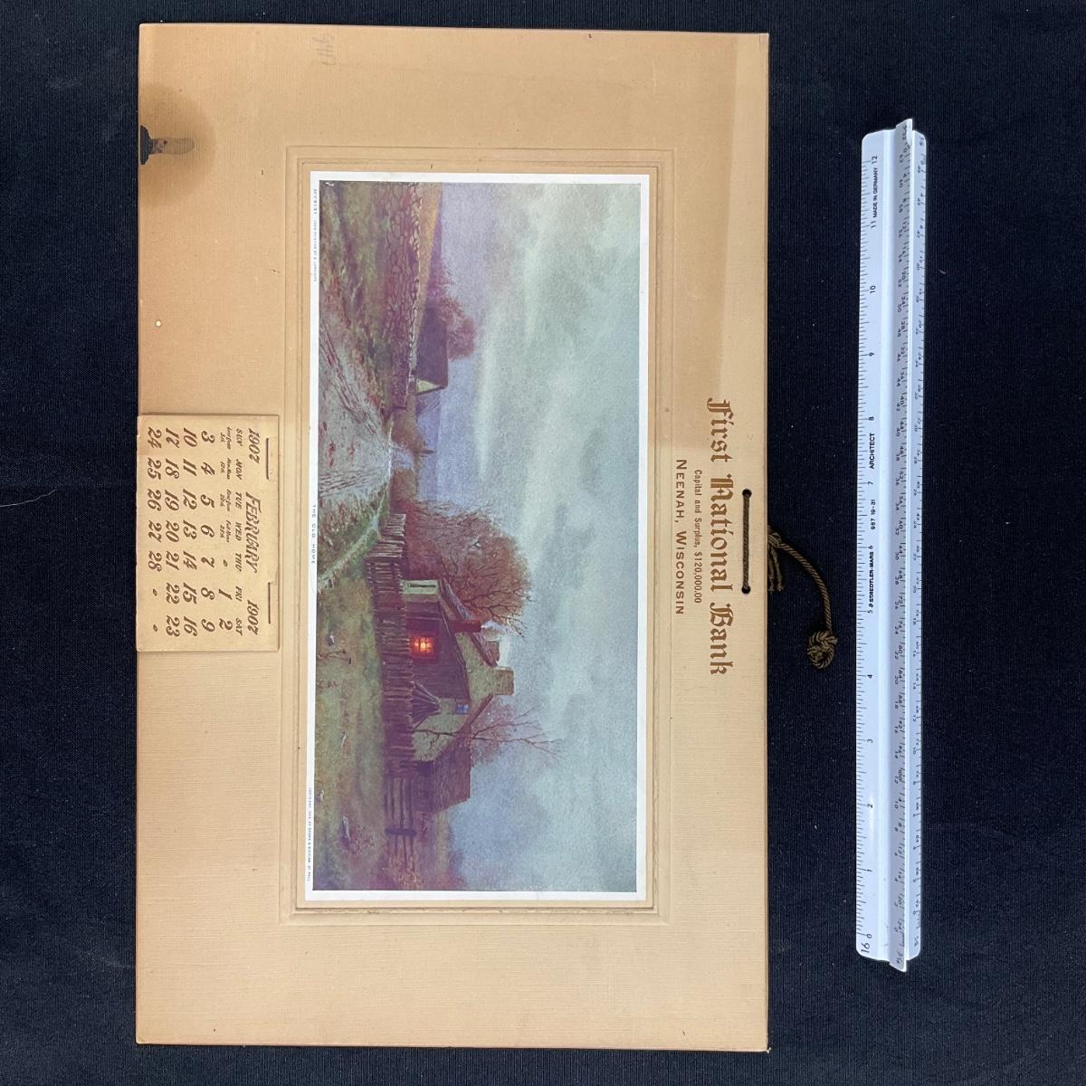 This calendar was compliments of the First National Bank of Neenah, Wisconsin. This calendar features a picture titled "The Old Home", original painting by E LaMasure, copyright 1905 Brown & Bigelow, St Paul Minnesota. The picture depicts a country homestead at dusk or maybe just before dawn. The calendar is not complete, showing February 1907. The calendar measures 15 3/4" x 9 3/4". **|** Please see photos for details and condition. ::: Shipping is available on this lot. If you require shipping you must let us know at the close of the auction. We will coordinate with you after the item has been won. Shipping fees will include insurance up to or exceeding the value of all items being mailed. If you have any questions regarding this lot please contact the auctioneer either via this website, by direct email or by phone. PICK UP TIMES and other important information can be found in the TERMS and DESCRIPTION of the auction. Please take a look for pertinent information. Thanks!