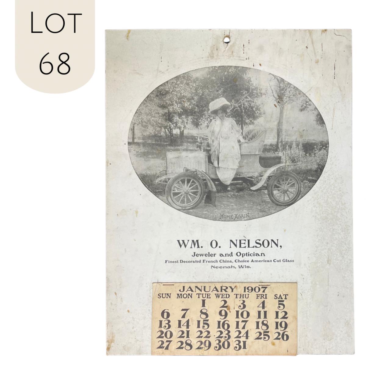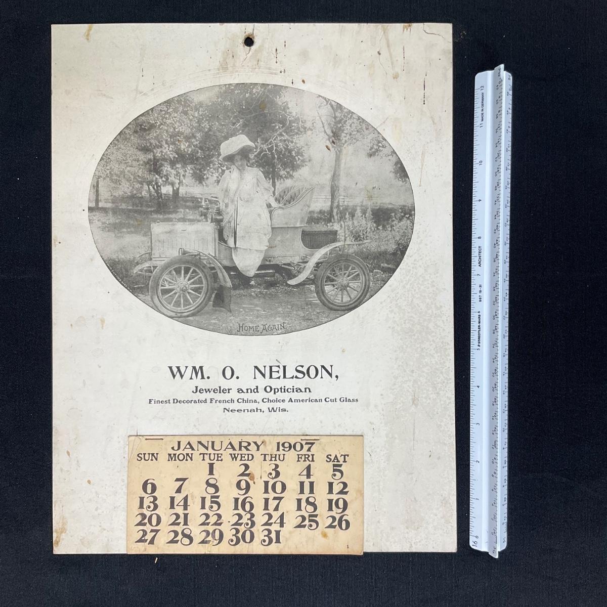 This calendar was compliments of WM. O Nelson, a Jeweler and Optician in Neenah Wisconsin. The calendar reminds you that they carry the Finest Decorated French China, and Choice American Cut Glass. The featured photo is titled "Home Again" accredited to M N Alex, copyright 1906. The picture depicts a Woman stepping out of a car of the time. The Calendar measures 10 3/4" x 14". **|** Please see photos for details and condition. ::: Shipping is available on this lot. If you require shipping you must let us know at the close of the auction. We will coordinate with you after the item has been won. Shipping fees will include insurance up to or exceeding the value of all items being mailed. If you have any questions regarding this lot please contact the auctioneer either via this website, by direct email or by phone. PICK UP TIMES and other important information can be found in the TERMS and DESCRIPTION of the auction. Please take a look for pertinent information. Thanks!