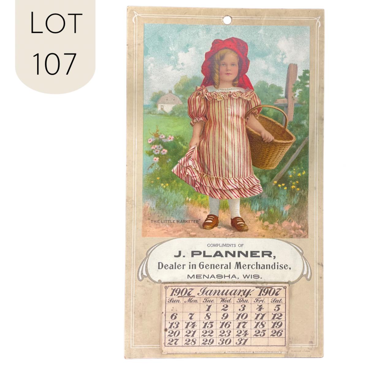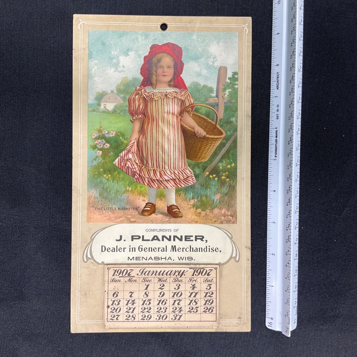 This calendar was compliments of J. Planner, a dealer in General Merchandise in Menasha Wisconsin. The calendar features a picture titled "The Little Marketer", no artist noted. The picture depicts a little girl with an empty basket and a red bonnet ready to head to the market. This calendar is complete, showing January 1907. The calendar was produced by the Milwaukee Litho Company. This calendar measures 5 3/8" x 10". **|** Please see photos for details and condition. ::: Shipping is available on this lot. If you require shipping you must let us know at the close of the auction. We will coordinate with you after the item has been won. Shipping fees will include insurance up to or exceeding the value of all items being mailed. If you have any questions regarding this lot please contact the auctioneer either via this website, by direct email or by phone. PICK UP TIMES and other important information can be found in the TERMS and DESCRIPTION of the auction. Please take a look for pertinent information. Thanks!