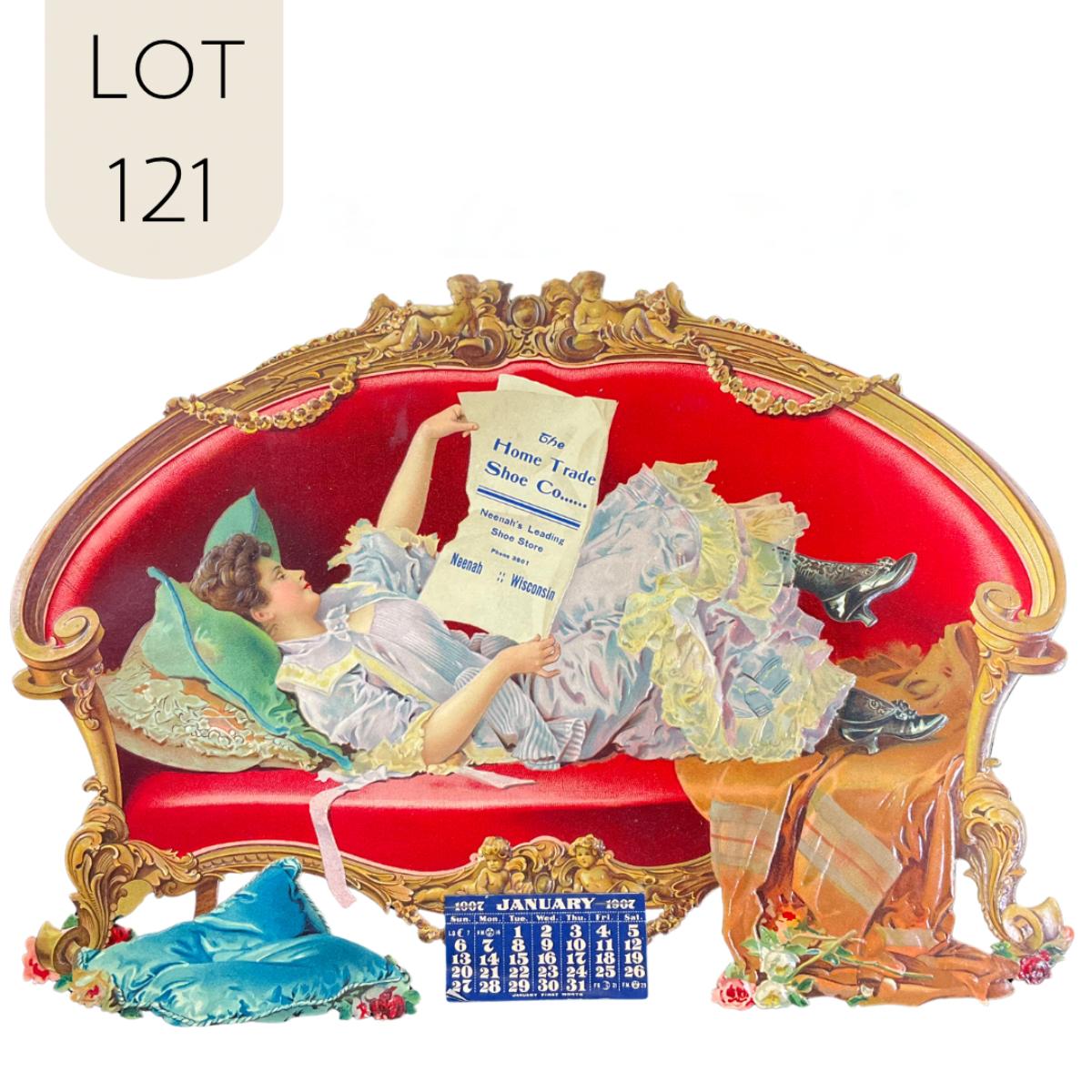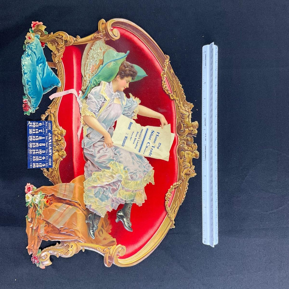 This Die-Cut calendar was courtesy of the Home Trade Shoe Company, located in Neenah, Wisconsin. Neenah's leading shoes store! This calendar is bright, vibrant AND complete, showing January 1907. This calendar features a woman laying on a chaise reading an advertisement for the aforementioned store. This calendar measures a whopping 15 5/8" x 11 1/8". **|** Please see photos for details and condition. ::: Shipping is available on this lot. If you require shipping you must let us know at the close of the auction. We will coordinate with you after the item has been won. Shipping fees will include insurance up to or exceeding the value of all items being mailed. If you have any questions regarding this lot please contact the auctioneer either via this website, by direct email or by phone. PICK UP TIMES and other important information can be found in the TERMS and DESCRIPTION of the auction. Please take a look for pertinent information. Thanks!
