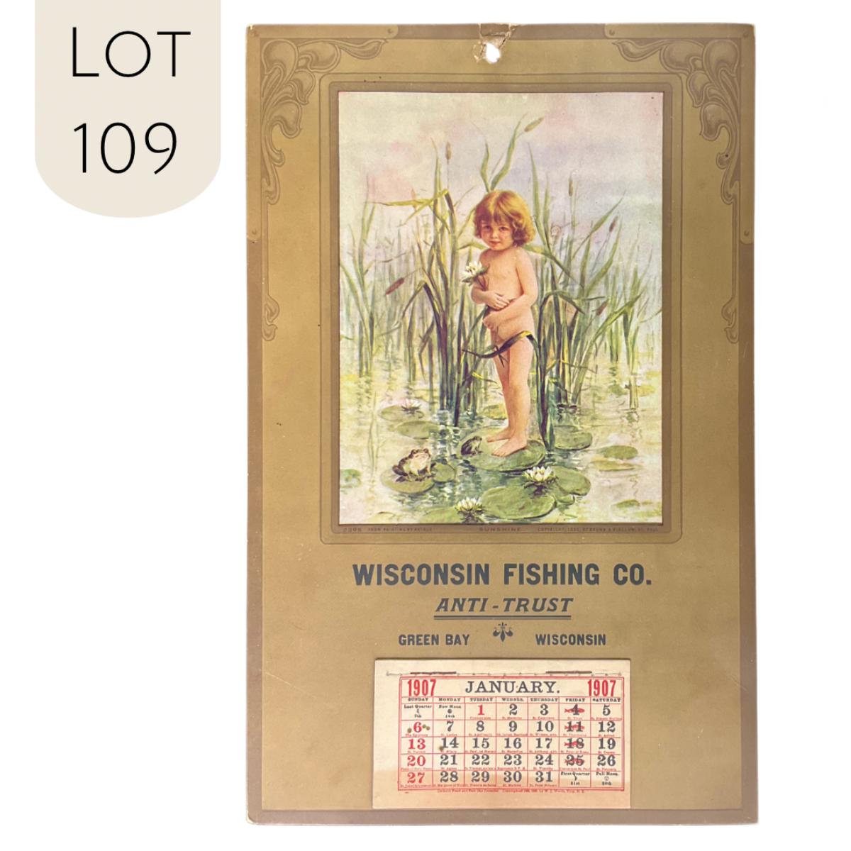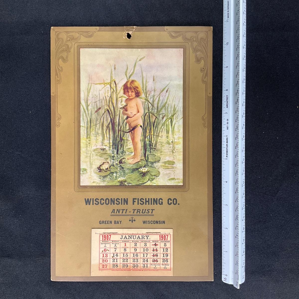 This calendar was compliments of the Wisconsin Fishing Company, Anti Trust, located in Green Bay Wisconsin. This calendar features a picture titled "Sunshine", original by James Arthur. The picture depicts a child standing on a lily pad, amongst frogs and cattails. The calendar was copyright 1904, Brown and Bigelow, St Paul. This calendar is complete, showing January 1907. This calendar measures 7" x 11" **|** Please see photos for details and condition. ::: Shipping is available on this lot. If you require shipping you must let us know at the close of the auction. We will coordinate with you after the item has been won. Shipping fees will include insurance up to or exceeding the value of all items being mailed. If you have any questions regarding this lot please contact the auctioneer either via this website, by direct email or by phone. PICK UP TIMES and other important information can be found in the TERMS and DESCRIPTION of the auction. Please take a look for pertinent information. Thanks!