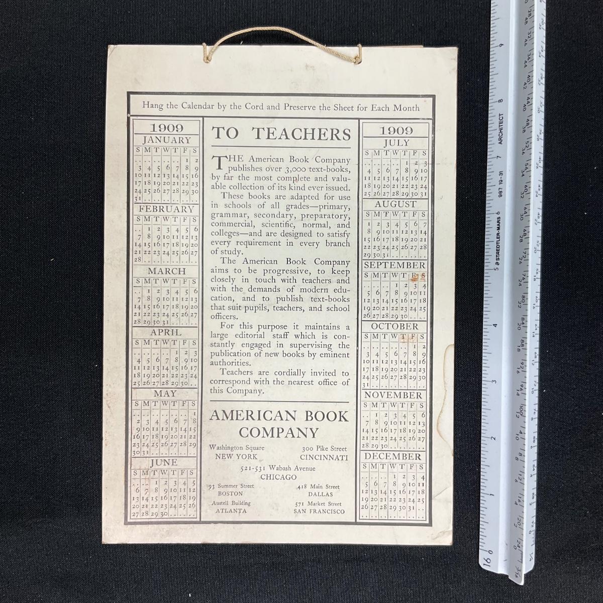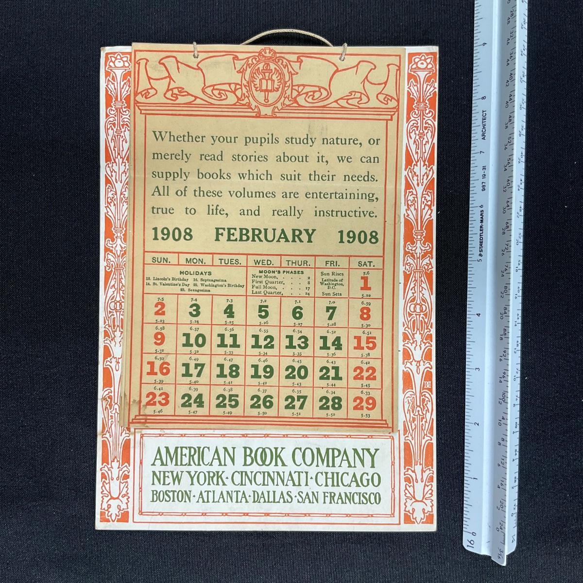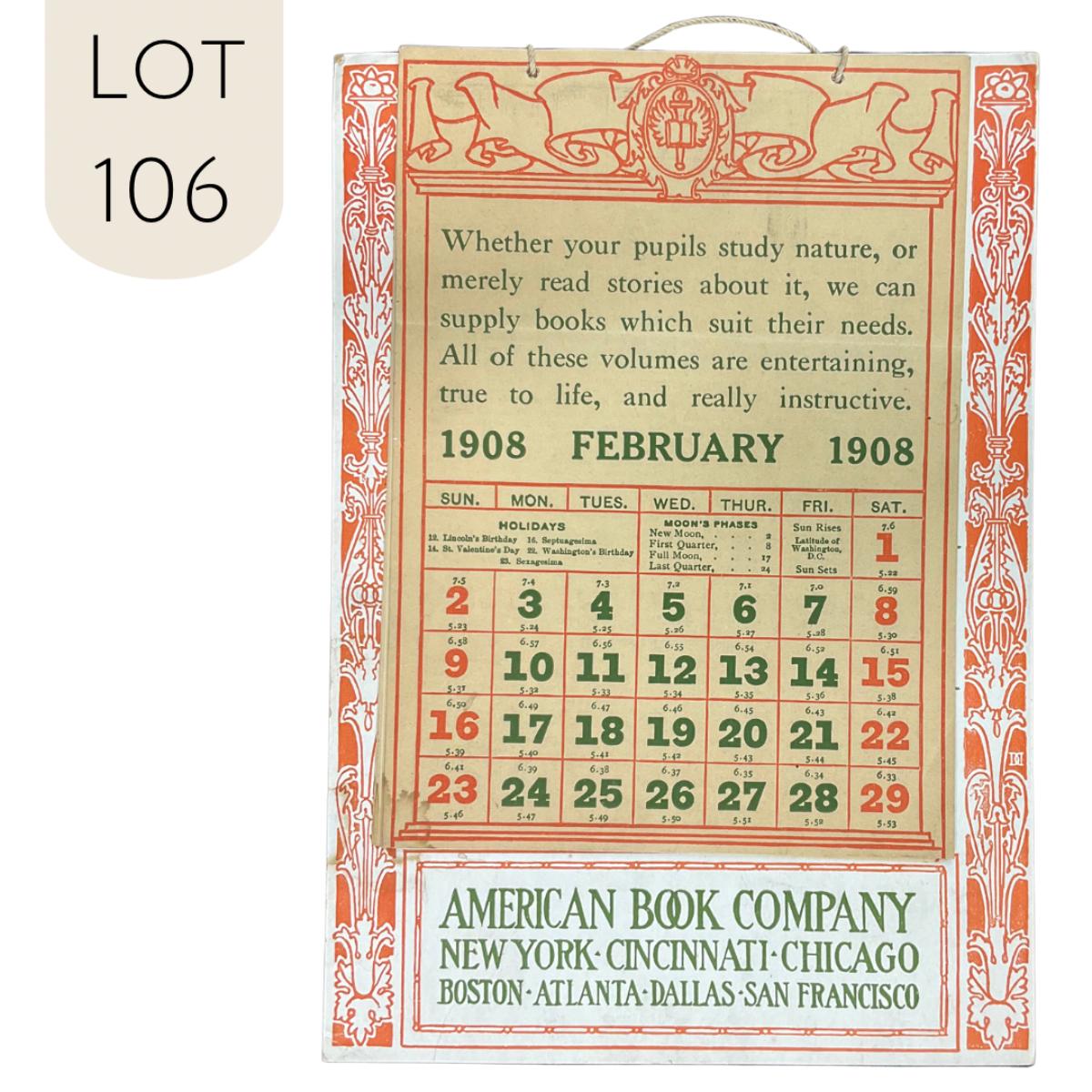 This calendar was published by the American Book Company in 1908. The calendar is incomplete, showing February 1908. Each page has different verbiage for book lovers, teachers and students. The American Book Company had branches in New York, Cincinnati, Chicago, Boston, Atlanta, Dallas, and San Francisco. This calendar measures 6 1/4" x 8 7/8". **|** Please see photos for details and condition. ::: Shipping is available on this lot. If you require shipping you must let us know at the close of the auction. We will coordinate with you after the item has been won. Shipping fees will include insurance up to or exceeding the value of all items being mailed. If you have any questions regarding this lot please contact the auctioneer either via this website, by direct email or by phone. PICK UP TIMES and other important information can be found in the TERMS and DESCRIPTION of the auction. Please take a look for pertinent information. Thanks!
