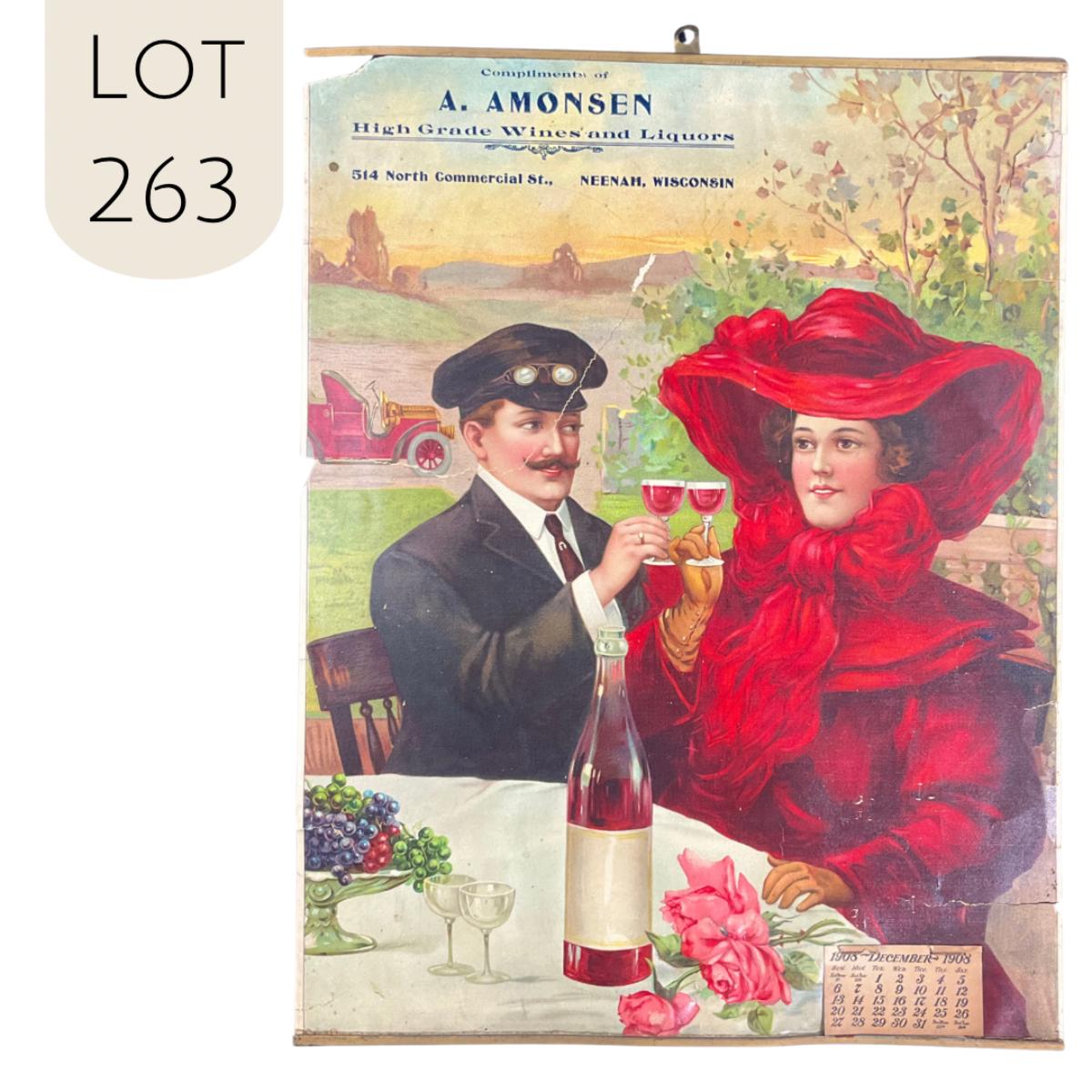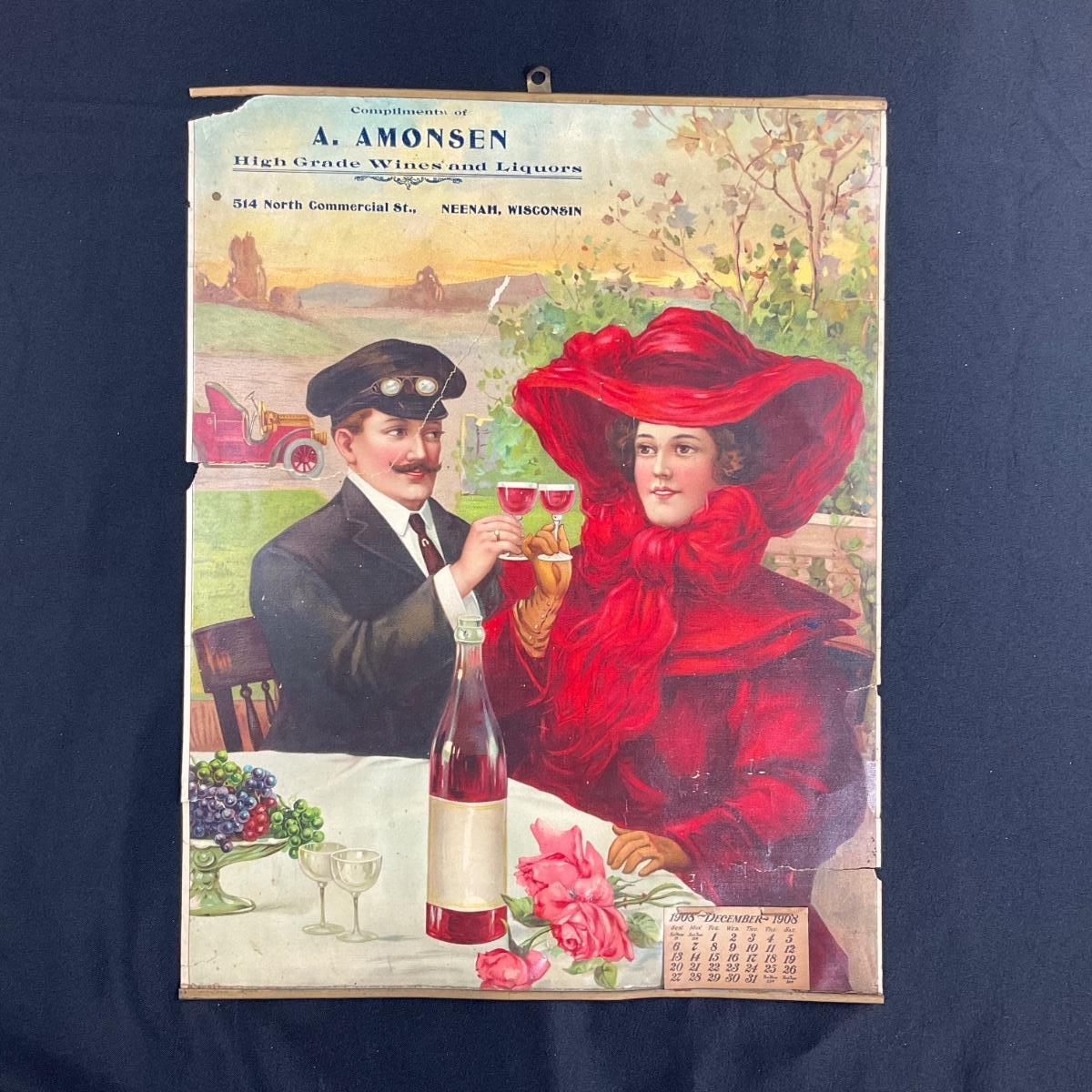 This bright vibrant calendar was compliments of A. Amonsen, seller of High Grade Wines and Liquors in Neenah Wisconsin. This calendar is incomplete, showing December 1908. The calendar features a picture of a couple toasting, her in her fanciful red outfit, and him in his riding attire, complete with glasses. This calendar measures 15" x 19 3/8". There is a LARGE rip that goes across the man's face. We have laid the calendar so that it looks the best that it can with that flaw. **|** Please see photos for details and condition. ::: Shipping is available on this lot. If you require shipping you must let us know at the close of the auction. We will coordinate with you after the item has been won. Shipping fees will include insurance up to or exceeding the value of all items being mailed. If you have any questions regarding this lot please contact the auctioneer either via this website, by direct email or by phone. PICK UP TIMES and other important information can be found in the TERMS and DESCRIPTION of the auction. Please take a look for pertinent information. Thanks!