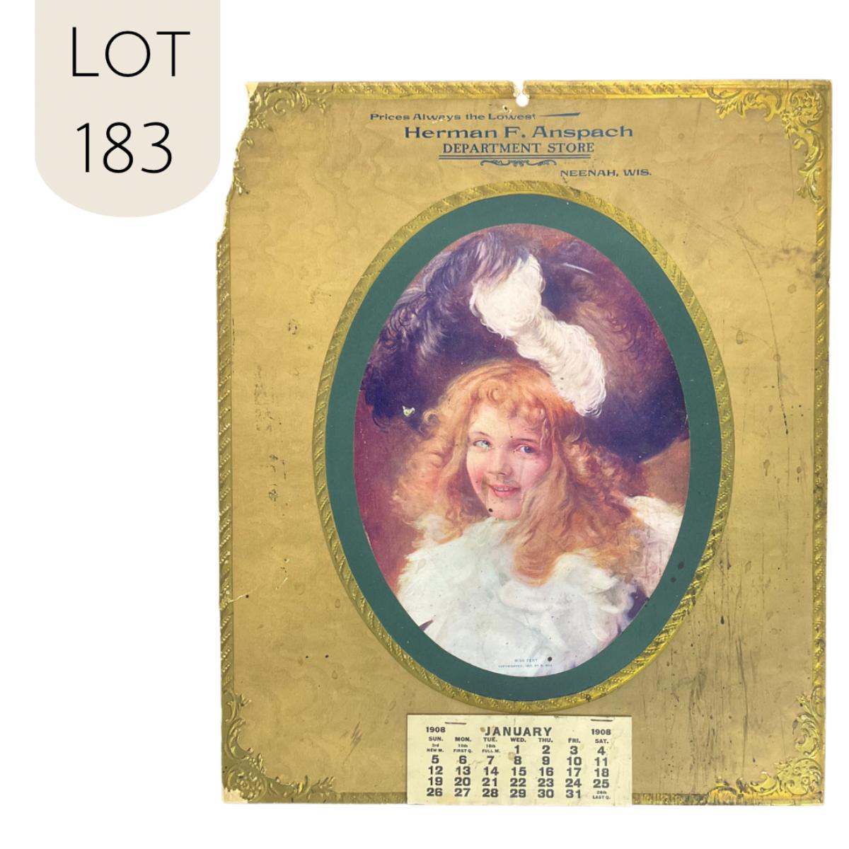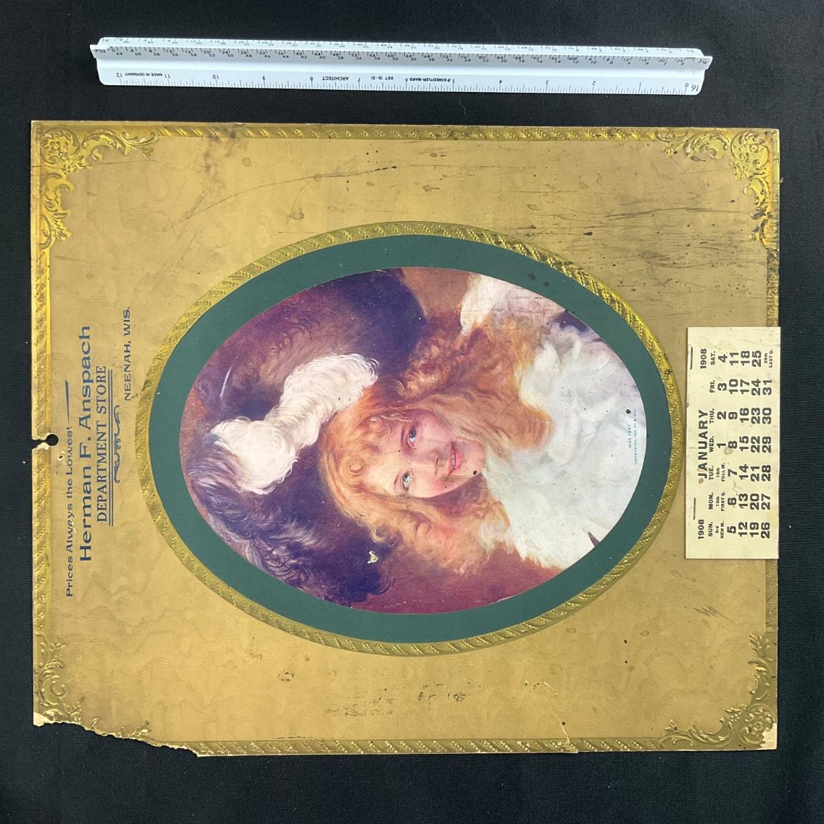 This calendar was produced for the Herman F Anspach Department Store in Neenah Wisconsin. This calendar features a portrait of a young girl in a feathered hat and boa titled "Miss Pert", original by R. Hill, copyright 1903. This calendar is complete, showing January 1908. This calendar measures 13 1/2" x 16". **|** Please see photos for details and condition. ::: Shipping is available on this lot. If you require shipping you must let us know at the close of the auction. We will coordinate with you after the item has been won. Shipping fees will include insurance up to or exceeding the value of all items being mailed. If you have any questions regarding this lot please contact the auctioneer either via this website, by direct email or by phone. PICK UP TIMES and other important information can be found in the TERMS and DESCRIPTION of the auction. Please take a look for pertinent information. Thanks!