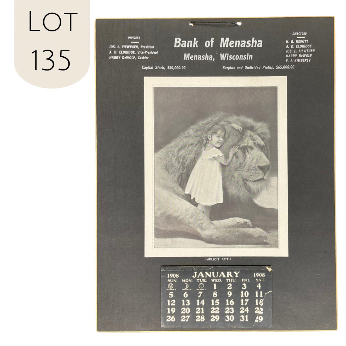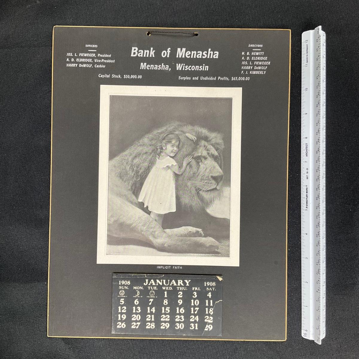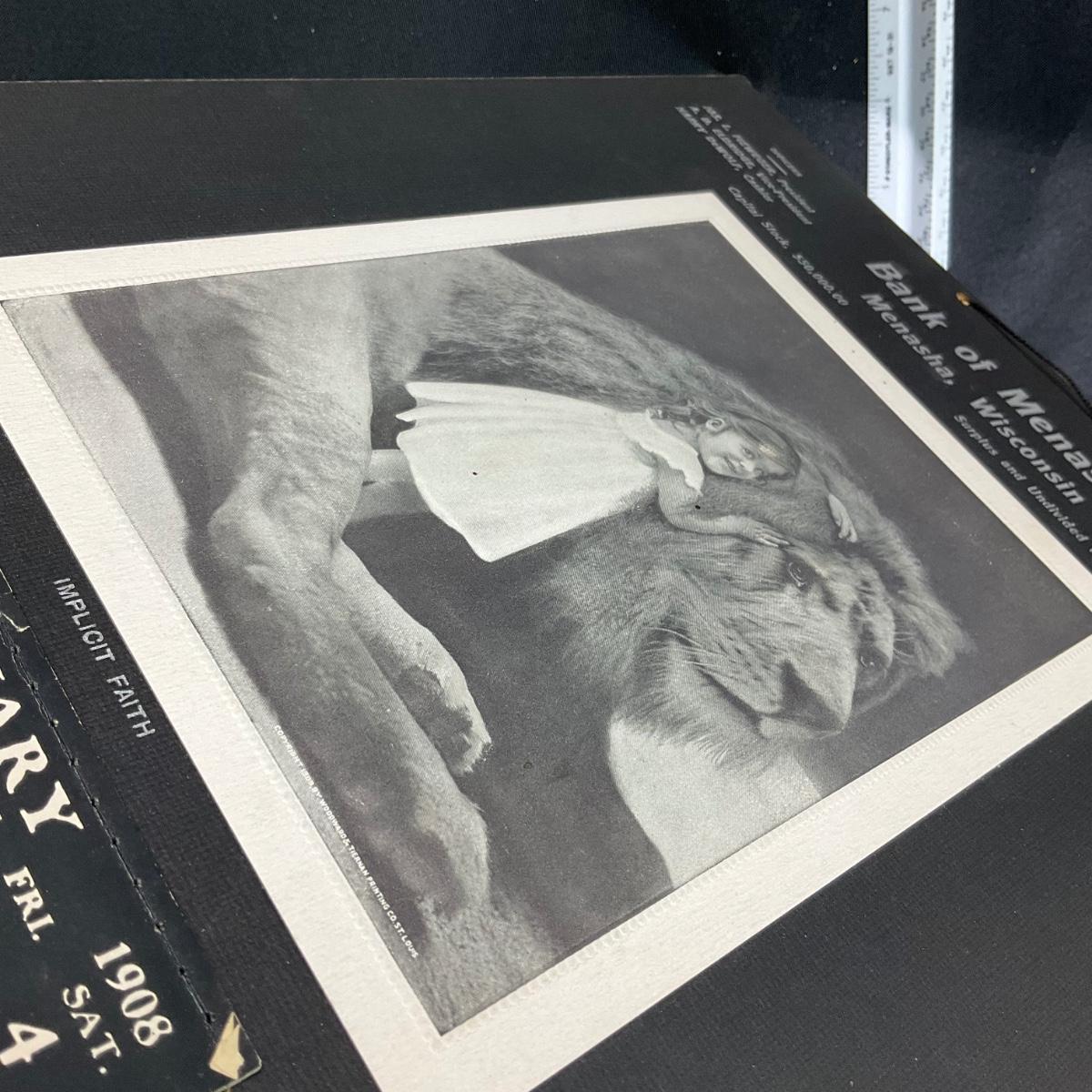 This calendar was compliments of the Bank of Menasha, located in Menasha Wisconsin. The calendar features a picture titled "Implicit Faith", depicting a young girl with her arms draped onto a lion's mane. This calendar is copyright 1908, Woodward & Tiernan Printing Company of St Louis. This calendar has a raised appearance to it, which I tried to show by angling the calendar. The calendar is complete, showing January 1908. This calendar measures 10" x 13". **|** Please see photos for details and condition. ::: Shipping is available on this lot. If you require shipping you must let us know at the close of the auction. We will coordinate with you after the item has been won. Shipping fees will include insurance up to or exceeding the value of all items being mailed. If you have any questions regarding this lot please contact the auctioneer either via this website, by direct email or by phone. PICK UP TIMES and other important information can be found in the TERMS and DESCRIPTION of the auction. Please take a look for pertinent information. Thanks!
