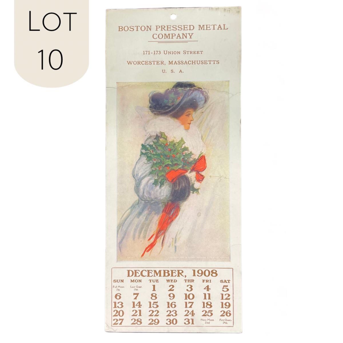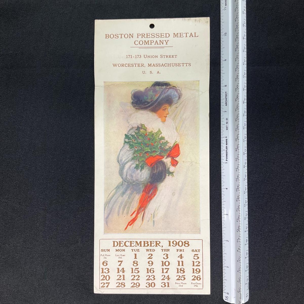 This calendar is one twelfth of what was a promotional item from the Boston Pressed Metal Company. You can find similar cards in the auction. This piece is dated 1908, and is in excellent condition. Calendar measures 4 1/2" x 10 3/4". Calendar is style number 5311, Picture is "Edith" original by Hamilton King. **|** Please see photos for details and condition. ::: Shipping is available on this lot. If you require shipping you must let us know at the close of the auction. We will coordinate with you after the item has been won. Shipping fees will include insurance up to or exceeding the value of all items being mailed. If you have any questions regarding this lot please contact the auctioneer either via this website, by direct email or by phone. PICK UP TIMES and other important information can be found in the TERMS and DESCRIPTION of the auction. Please take a look for pertinent information. Thanks!
