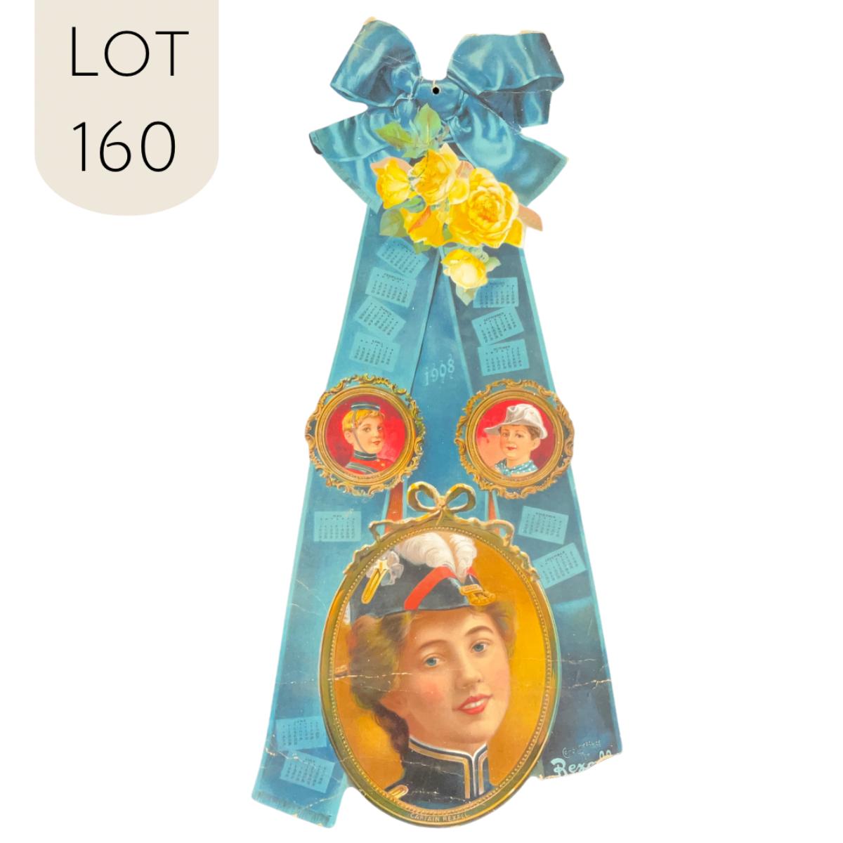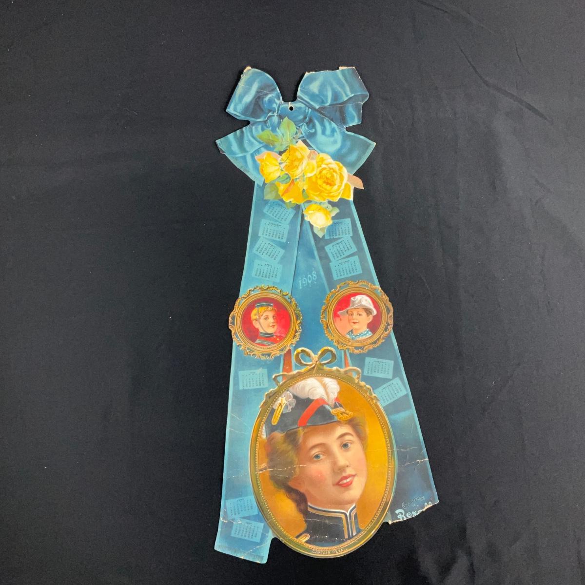 This calendar was compliments of the Rexall Company. This full-color single page calendar is complete as far as the calendar goes, please note the missing piece on the bottom right. This calendar features a portrait of a young woman in a military hat (Captain Rexall) and two young children framed above her. The whole calendar is a large blue ribbon - it's quite impressive! The calendar measures 13" x 28". **|** Please see photos for details and condition. ::: Shipping is available on this lot. If you require shipping you must let us know at the close of the auction. We will coordinate with you after the item has been won. Shipping fees will include insurance up to or exceeding the value of all items being mailed. If you have any questions regarding this lot please contact the auctioneer either via this website, by direct email or by phone. PICK UP TIMES and other important information can be found in the TERMS and DESCRIPTION of the auction. Please take a look for pertinent information. Thanks!