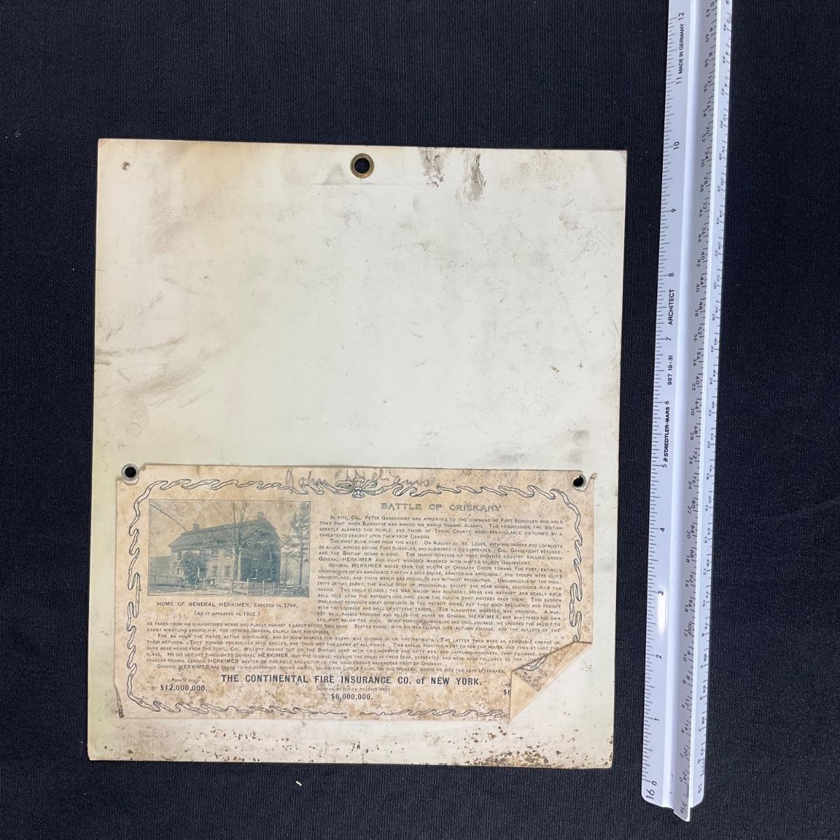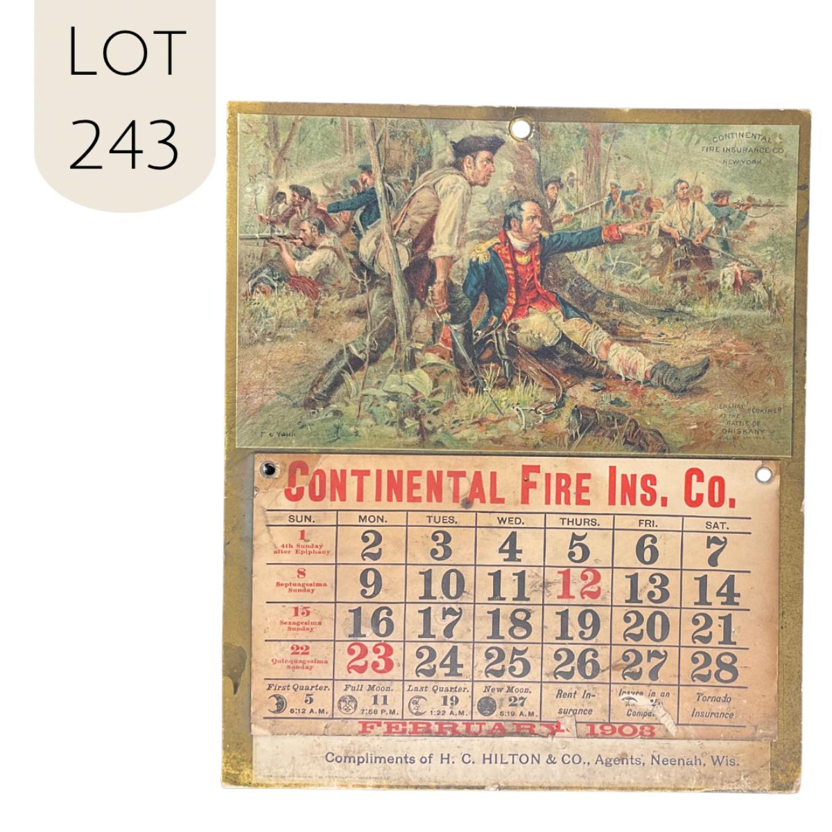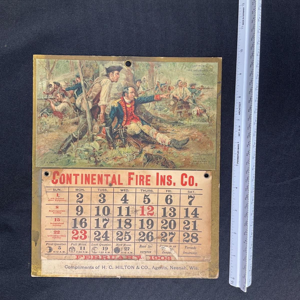 This calendar was compliments of H C Hilton & Co., Agents for the Continental Fire Insurance Company of Neenah Wisconsin. This calendar features a picture of a battle scene titled "General Herkimer at the Battle of Oriskany, August 3, 1777". The original painting was by F C Yohn, copyright 1902, Gray Litho Company of New York. This calendar is incomplete, showing February 1908. This calendar measures 8 1/4" x 9 3/4". **|** Please see photos for details and condition. ::: Shipping is available on this lot. If you require shipping you must let us know at the close of the auction. We will coordinate with you after the item has been won. Shipping fees will include insurance up to or exceeding the value of all items being mailed. If you have any questions regarding this lot please contact the auctioneer either via this website, by direct email or by phone. PICK UP TIMES and other important information can be found in the TERMS and DESCRIPTION of the auction. Please take a look for pertinent information. Thanks!