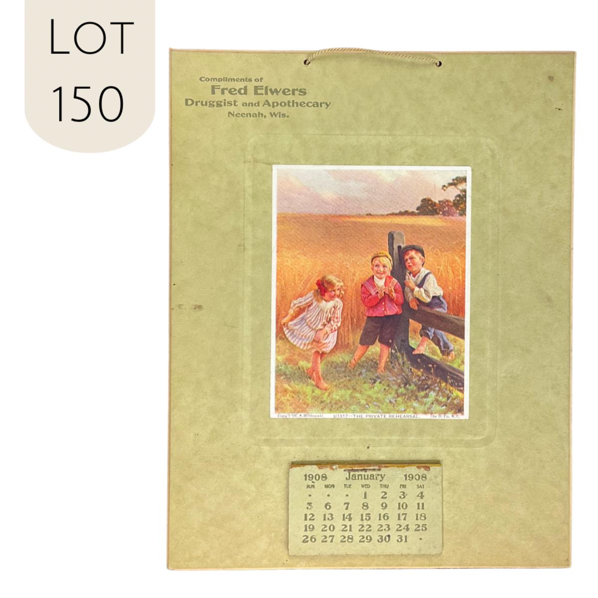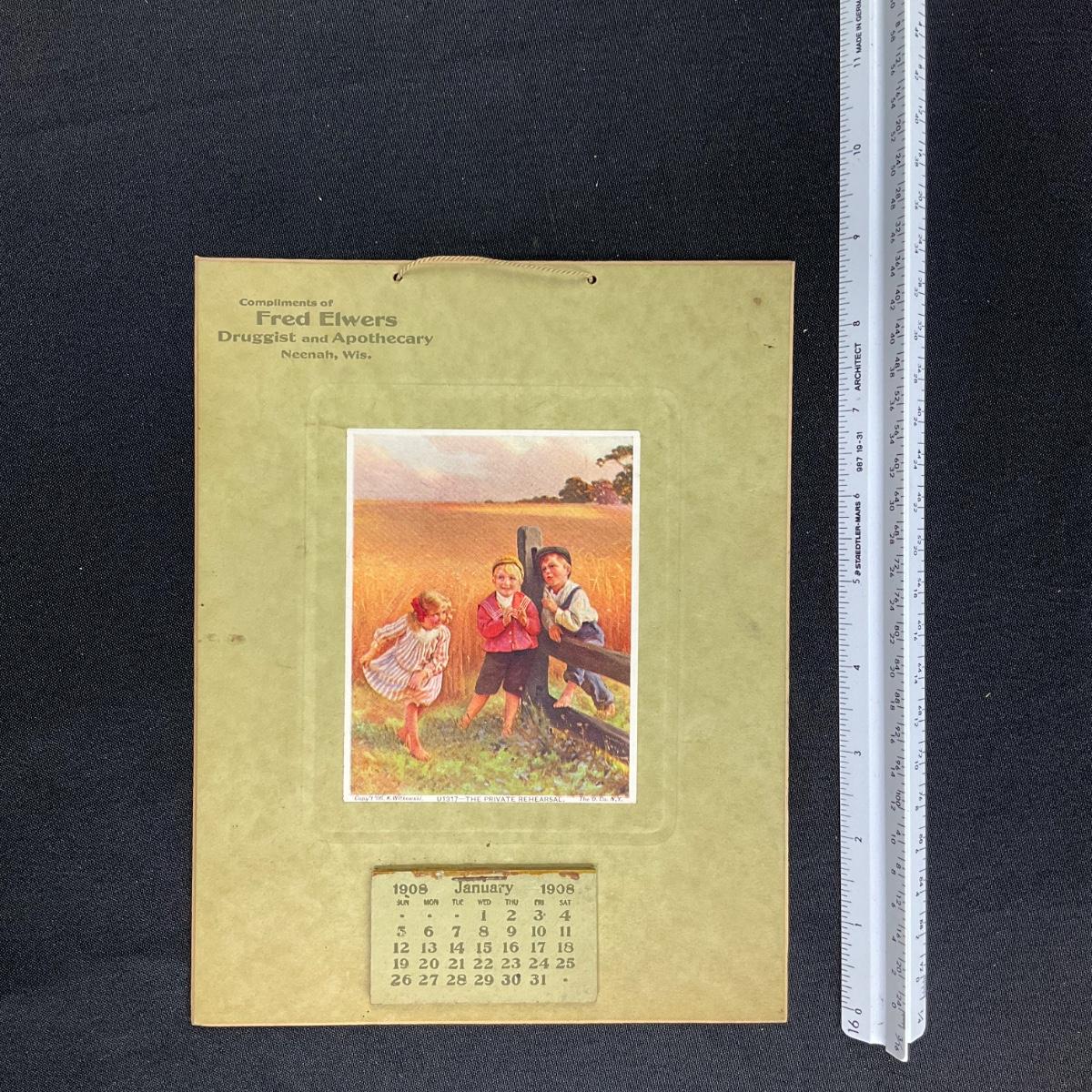 This calendar was compliments of Fred Elwers, Druggist and Apothecary in Neenah Wisconsin. This calendar is complete, showing January 1908. The calendar features a picture titled "The Private Rehearsal", original by Karl Witkowski, copyright 1906. The picture depicts a country scene with a fence and three children rehearsing. The calendar was printed by the Osbourne Company of New York. The calendar measures 7" x 9". **|** Please see photos for details and condition. ::: Shipping is available on this lot. If you require shipping you must let us know at the close of the auction. We will coordinate with you after the item has been won. Shipping fees will include insurance up to or exceeding the value of all items being mailed. If you have any questions regarding this lot please contact the auctioneer either via this website, by direct email or by phone. PICK UP TIMES and other important information can be found in the TERMS and DESCRIPTION of the auction. Please take a look for pertinent information. Thanks!