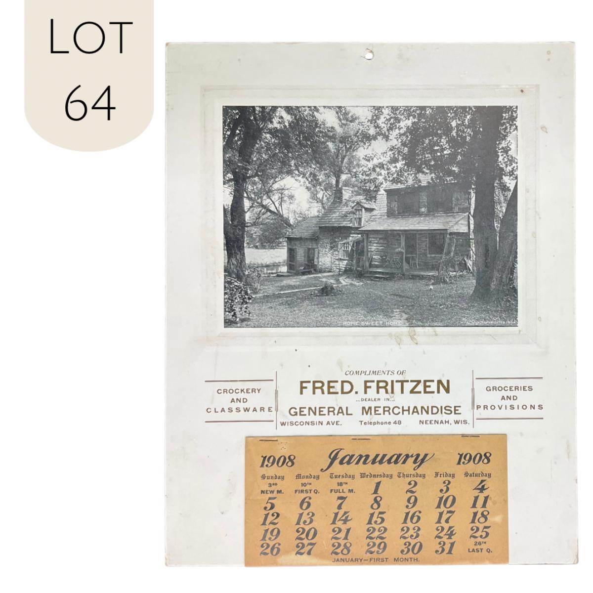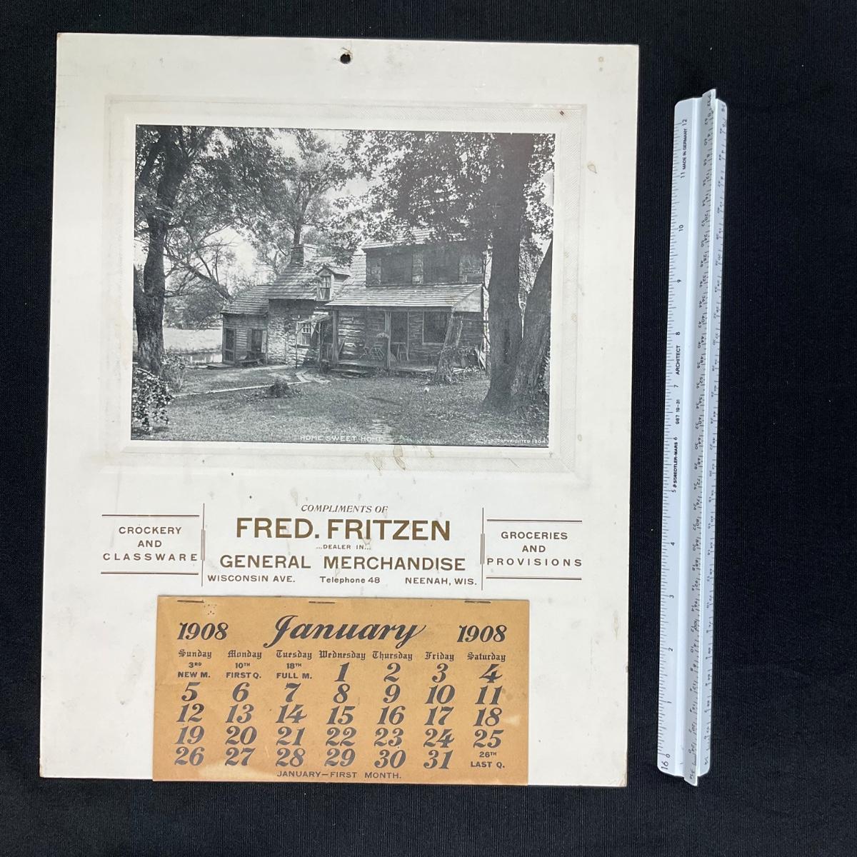 This calendar, compliments of Fred Fritzen in Neenah Wisconsin features a photo titled "Home Sweet Home", accredited to R. Hill. The picture depicts a Country Homestead with large trees on either side. The calendar is complete, showing January 1908. The calendar measures 11" x 14". Calendar is copyright 1904, R. Hill. **|** Please see photos for details and condition. ::: Shipping is available on this lot. If you require shipping you must let us know at the close of the auction. We will coordinate with you after the item has been won. Shipping fees will include insurance up to or exceeding the value of all items being mailed. If you have any questions regarding this lot please contact the auctioneer either via this website, by direct email or by phone. PICK UP TIMES and other important information can be found in the TERMS and DESCRIPTION of the auction. Please take a look for pertinent information. Thanks!