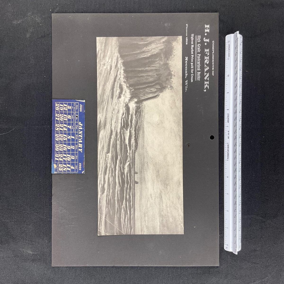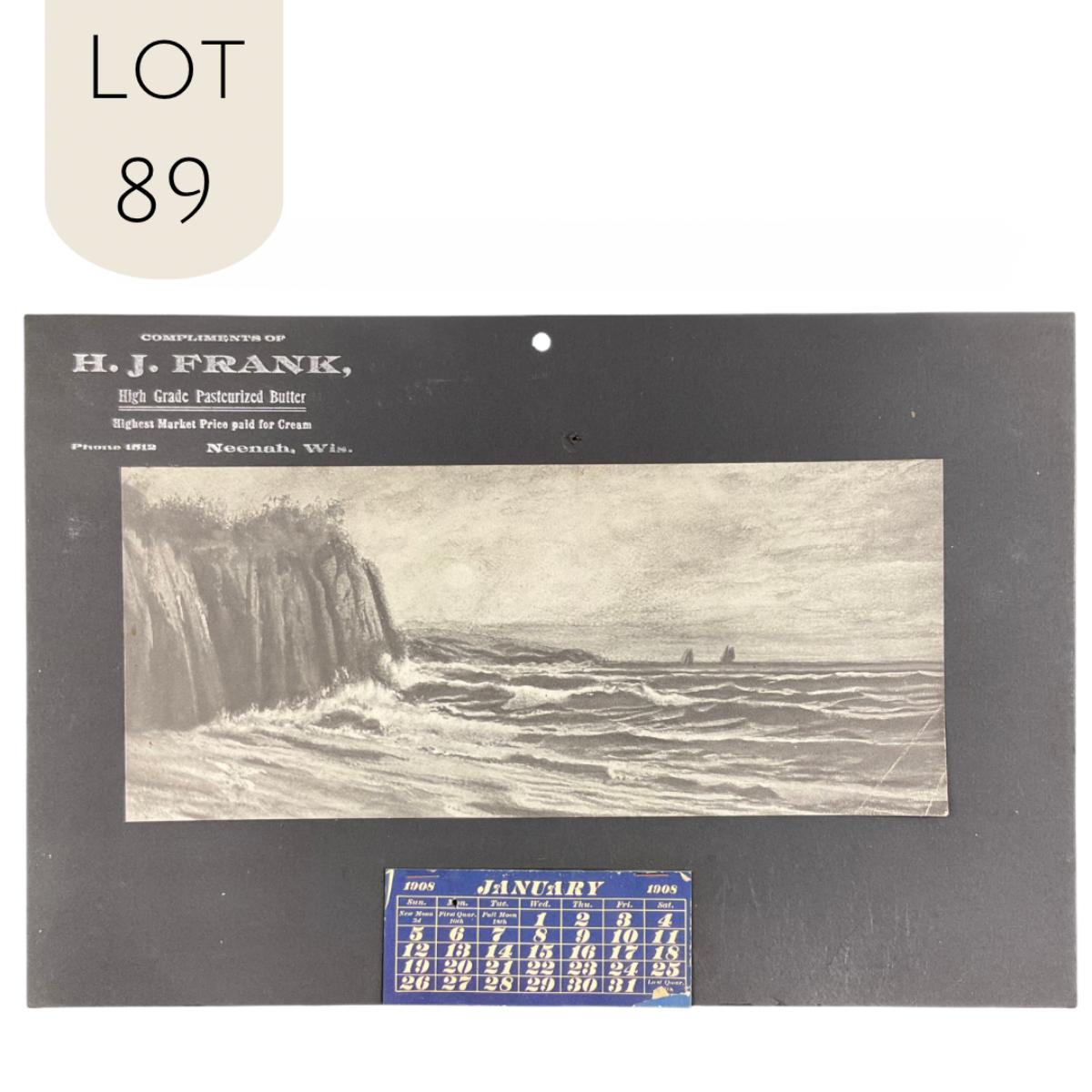 This calendar was complements of H J Frank, a proprietor of High Grade Pasteurized butter - Paying the highest market price for Cream! good to know! This calendar features a picture simply titled "No. 4", with no attribution to its creation. The picture depicts a seascape with a steep cliff on the left and ships way across in the distance. This calendar is complete, showing January 1908. The calendar measures 14 7/8" x 9 7/8". **|** Please see photos for details and condition. ::: Shipping is available on this lot. If you require shipping you must let us know at the close of the auction. We will coordinate with you after the item has been won. Shipping fees will include insurance up to or exceeding the value of all items being mailed. If you have any questions regarding this lot please contact the auctioneer either via this website, by direct email or by phone. PICK UP TIMES and other important information can be found in the TERMS and DESCRIPTION of the auction. Please take a look for pertinent information. Thanks!