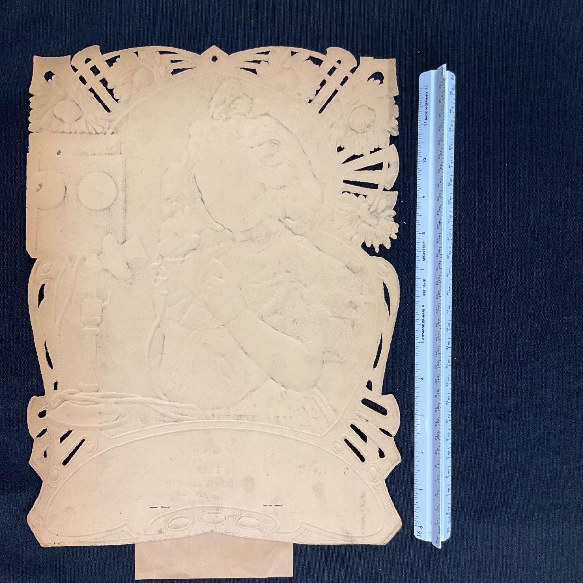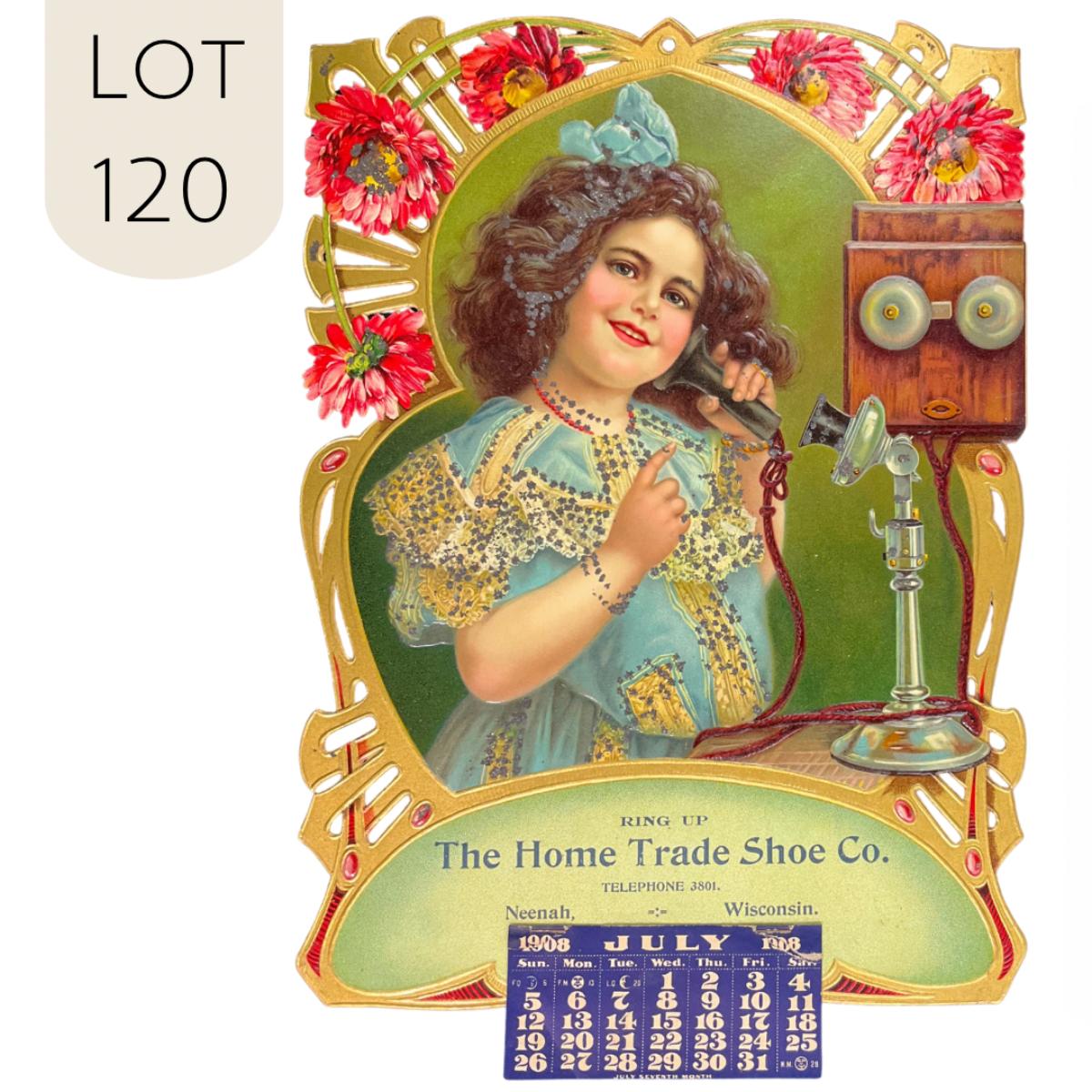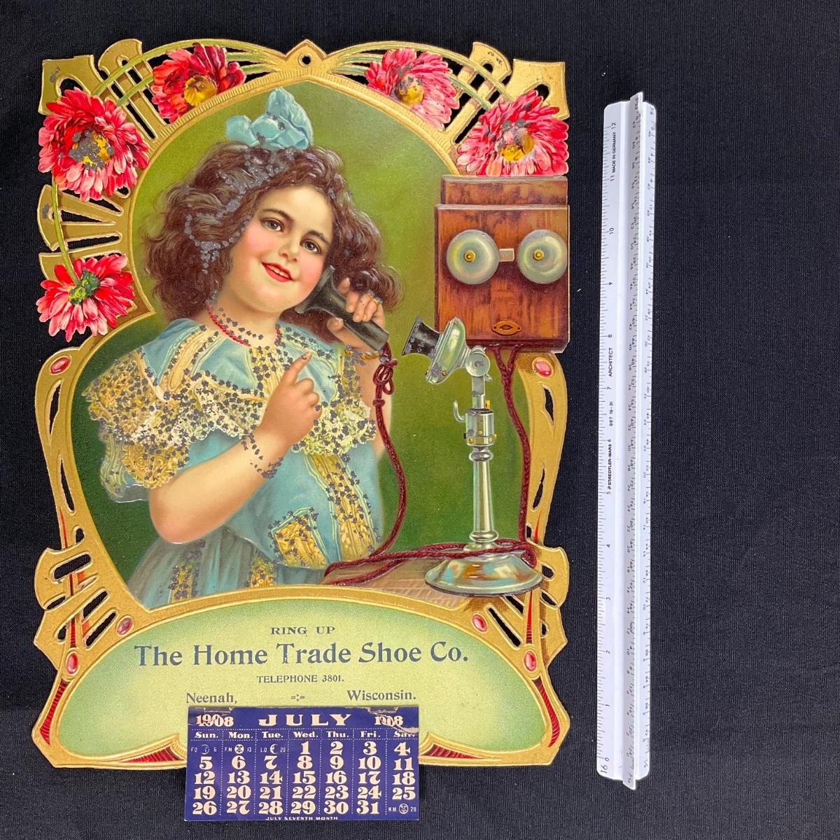 Thi Die-Cut Calendar was courtesy of The Home Trade Shoe Company (that has now dropped the hyphen?). This calendar is incomplete, showing July 1908 - but no one will be looking at that. This Die Cut calendar style was named "Ring Up" and features German Glitter in spaces. This calendar is beautiful and vibrant a spectacular example of calendars of that era. This calendar measures approximately 10 1/4" x 14 5/8". **|** Please see photos for details and condition. ::: Shipping is available on this lot. If you require shipping you must let us know at the close of the auction. We will coordinate with you after the item has been won. Shipping fees will include insurance up to or exceeding the value of all items being mailed. If you have any questions regarding this lot please contact the auctioneer either via this website, by direct email or by phone. PICK UP TIMES and other important information can be found in the TERMS and DESCRIPTION of the auction. Please take a look for pertinent information. Thanks!