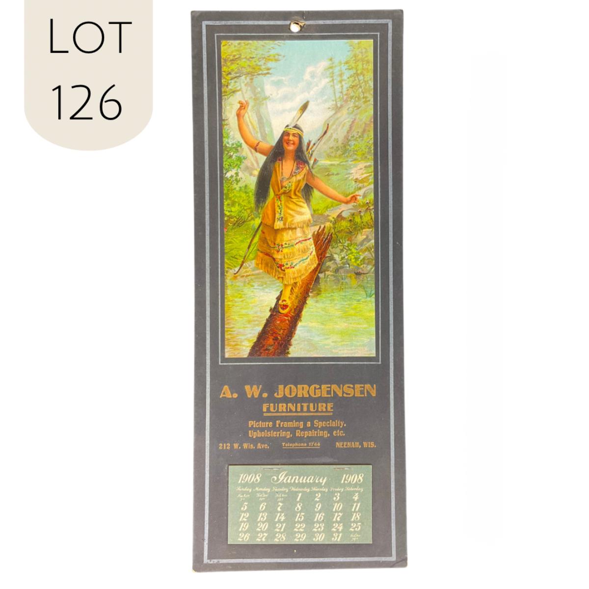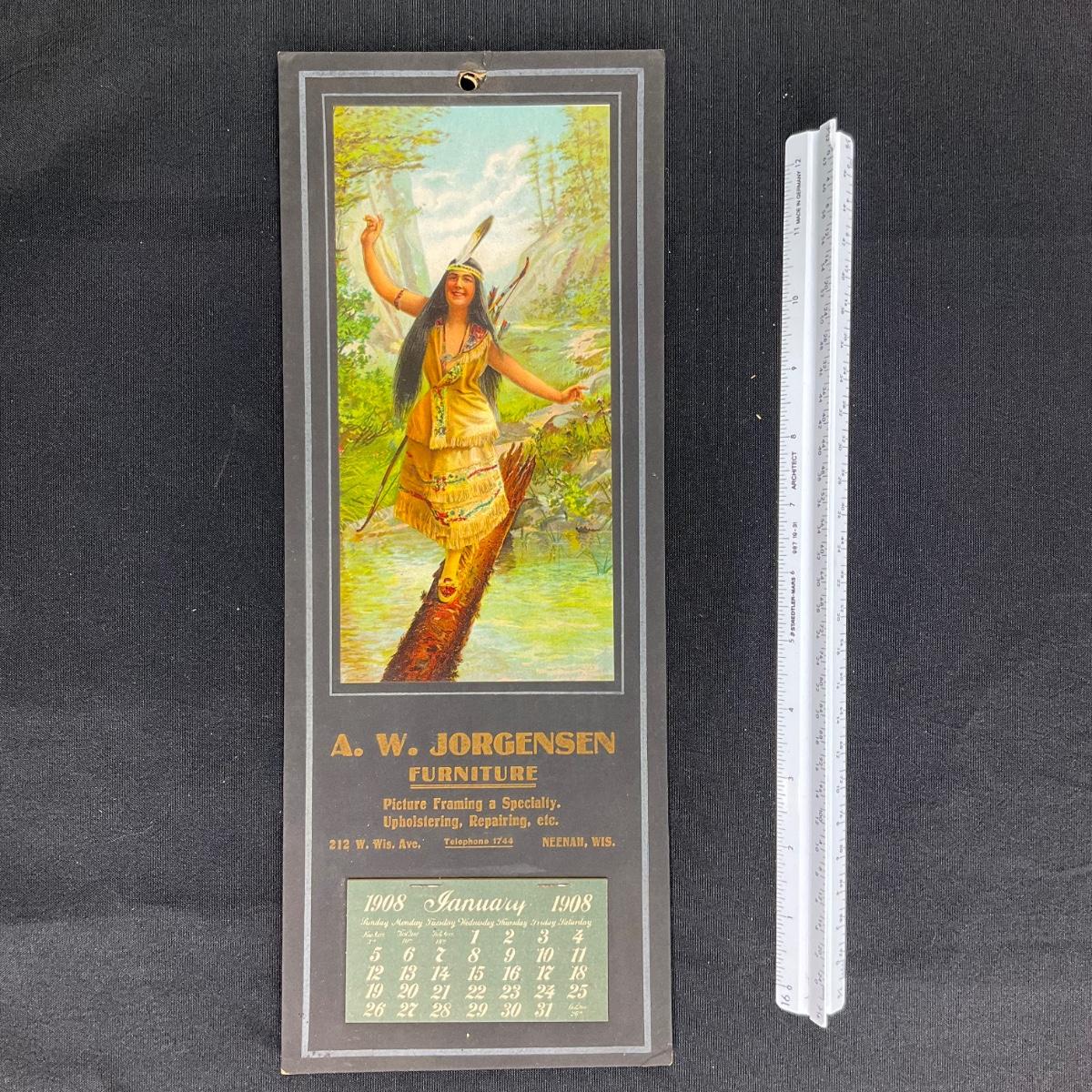 This calendar was compliments of A W Jorgensen furniture in Neenah, Wisconsin. They also specialized in Picture Framing, Upholstering, Reparing, etc. This calendar is complete, showing January 1908. The calendar features a picture of a Native American woman crossing a stream using a log as a bridge - with no known accreditation. This calendar measures 5 5/8" x 14 3/4". **|** Please see photos for details and condition. ::: Shipping is available on this lot. If you require shipping you must let us know at the close of the auction. We will coordinate with you after the item has been won. Shipping fees will include insurance up to or exceeding the value of all items being mailed. If you have any questions regarding this lot please contact the auctioneer either via this website, by direct email or by phone. PICK UP TIMES and other important information can be found in the TERMS and DESCRIPTION of the auction. Please take a look for pertinent information. Thanks!
