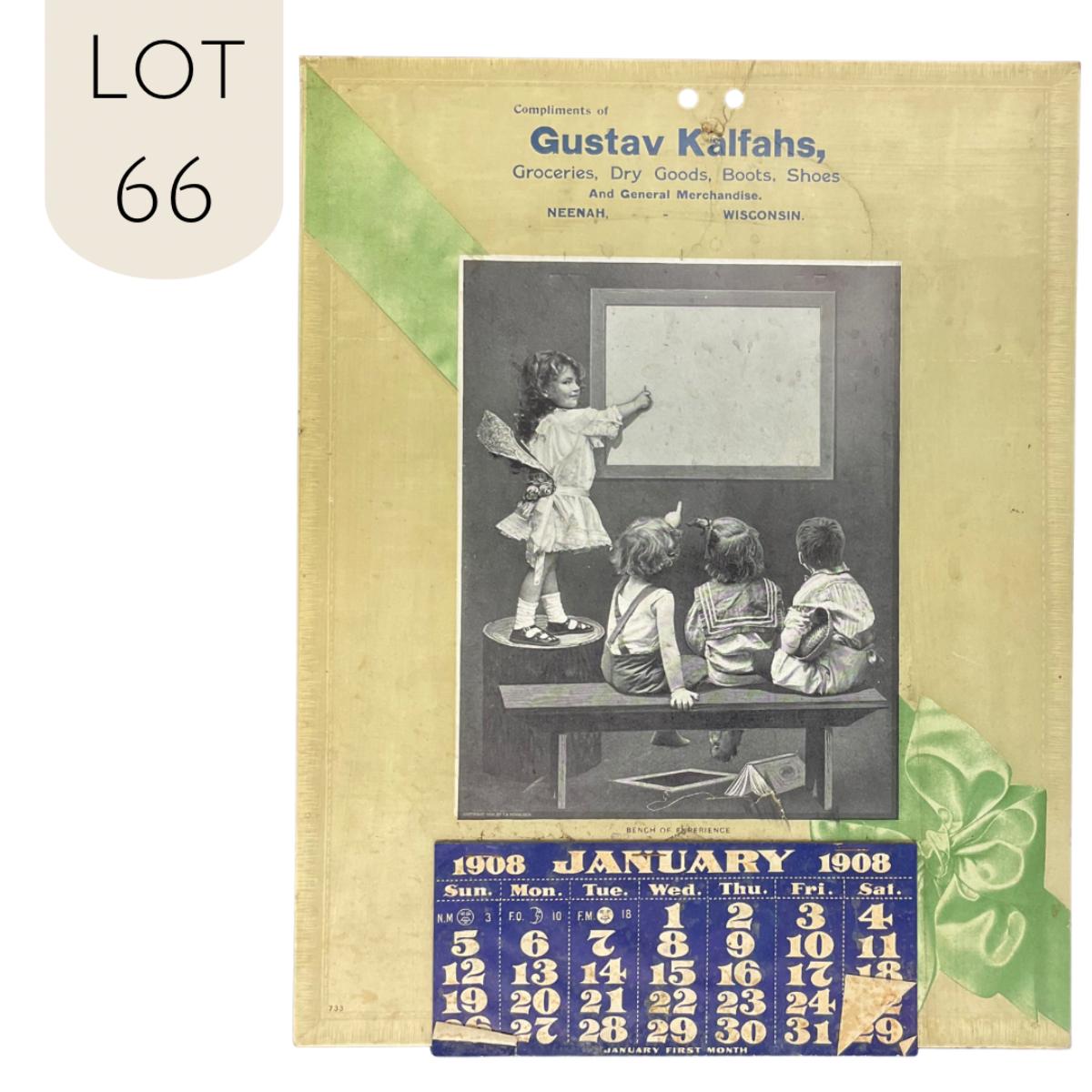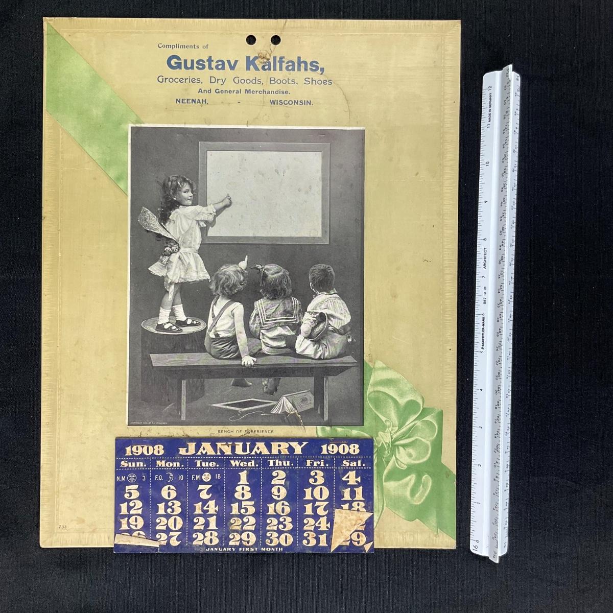 This calendar was compliments of Gustav Kalfahs, merchant of Groceries, Dry Goods, Boots, Shoes and General Merchandise. The shop was located in Neenah, Wisconsin. The calendar is complete, showing January 1908. The calendar features a picture titled "Bench of Experience" original by F A Schneider. It depicts little children being taught by a slightly older girl. The calendar is copyright 1906, FA Schneider. The calendar measures 11" x 14". **|** Please see photos for details and condition. ::: Shipping is available on this lot. If you require shipping you must let us know at the close of the auction. We will coordinate with you after the item has been won. Shipping fees will include insurance up to or exceeding the value of all items being mailed. If you have any questions regarding this lot please contact the auctioneer either via this website, by direct email or by phone. PICK UP TIMES and other important information can be found in the TERMS and DESCRIPTION of the auction. Please take a look for pertinent information. Thanks!