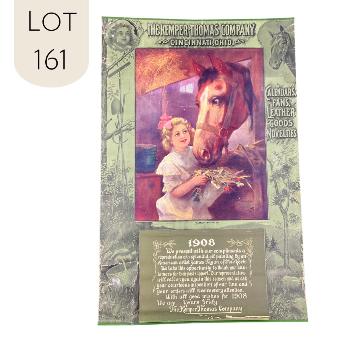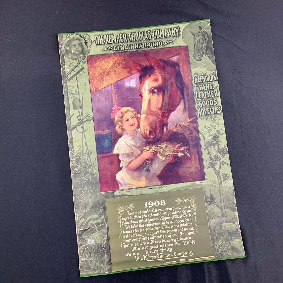 This calendar was courtesy of the Kemper-Thomas Company of Cincinnati, Ohio. The calendar features a picture of a Young Blonde girl feeding a horse in a stall. The Kemper-Thomas Company produced Calendars, Fans, Leather Goods and Novelties. Really, they can do it all - or did. This calendar is complete, including cover. This calendar measures 18” x 27 1/2” . **|** Please see photos for details and condition. ::: Shipping is available on this lot. If you require shipping you must let us know at the close of the auction. We will coordinate with you after the item has been won. Shipping fees will include insurance up to or exceeding the value of all items being mailed. If you have any questions regarding this lot please contact the auctioneer either via this website, by direct email or by phone. PICK UP TIMES and other important information can be found in the TERMS and DESCRIPTION of the auction. Please take a look for pertinent information. Thanks!