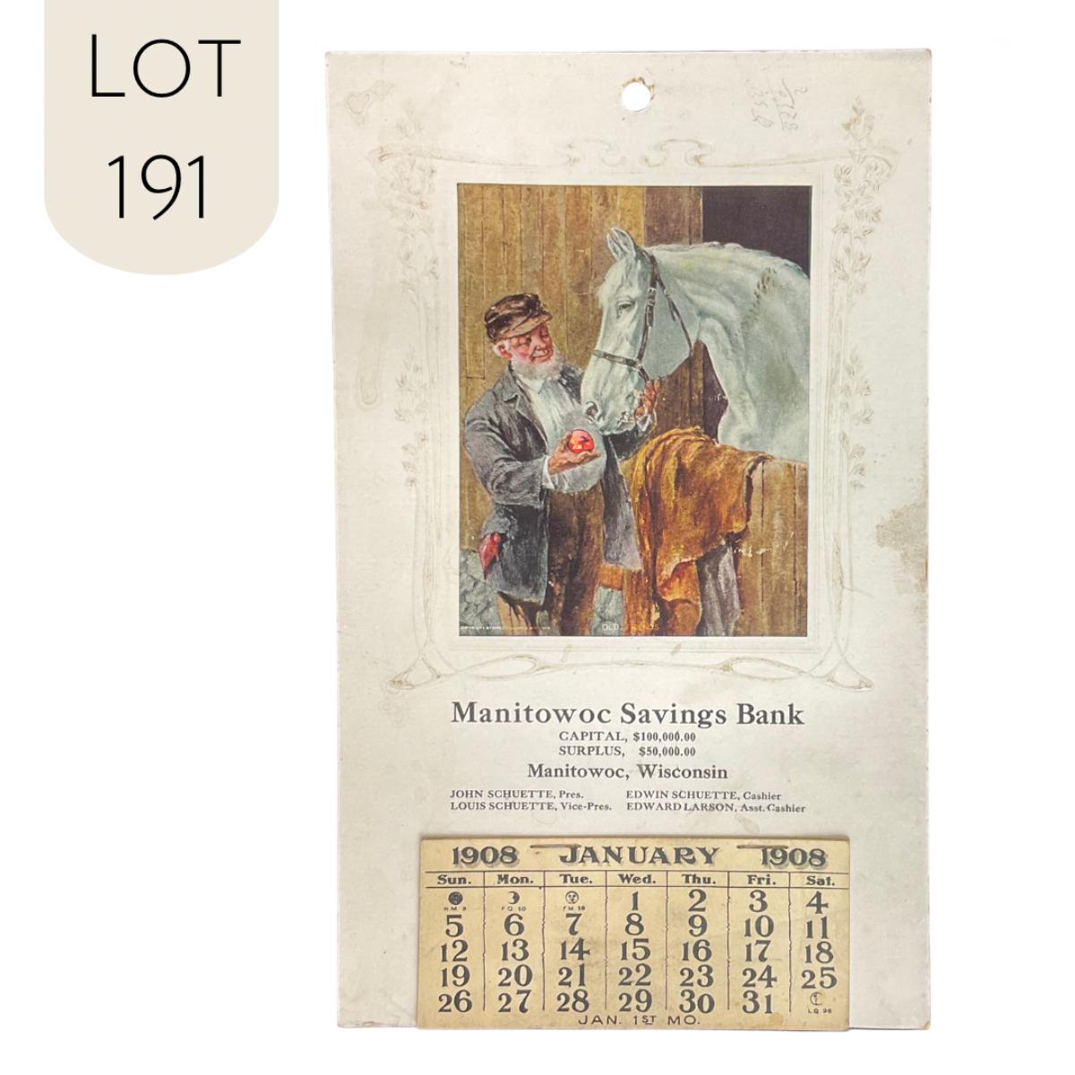 This calendar was produced to promote the Manitowoc Savings Bank of Manitowoc Wisconsin. The calendar features a picture titled "Old Friends" original painting by Chas. Williams, copyright 1906. The picture depicts an older man feeding a horse an apple at a stable. This calendar is complete, showing January 1908. This calendar measures 5 1/2" x 9". **|** Please see photos for details and condition. ::: Shipping is available on this lot. If you require shipping you must let us know at the close of the auction. We will coordinate with you after the item has been won. Shipping fees will include insurance up to or exceeding the value of all items being mailed. If you have any questions regarding this lot please contact the auctioneer either via this website, by direct email or by phone. PICK UP TIMES and other important information can be found in the TERMS and DESCRIPTION of the auction. Please take a look for pertinent information. Thanks!