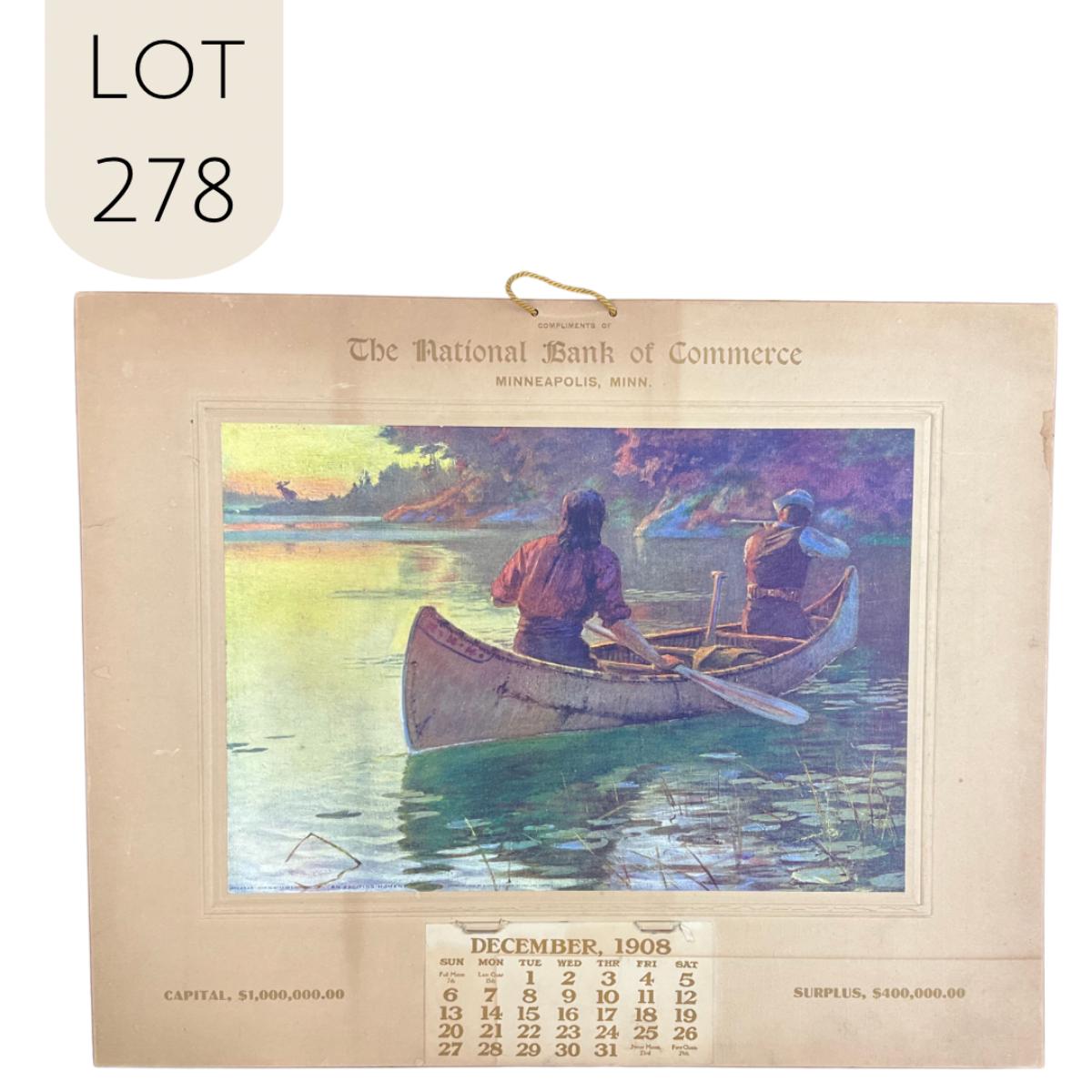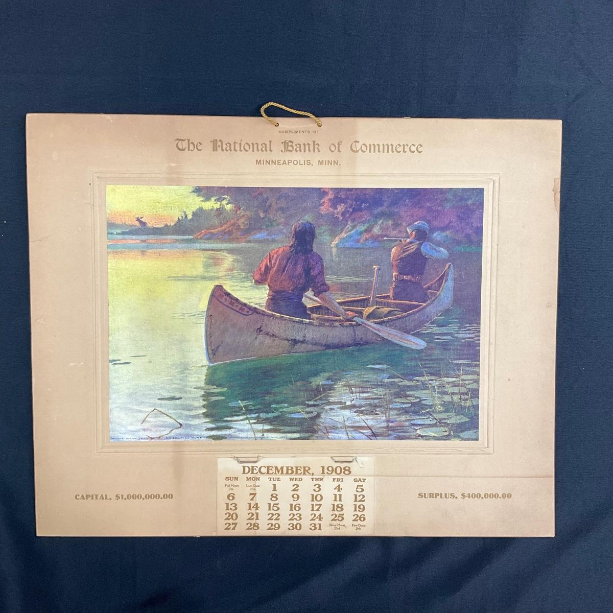 This calendar was compliments of The National Bank of Commerce, located in Minneapolis, Minnesota. This calendar features two men hunting moose (way in the back) while in a Birch Bark Canoe, titled "An Exciting Moment". Original painting by E Potthast, copyright 1906, Brown and Bigelow St. Paul & Toronto. This calendar measures 19 3/4" x 15 3/4". **|** Please see photos for details and condition. ::: Shipping is available on this lot. If you require shipping you must let us know at the close of the auction. We will coordinate with you after the item has been won. Shipping fees will include insurance up to or exceeding the value of all items being mailed. If you have any questions regarding this lot please contact the auctioneer either via this website, by direct email or by phone. PICK UP TIMES and other important information can be found in the TERMS and DESCRIPTION of the auction. Please take a look for pertinent information. Thanks!
