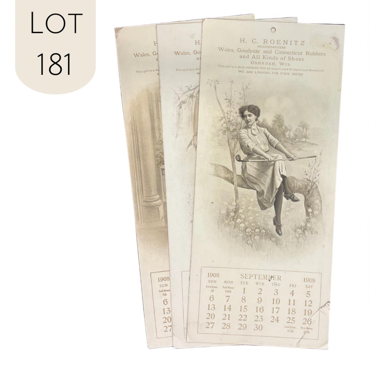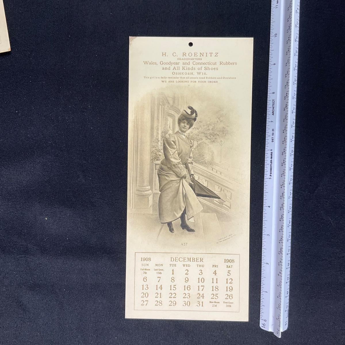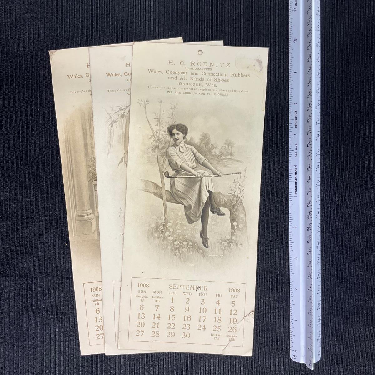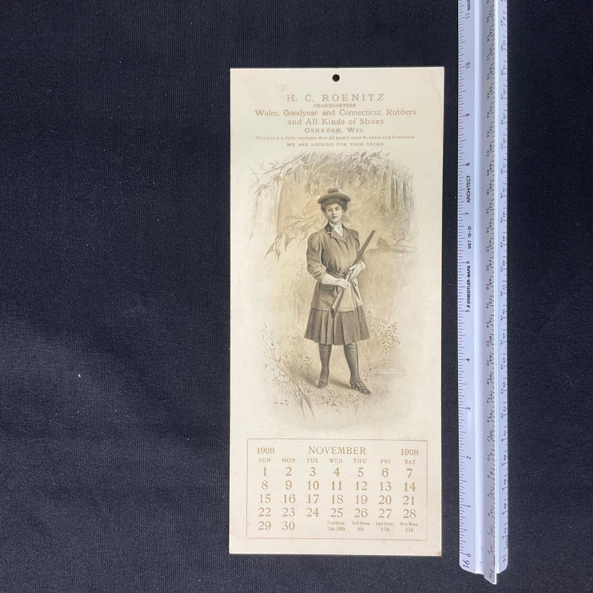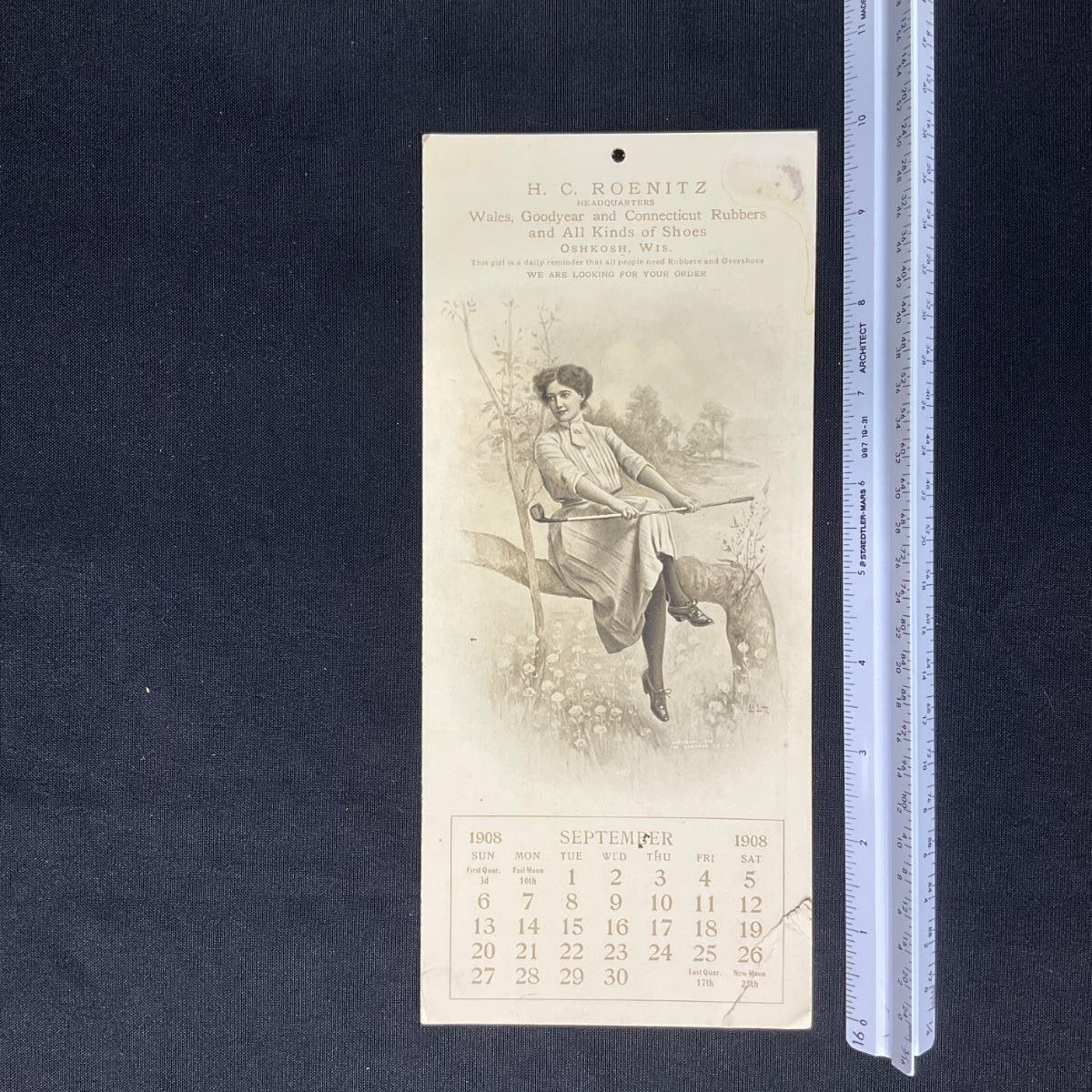 This monthly calendar was produced by the Osbourne Company of New York. Each page features advertising for H C Roenitz of Oshkosh, WI, a shoe manufacturer. They carried Wales Goodyear and Connecticut Rubbers. This calendar is incomplete, with only 3 months, September, November and December. Each one would be worth framing IMHO. Each calendar page measures 4 3/8" x 10". **|** Please see photos for details and condition. ::: Shipping is available on this lot. If you require shipping you must let us know at the close of the auction. We will coordinate with you after the item has been won. Shipping fees will include insurance up to or exceeding the value of all items being mailed. If you have any questions regarding this lot please contact the auctioneer either via this website, by direct email or by phone. PICK UP TIMES and other important information can be found in the TERMS and DESCRIPTION of the auction. Please take a look for pertinent information. Thanks!